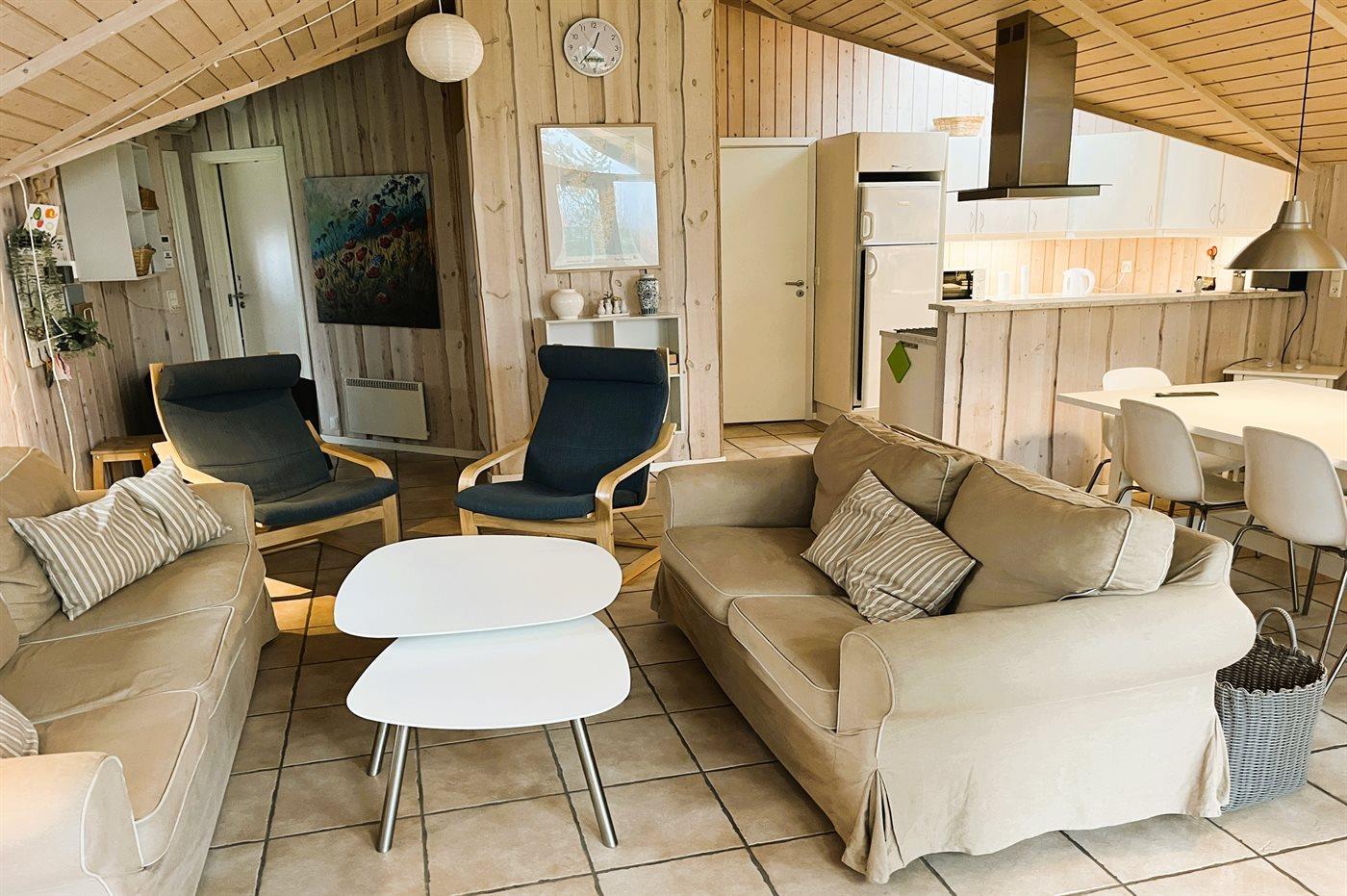 Huset er lyst og hyggeligt indrettet og har 4 regulære soveværelser og 2 badeværelser. Hjertet af huset er det store køkkenalrum, hvorfra der er udgang til stor delvist overdækket sydvest-vendt terrasse.