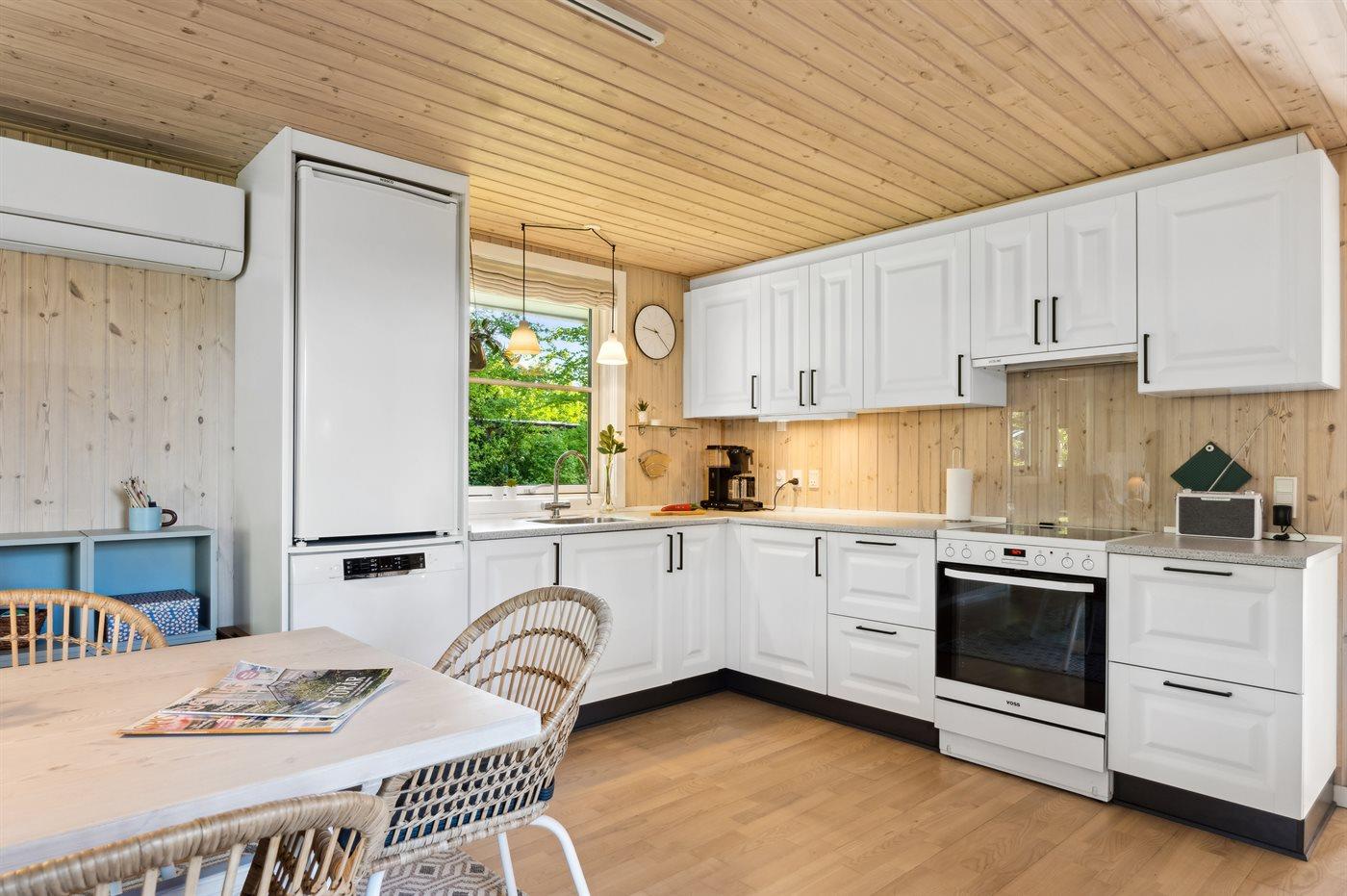 Køkkenet er udstyret med 1 køleskab. Der er 4 elkogeplader, varmluftovn samt opvaskemaskine.