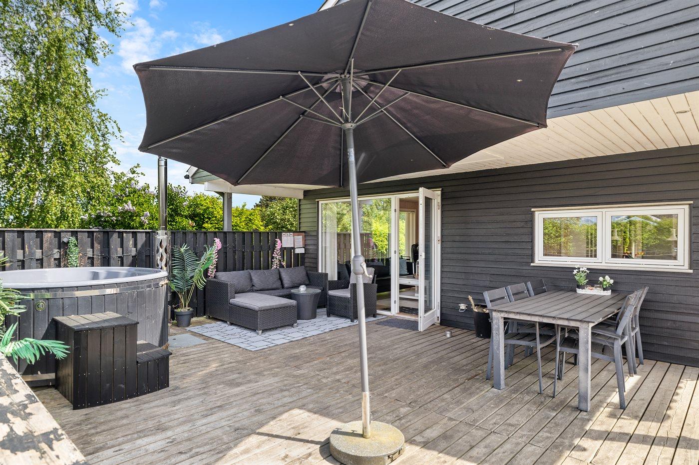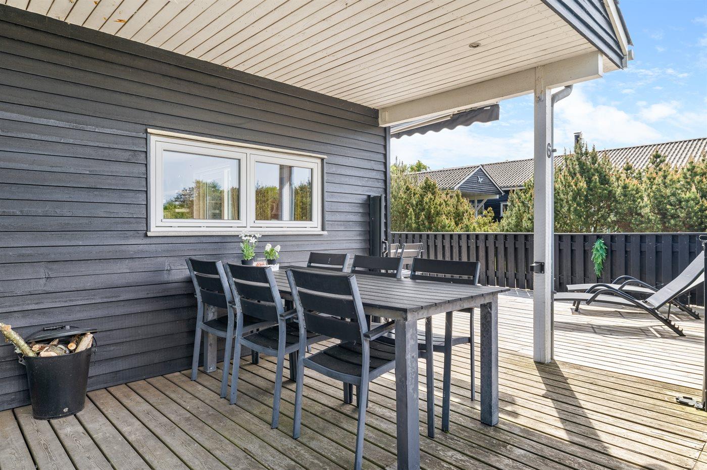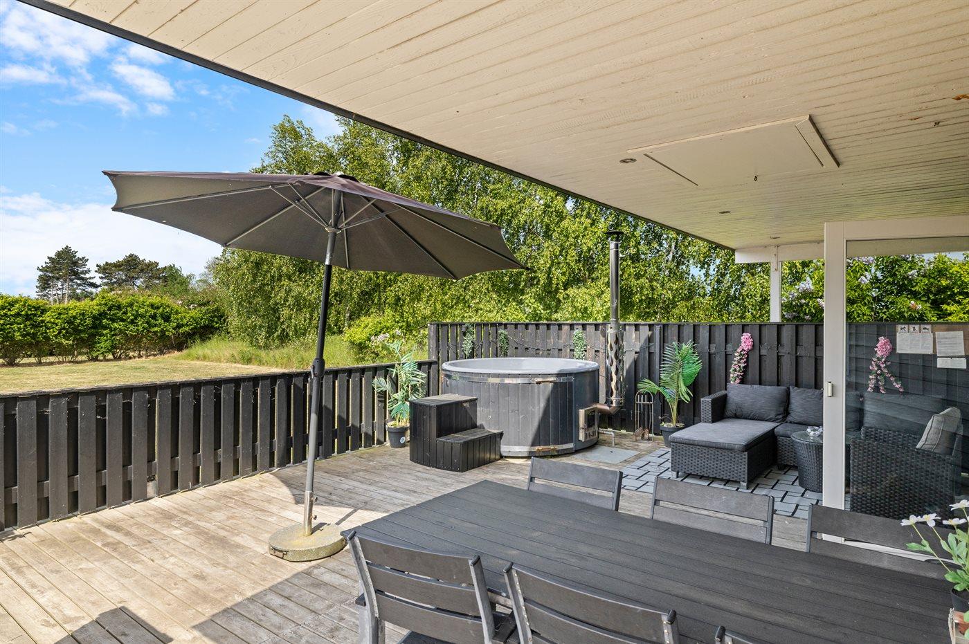 Feriehuset er i flot stand, og der er god plads både inde og ude. Udenfor er der flere gode terrasser, hvoraf en del af den sydvestvendte terrasse er overdækket, et stort 5 personers vildmarksbad og bag huset en legeplads med flere aktiviteter.