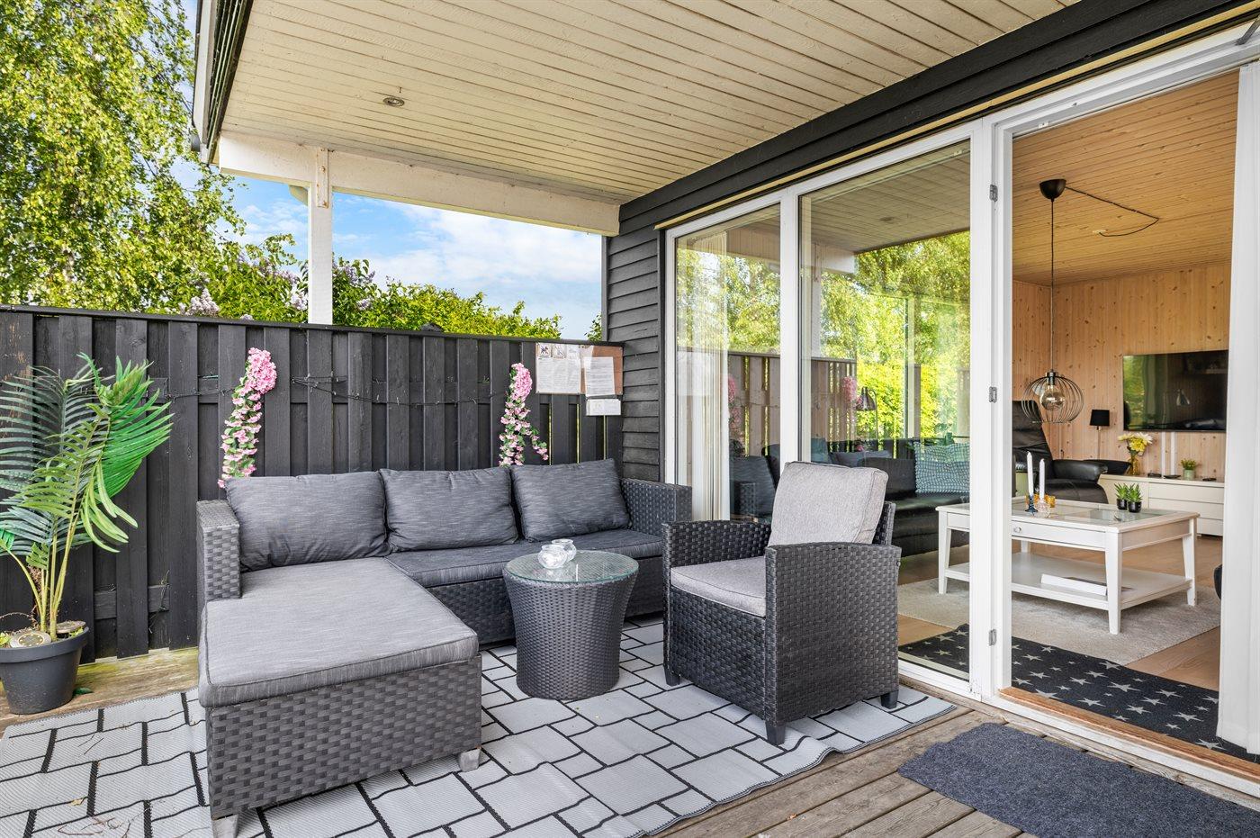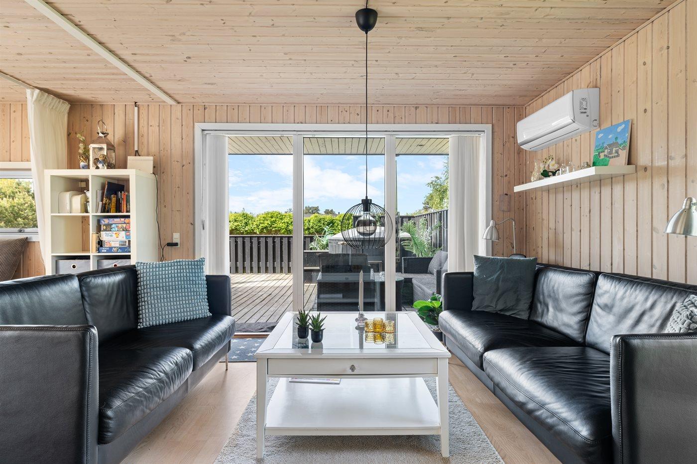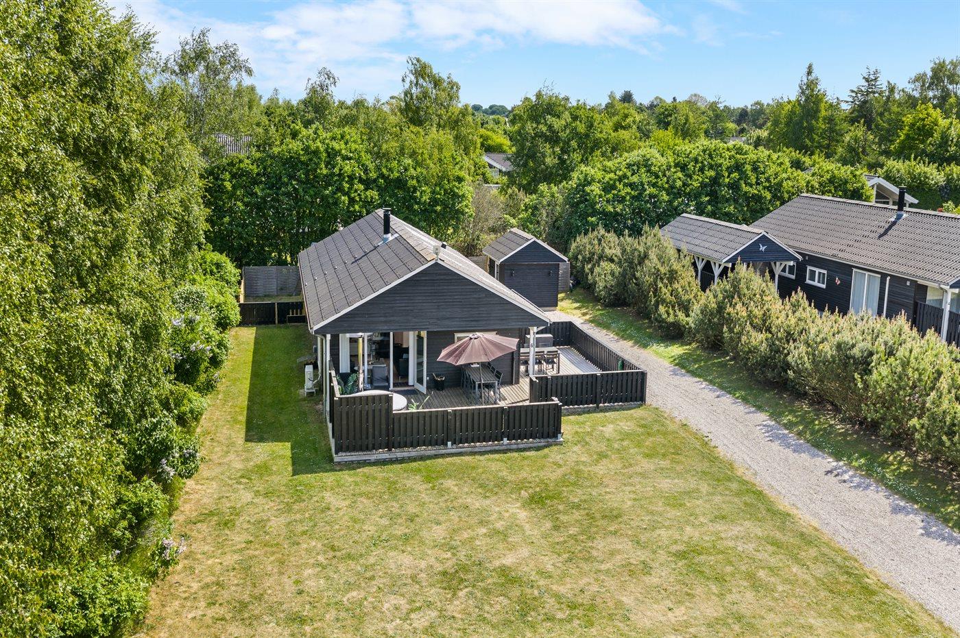 Feriehuset er i flot stand, og der er god plads både inde og ude. Udenfor er der flere gode terrasser, hvoraf en del af den sydvestvendte terrasse er overdækket, et stort 5 personers vildmarksbad og bag huset en legeplads med flere aktiviteter.