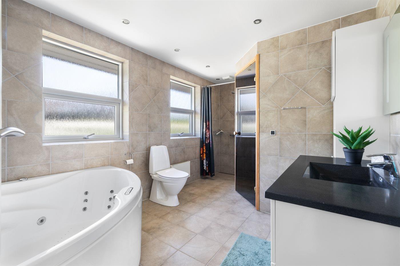 Der er 2 badeværelser med bruseniche og 2 toiletter. Der er gulvvarme på 2 badeværelser. I saunaen er der mulighed for afslapning.
