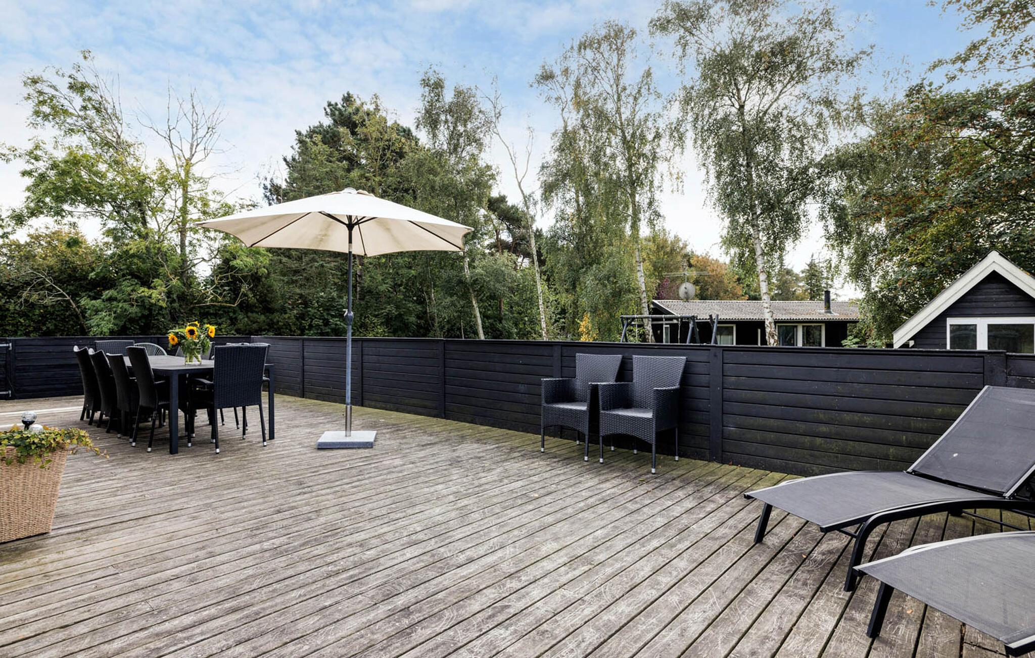 Udendørs er der også tænkt på alt. En flot, bred terrasse giver jer nemlig mulighed for at spise ude eller slappe af på solsengene. Men I kan også nyde den friske luft i skyggen, hvis I foretrækker det på en varm dag.