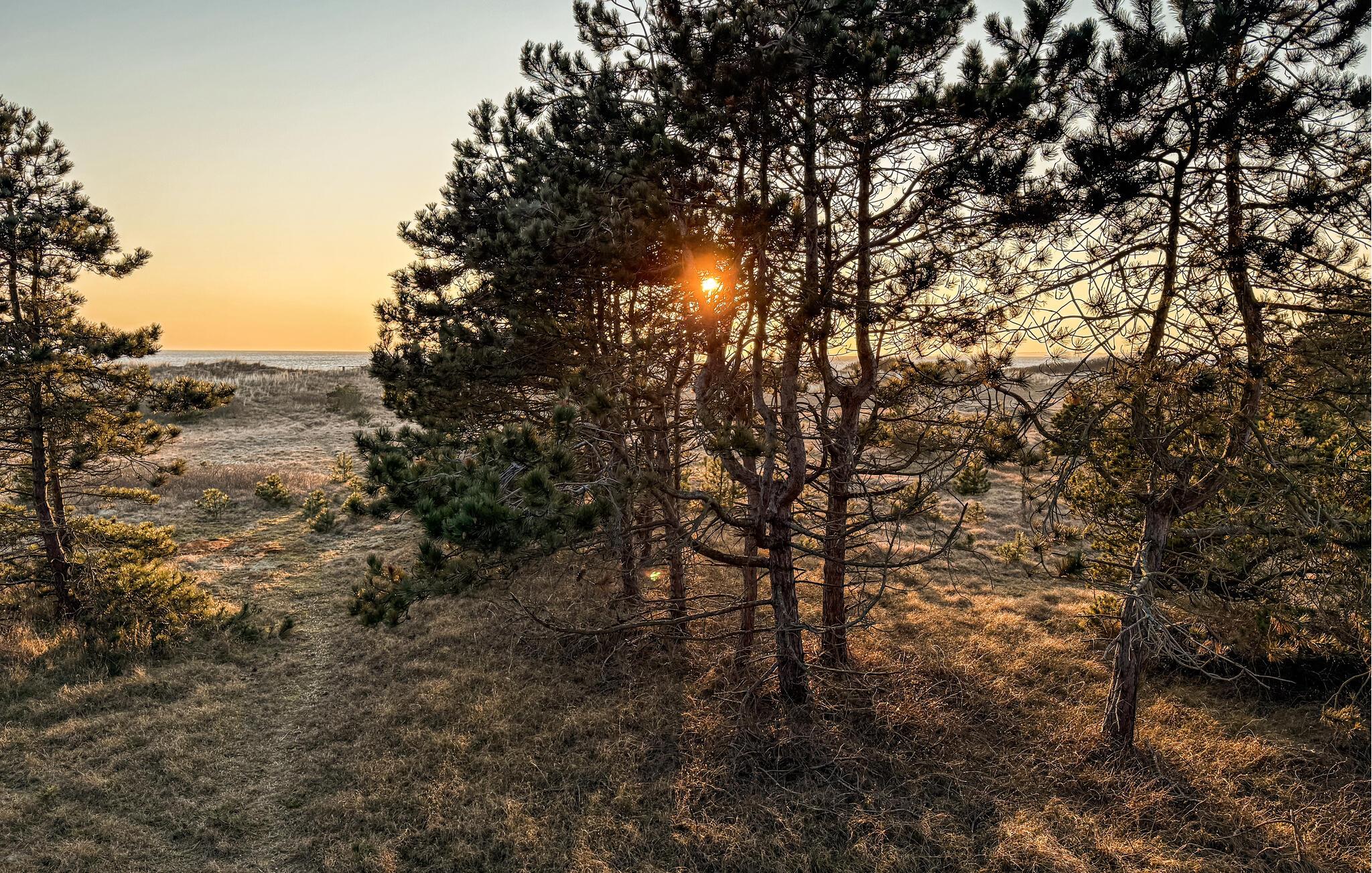 Gå også ud på altanen. Herfra har I en smuk udsigt hele vejen til havet. Begynd dagene med morgenmad på terrassen foran hoveddøren og lyt til vindens susen i træerne. Det rummelige naturområde byder på masser af plads til at lege, solbade eller holde picnic. Udnyt den rolige beliggenhed til at lægge hverdagen bag jer.