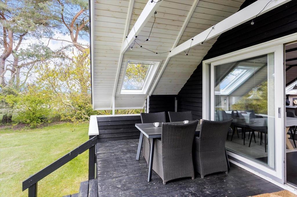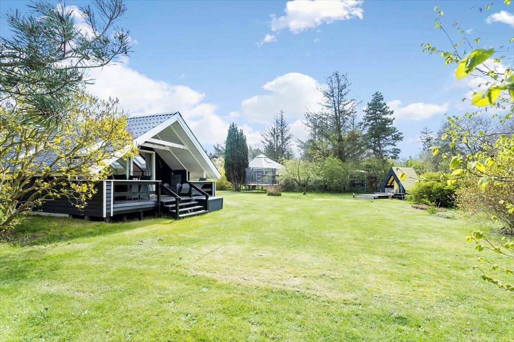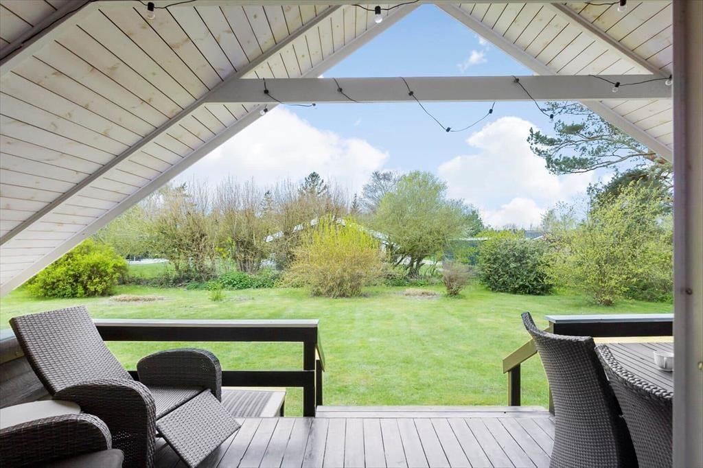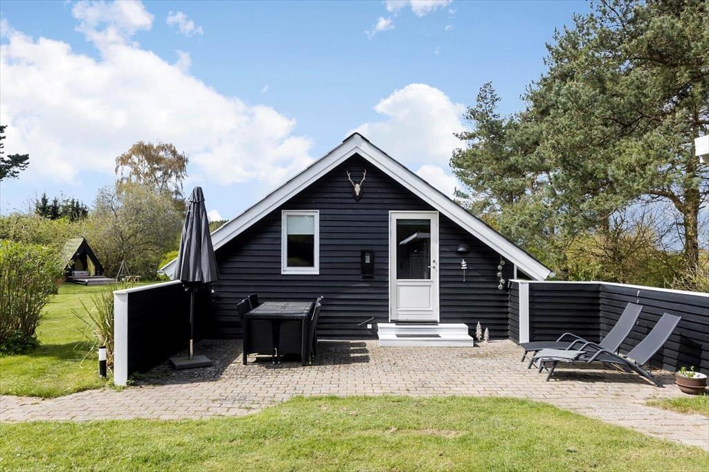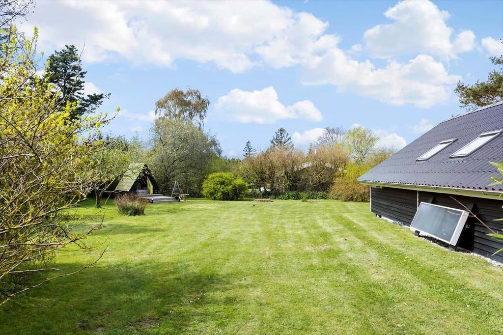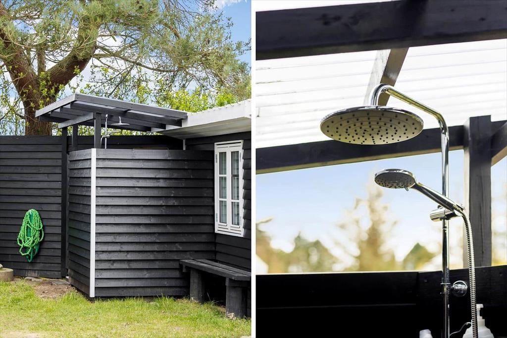 På begge sider af sommerhus er der dejlige terrasser, så når solen lokker dig udenfor, skal du vælge, om du vil sidde mod øst eller vest. På østterrassen kan du sidde under åben himmel, men dog lidt skærmet af et læhegn, mens terrassen mod vest er overdækket og har et fint kig ud over den grønne have. Ved shelteret er der også en hyggelig opholdsplads – endda med et lille bålsted – og takket være udebruseren kan selv morgenbadet foregå her i havens grønne omgivelser. Til børnene står der en trampolin, og græsplænen passer perfekt til vikingespil og andre sjove havelege.