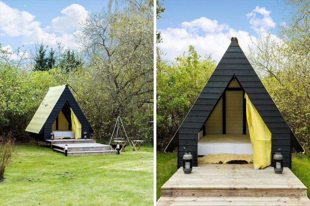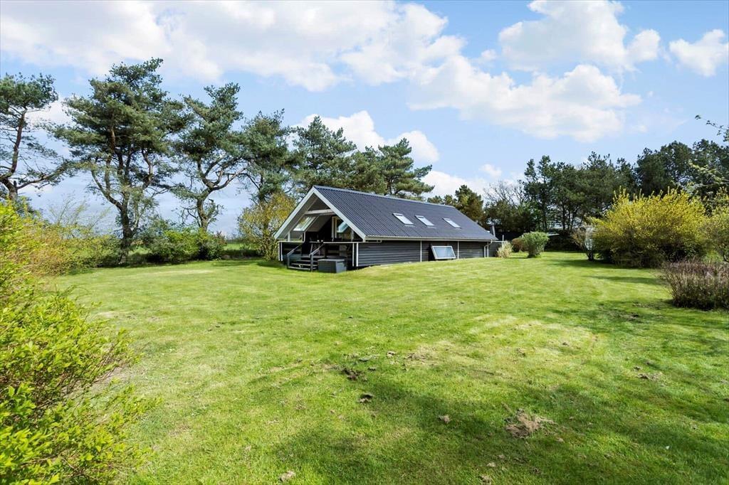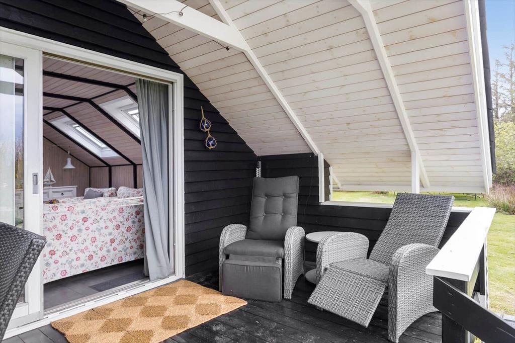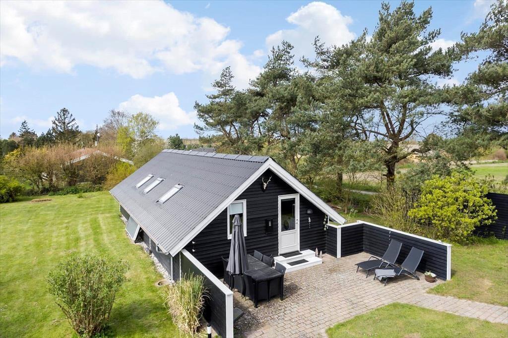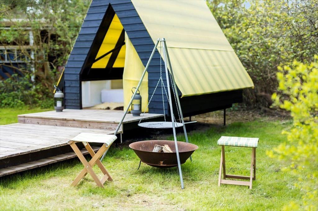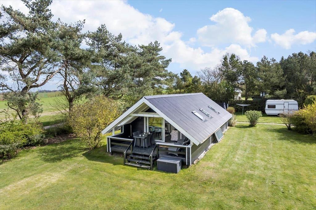 På begge sider af sommerhus er der dejlige terrasser, så når solen lokker dig udenfor, skal du vælge, om du vil sidde mod øst eller vest. På østterrassen kan du sidde under åben himmel, men dog lidt skærmet af et læhegn, mens terrassen mod vest er overdækket og har et fint kig ud over den grønne have. Ved shelteret er der også en hyggelig opholdsplads – endda med et lille bålsted – og takket være udebruseren kan selv morgenbadet foregå her i havens grønne omgivelser. Til børnene står der en trampolin, og græsplænen passer perfekt til vikingespil og andre sjove havelege.