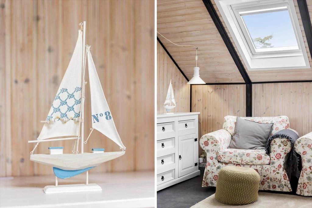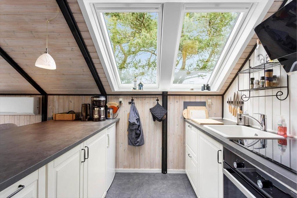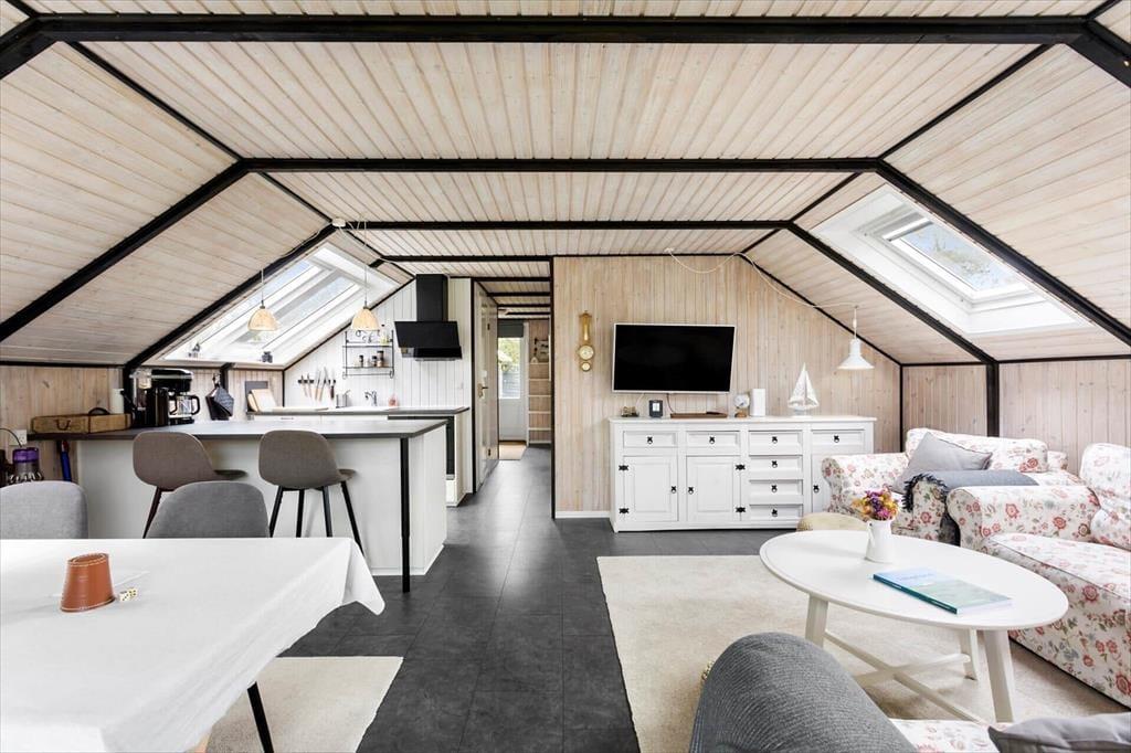 Efter seneste renovering, der fandt sted i 2023, fremstår huset lyst og velholdt både ude og inde. De lyse trævægge og skrå lofter giver rummene en særligt rar sommerhusstemning, mens de mange ovenlysvinduer sørger for et godt lysindfald – og for udsigt til stjernehimlen på skyfri nætter. Med en planløsning, der inkluderer to soveværelser og et badeværelse, passer huset godt til fire personer, og en hund er også velkommen, hvis du gerne vil have det firbenede familiemedlem med på ferie. Husets samlingspunkt er selvfølgelig stuen, der er hyggeligt indrettet med komfortabelt møblement, fladskærms-tv og åben køkkenafdeling.