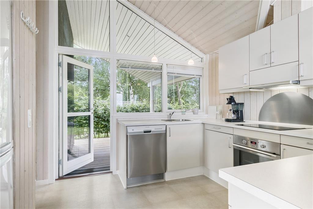 Køkken med keramisk komfur, bageovn, kogeplader, køleskab, fryser og opvaskemaskine.