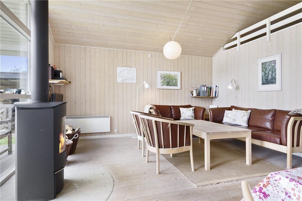 Stue med udsigt over vandet, brændeovn, Tv med danske kanaler og radio.