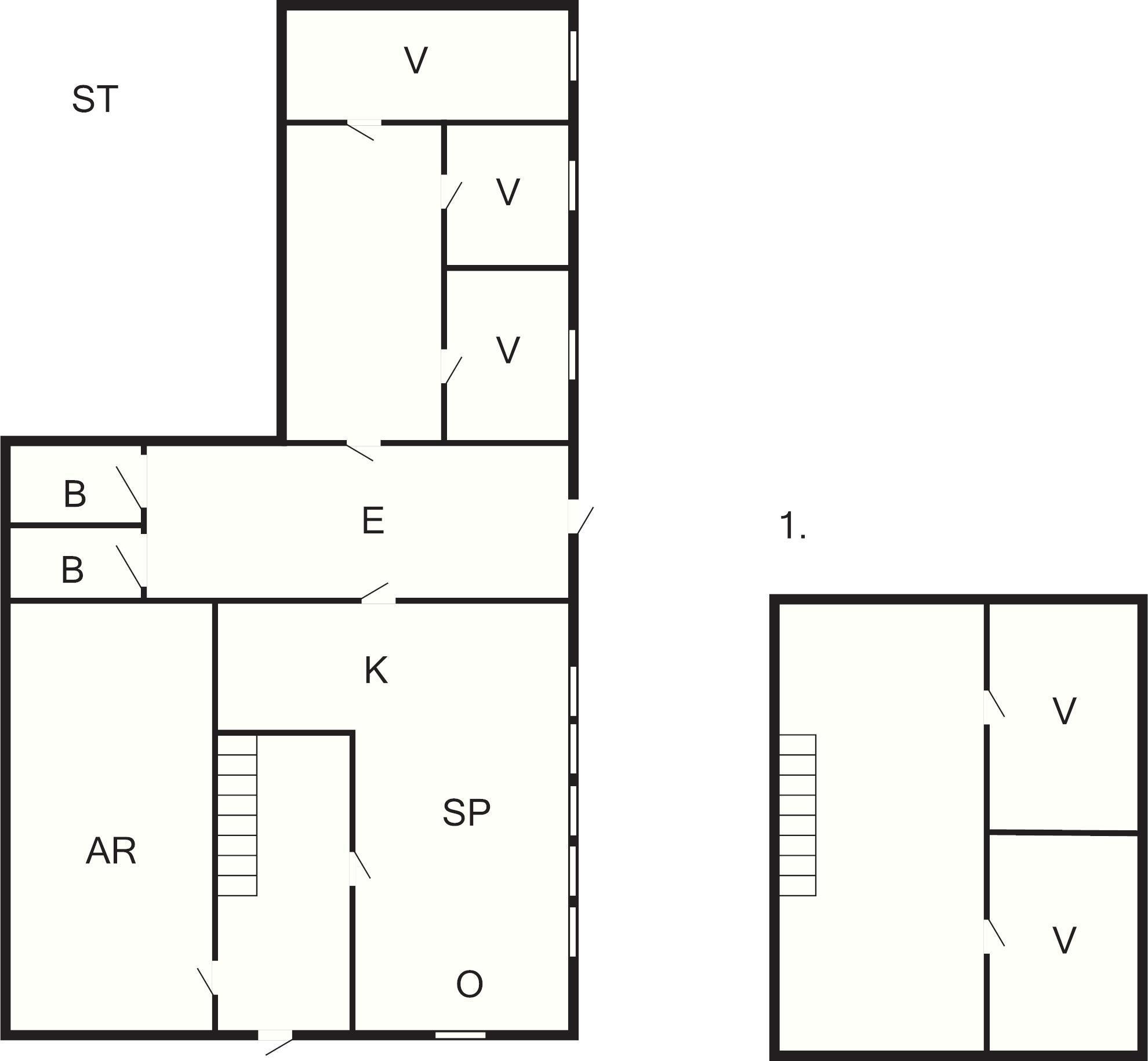 På 1. sal er der fem sovepladser fordelt på to soveværelser. Stueplan har syv enkeltsenge fordelt på tre soveværelser.