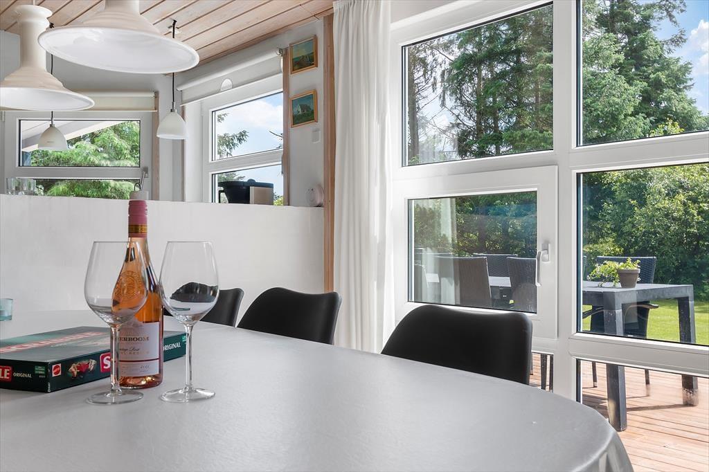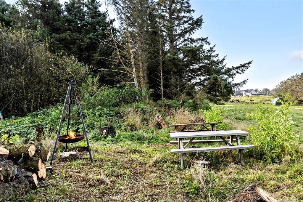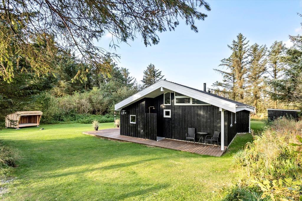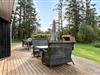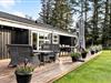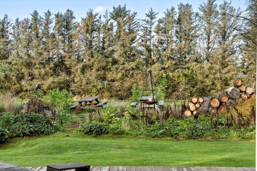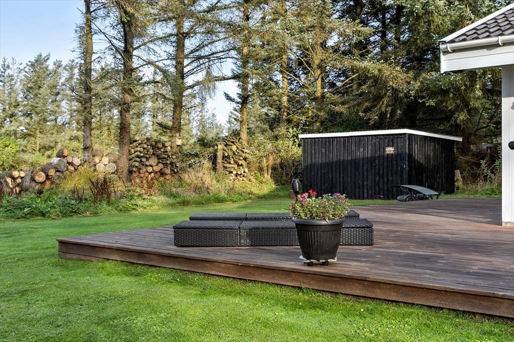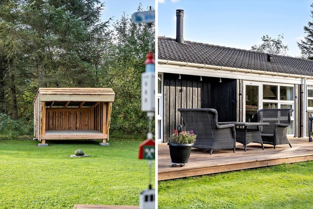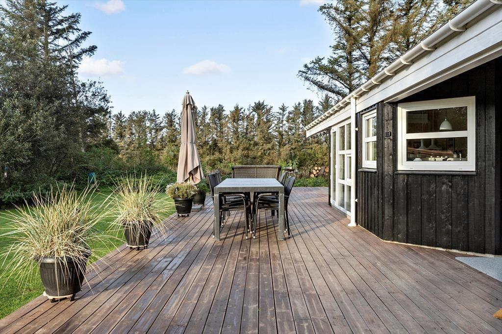 Fra stuen har I direkte adgang til en stor træterrasse, så driverlivet kan nemt flyttes ud i det fri, når vejret er til det. Solforholdene er gode, og der er havemøbler, liggestole, parasol og en grill til rådighed, så I har et glimrende udgangspunkt for at slappe af og nyde ferien under åben himmel. På grunden er der for øvrigt en god græsplæne at lege på, og randbeplantningen skærmer hele herligheden godt af.