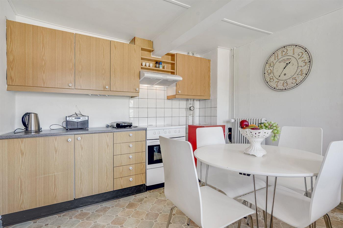 Køkkenet er udstyret med 1 køleskab. Der er 4 keramiske kogeplader, bageovn samt opvaskemaskine.