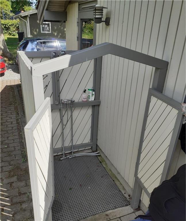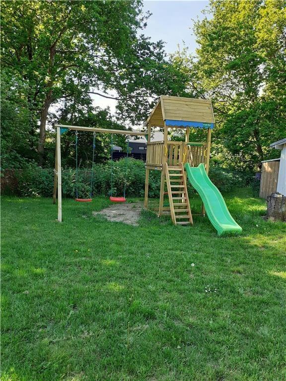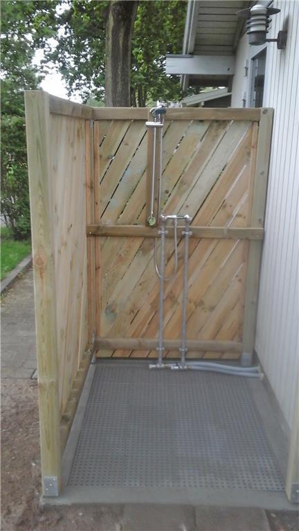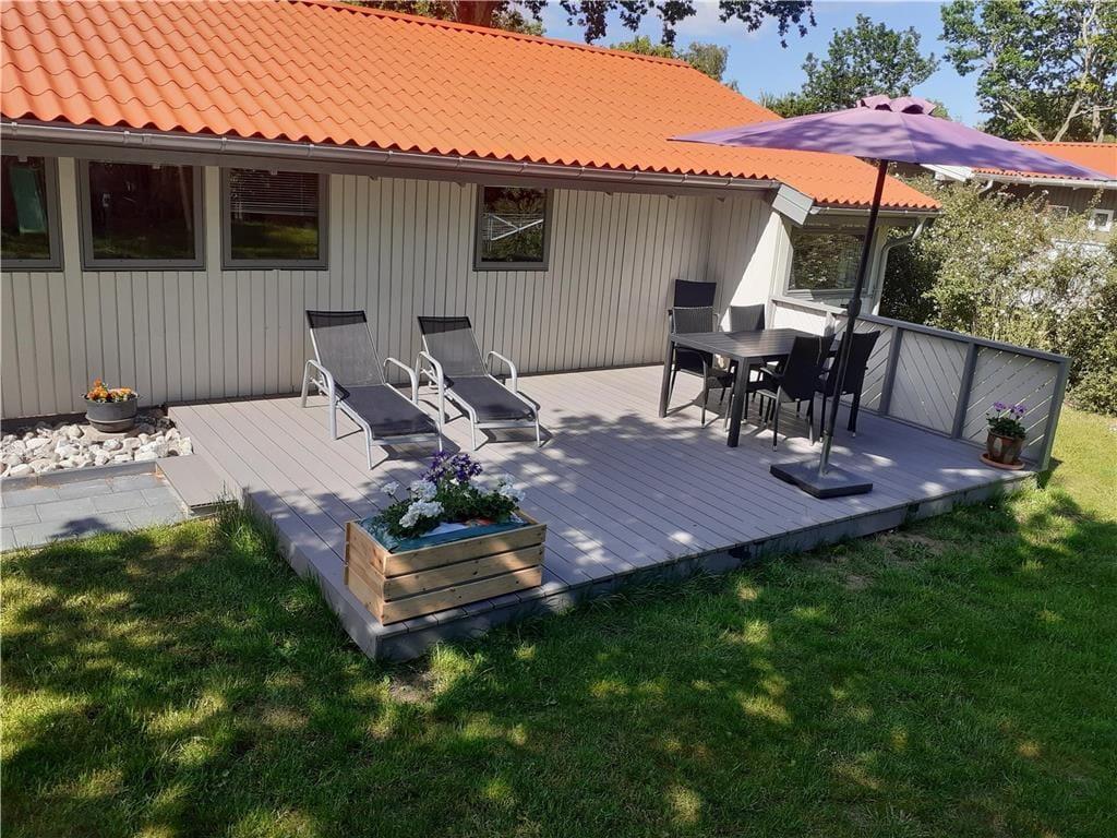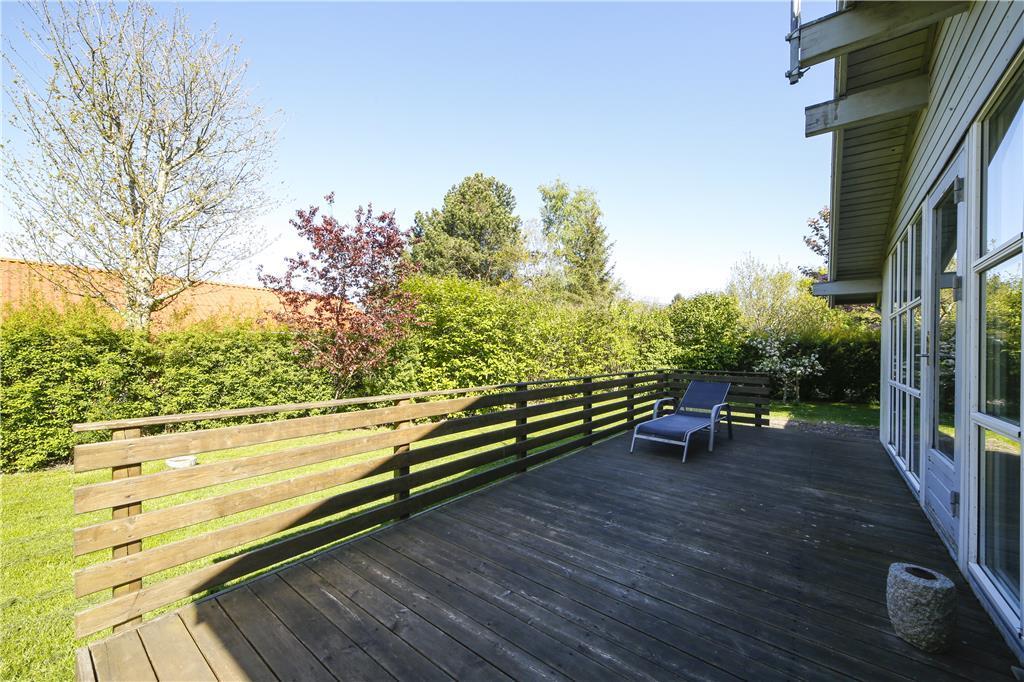 I haven er der store træer som giver læ og skygge på dele af den store grønne plæne. Der er flere terrasser til sommerhuset, så man kan altid finde et passende sted at sidde alt efter hvor solen er. Udendørs bruser med varmt og koldt vand.