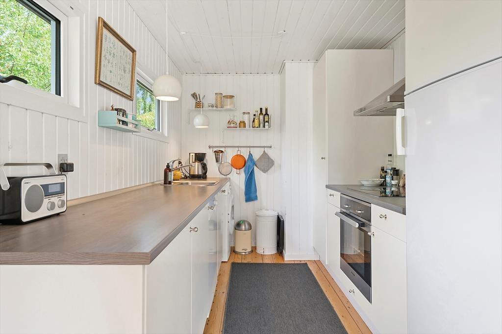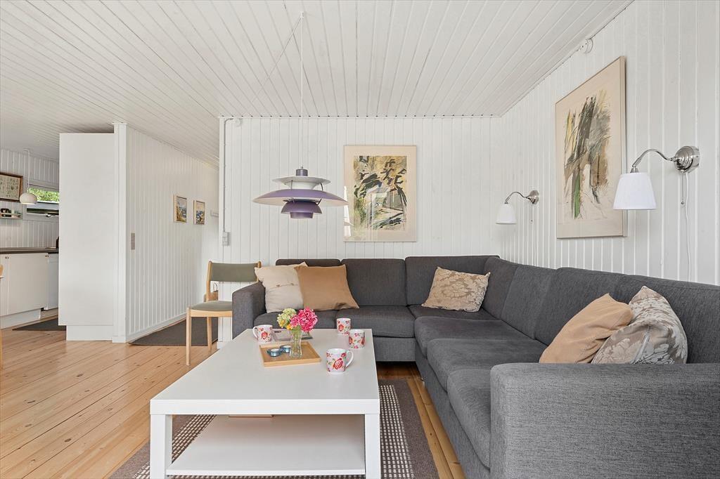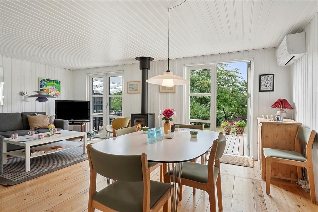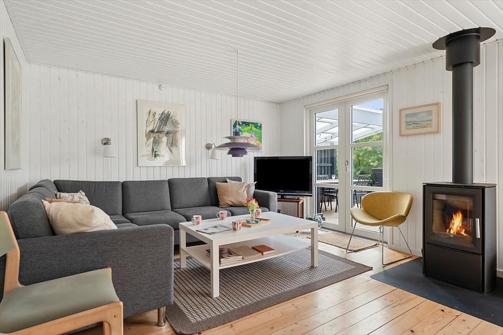 Hyggeligt og renoveret sommerhus indrettet i lys og indbydende stil. Her føler man sig straks godt tilpas. God indretning med en smagfuld indrettet stue med spiseplads, skøn sofa og med brændeovn. Der er TV med Chromecast og internet - hastighed 100/100.
