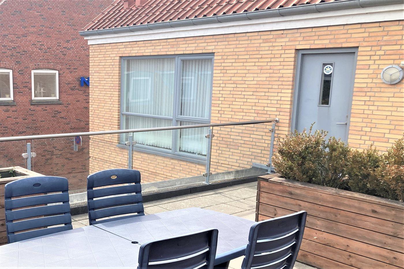 Lys og moderne ferielejlighed i hjertet af historiske Rudkøbing med terrasse nær havet og butik.