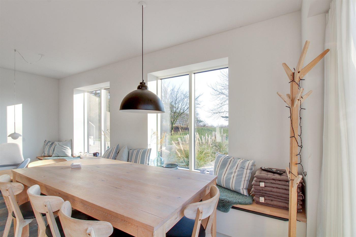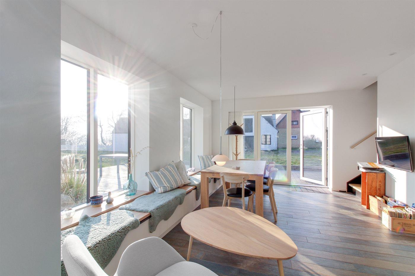 I en arkitekttegnet ejendom bestående af 3 små sammenbyggede fiskerhuse, udlejes denne selvstændige 4- værelses ferielejlighed på 130 m2 i 2 plan, færdigbygget i 2016. Fra lejligheden er der direkte havudsigt og den fantastiske børnevenlige sandstrand ligger for enden af grunden. Ferielejligheden har egen strandterrasse ca. 20 meter fra vandet, samt egen stor solterrasse uden for ferielejligheden, med grill- og spiseplads for 8 pers.