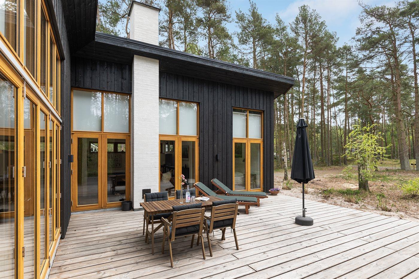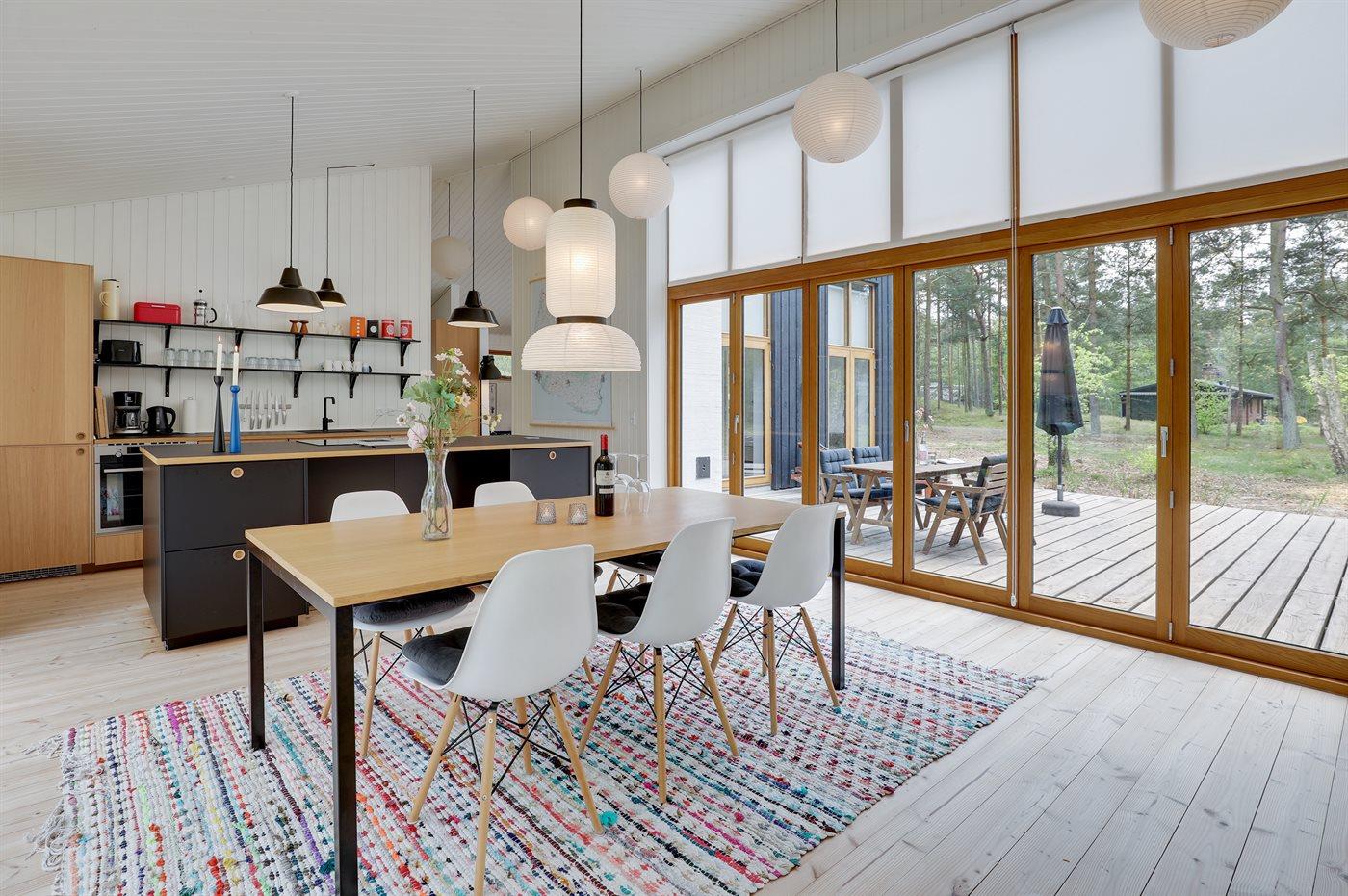 Arkitekttegnet og helt nyt sommerhus fra 2021 beliggende nær populær sandstrand i et naturskønt feriehusområde. Grunden er omgivet af mange høje træer, og til huset hører en ugenert terrasse med afskærmning ud mod et naturområde.