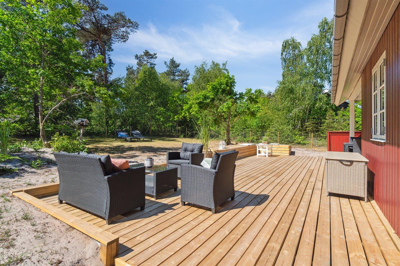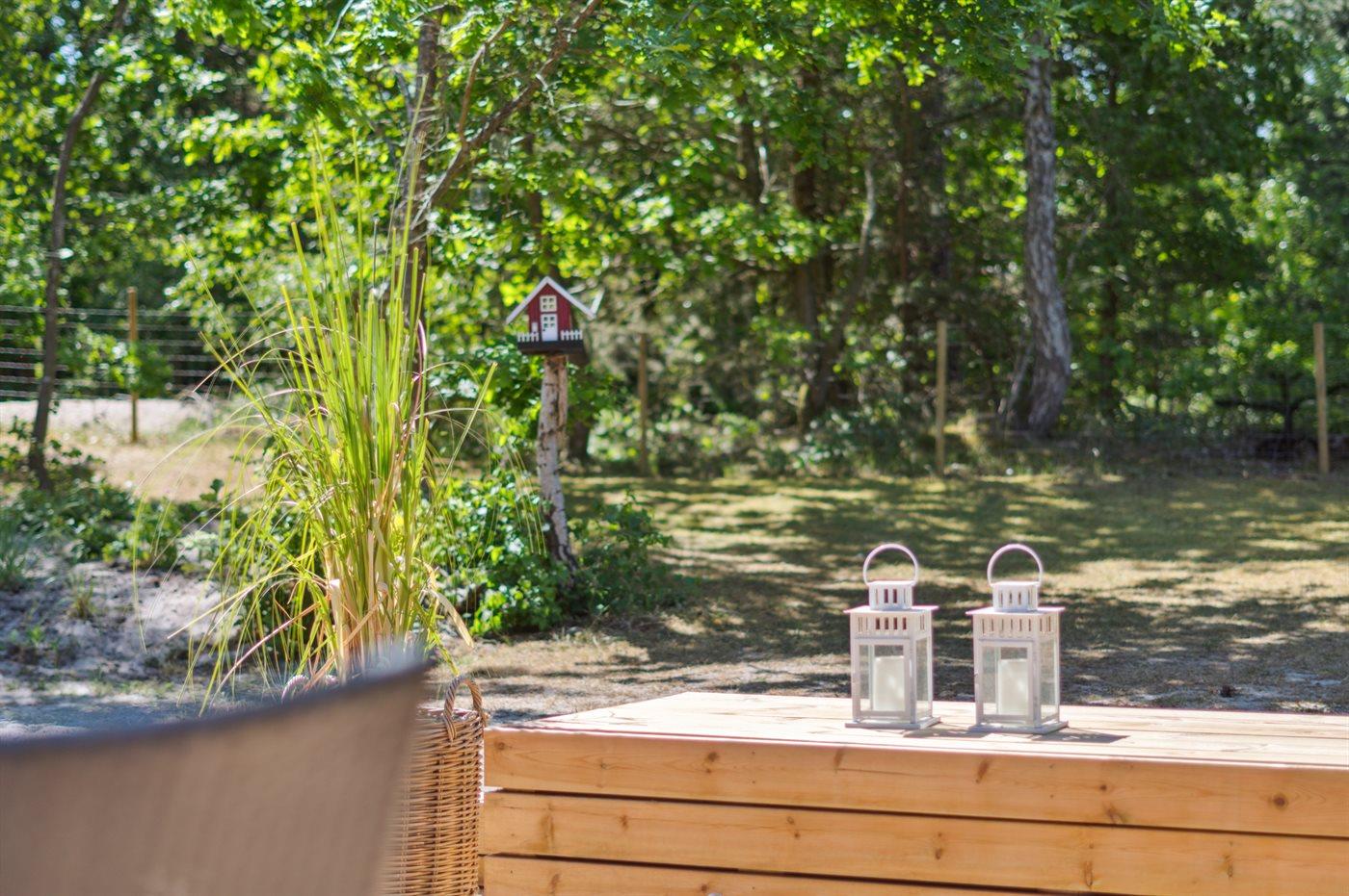 Ferieboligen er beliggende på en 1194 m² stor naturgrund. Der er 350 m til havet. Nærmeste forretning er beliggende i en afstand af 3000 m. Der er en golfbane i en afstand af 4500 m. Til ferieboligen hører 60 m² terrasseareal. Desuden er der 14 m² overdækket terrasse. Grill til rådighed. Der er installeret stik til opladning af elbil. Type 2 stik. Parkering ved ferieboligen.