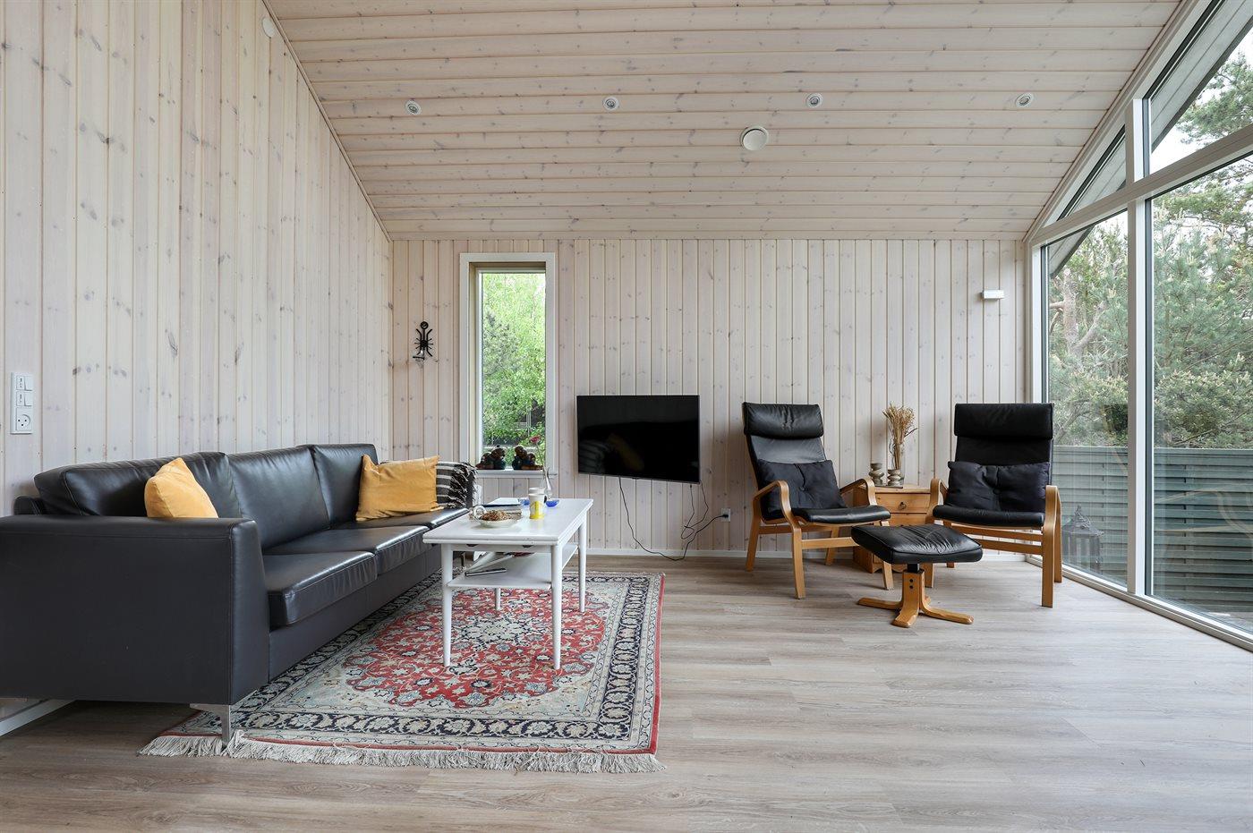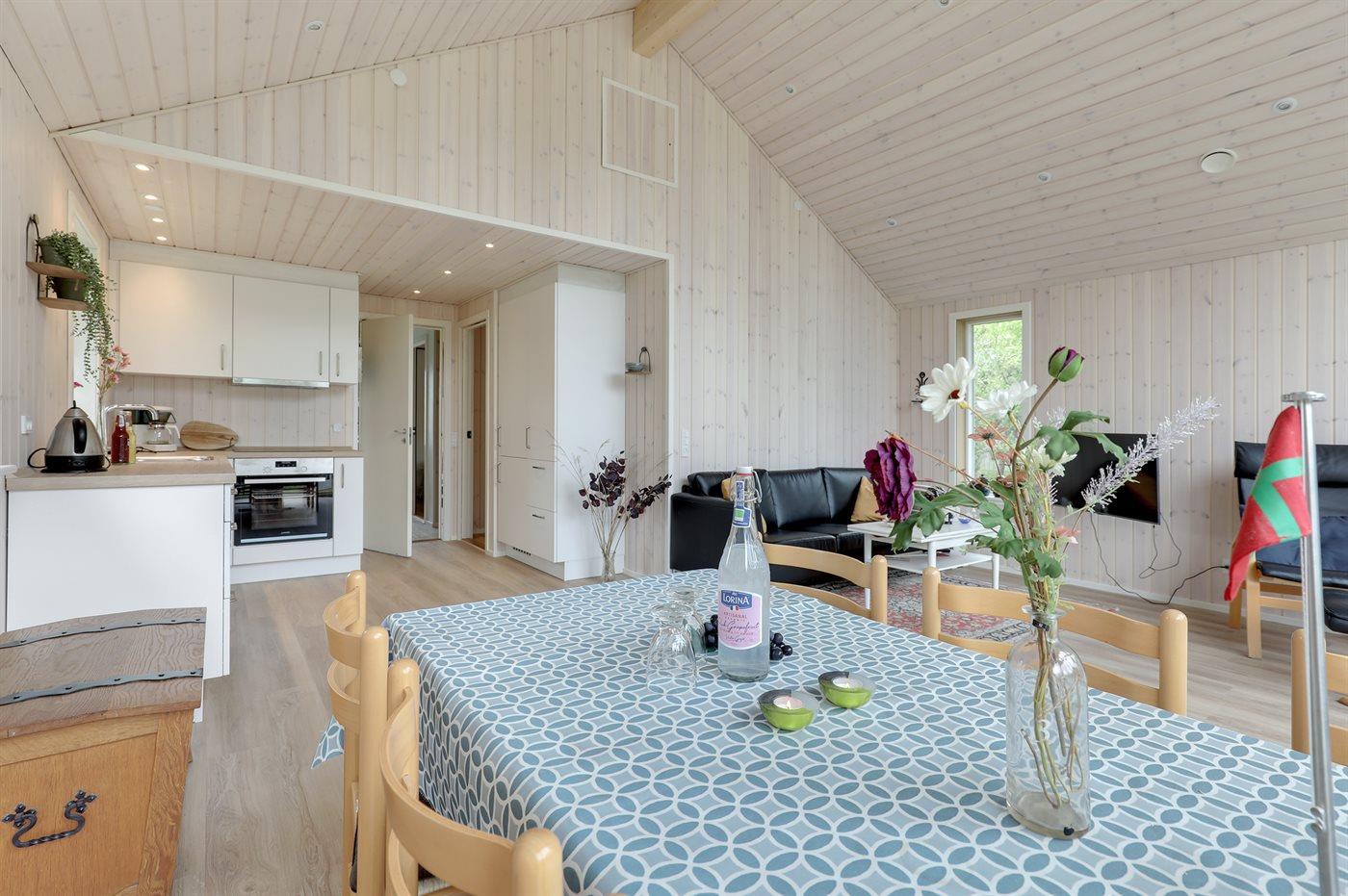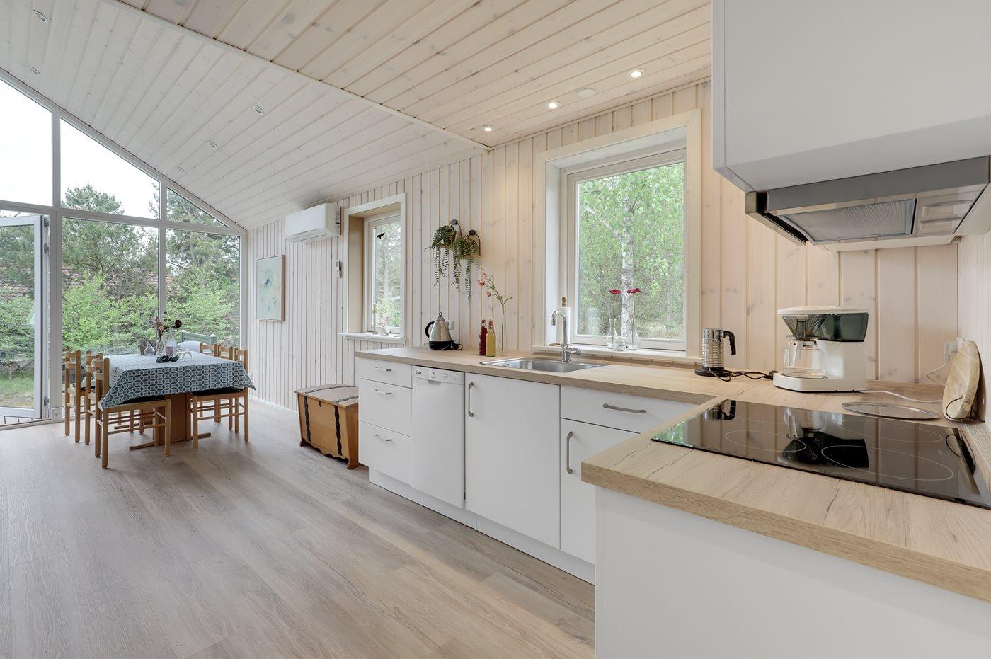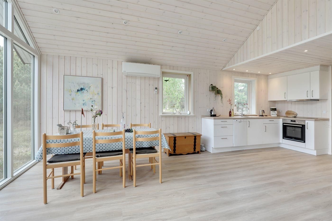 Velbeliggende feriehus - moderniseret i 2022 med nye lyse trægulve, køkkenafdeling og udvidelse af stue med lyse vægge og loft i kip. De store panoramavinduer i stuen går helt op i kip og giver virkelig en god fornemmelse af vejrliget og naturen op til huset.