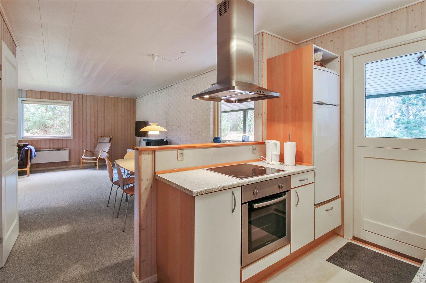 Køkkenet er udstyret med 1 køleskab. Der er 4 keramiske kogeplader, varmluftovn samt opvaskemaskine.