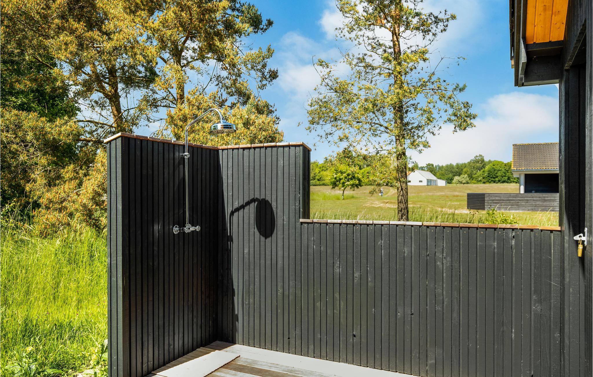 Også udvendigt imponerer huset. Den store træterrasse indbyder til udendørsspisning, mange timers solbadning og hyggelige grillaftener. Huset ligger på en åben grund med god plads til leg, boldspil og udendørsspil.