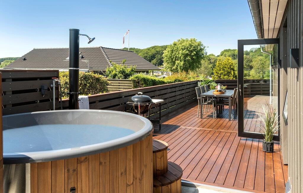 Tag et beroligende bad i vildmarksbadet eller nyd solen på de komfortable lænestole. Dæk bordet på træterrassen og tilbered aftensmaden ved grillen. Terrassen er indhegnet og giver jer både privatliv og beskyttelse, ideel for børnefamilier.