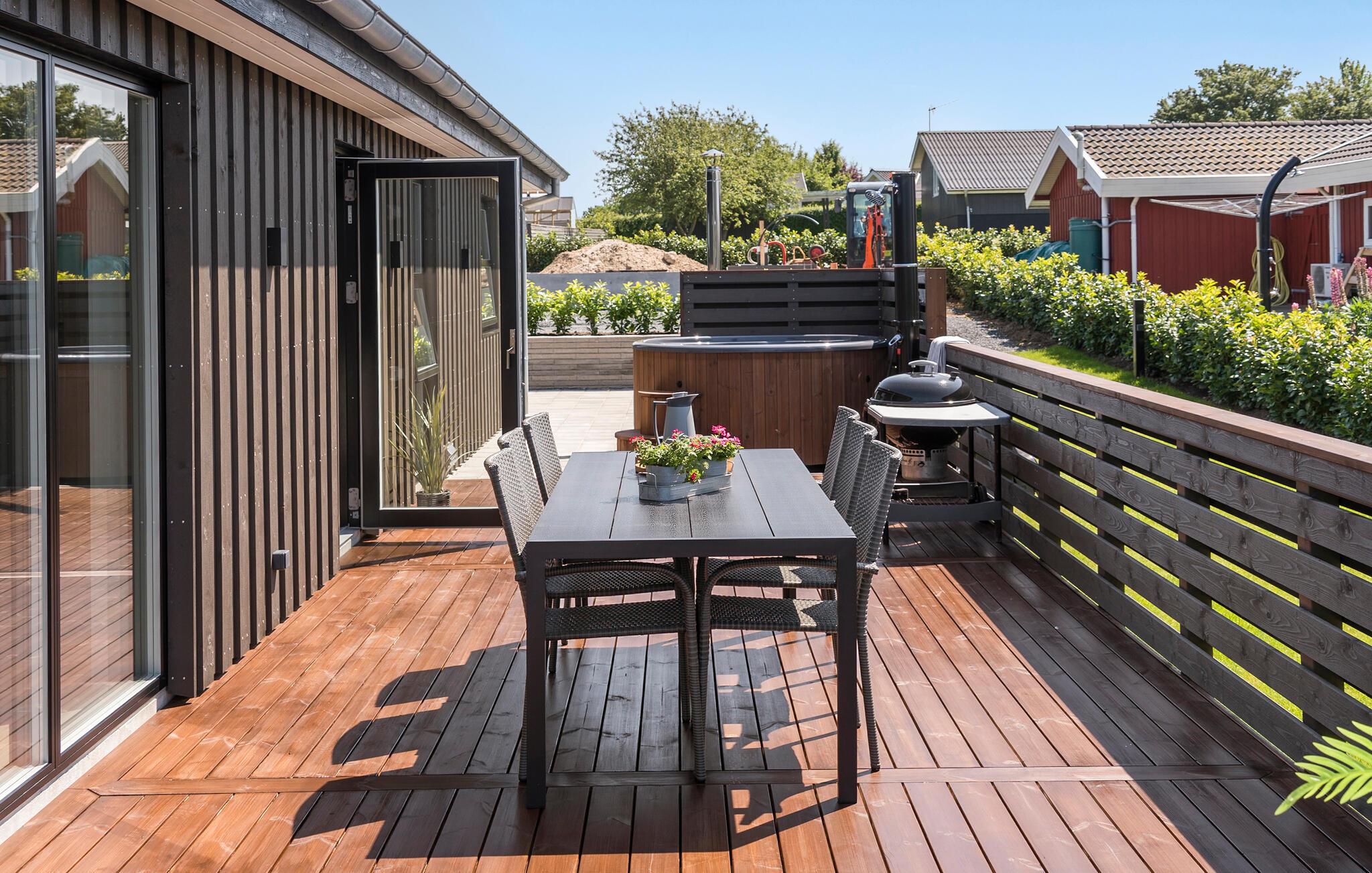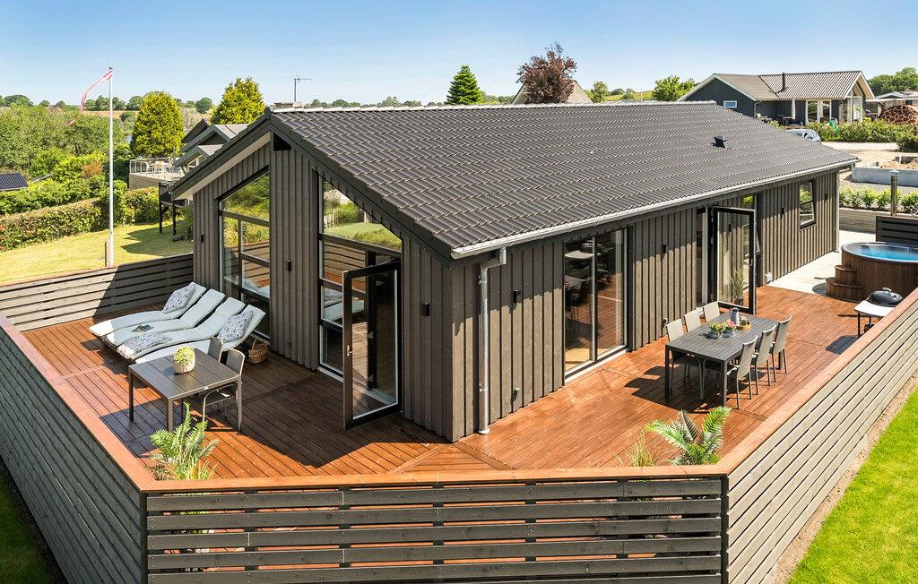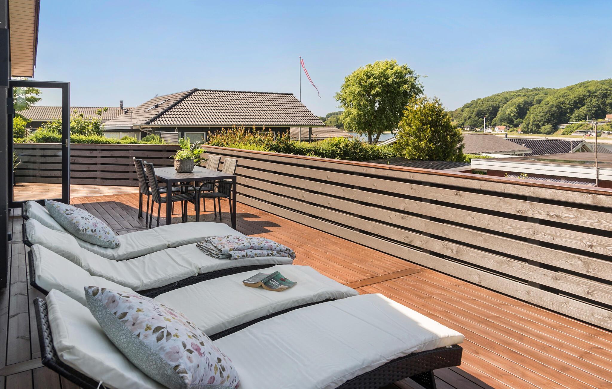 Moderne feriehus ved Sønderballe Strand med havudsigt, stor terrasse og vildmarksbad for afslapning.