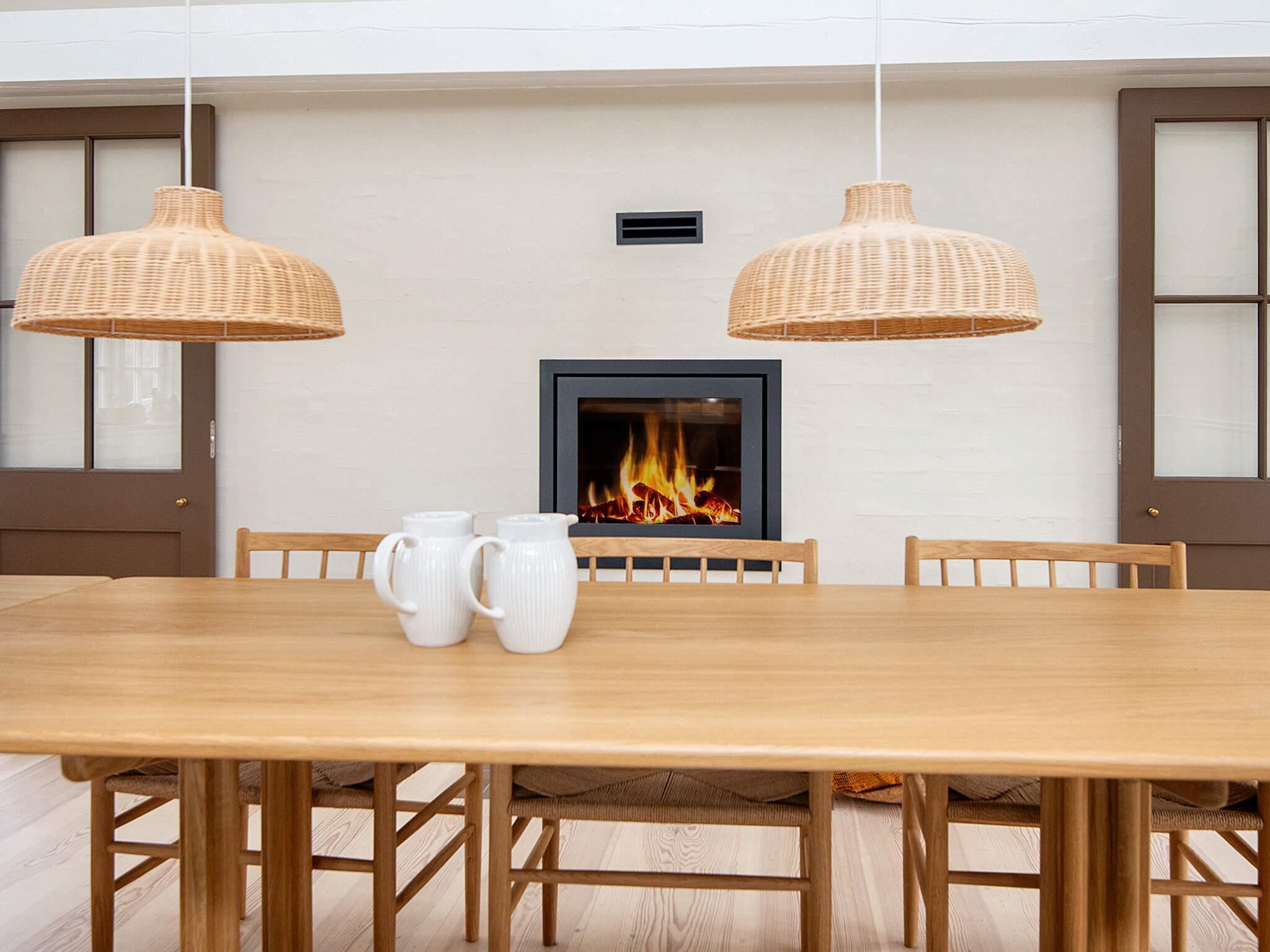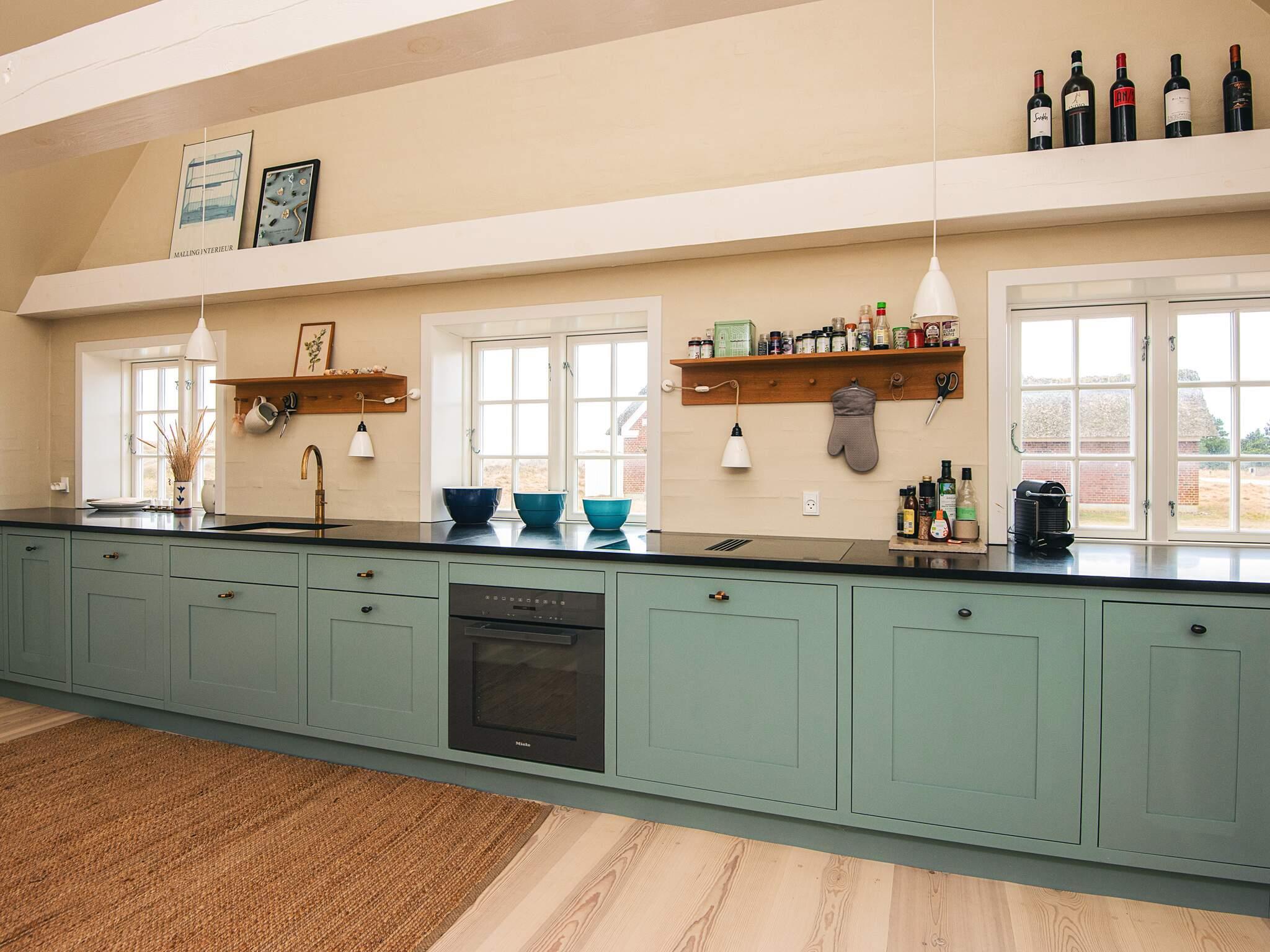 Køkken: Ovn, køleskab, Induktionskogeplader, kaffemaskine, opvaskemask.