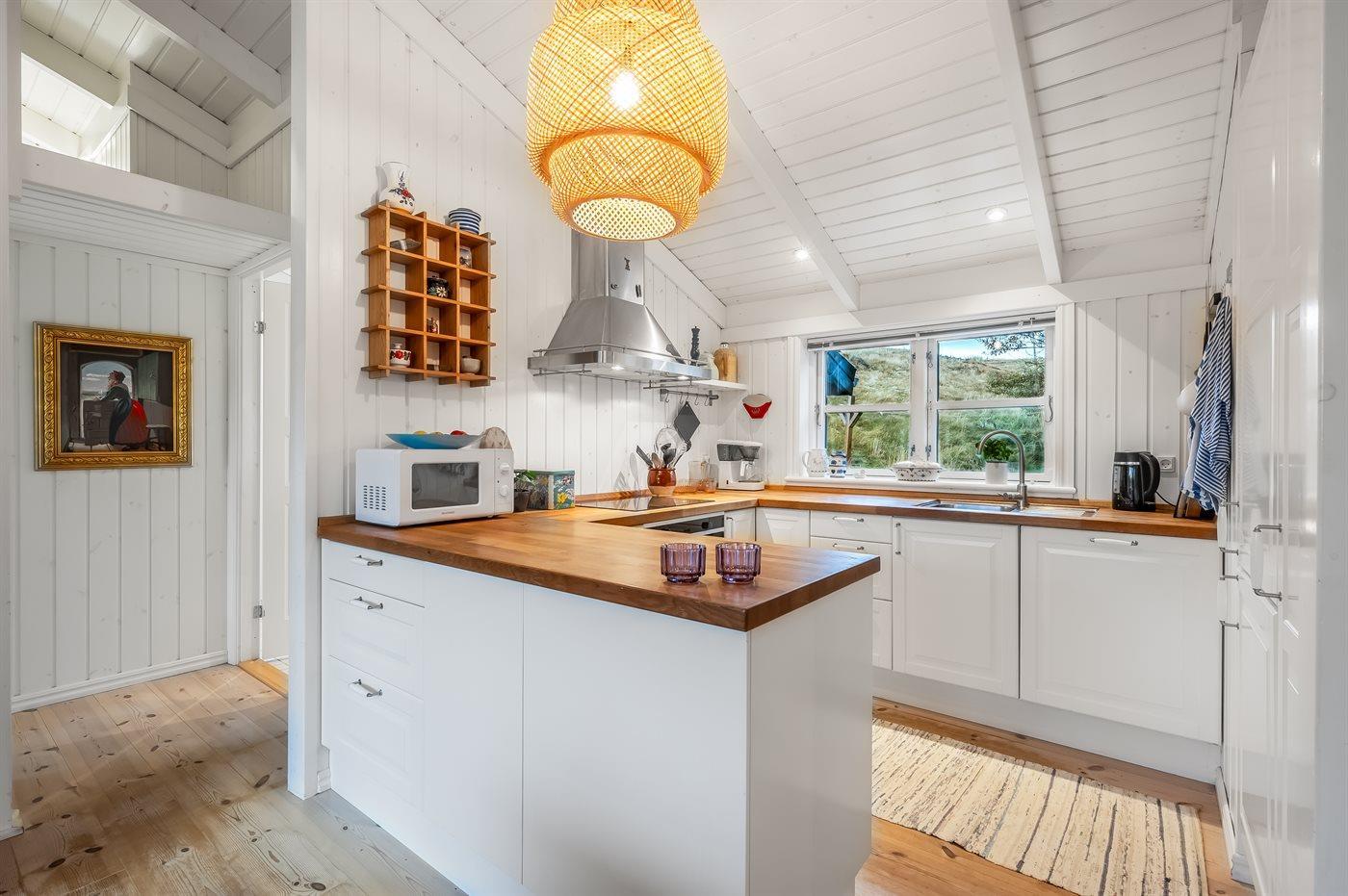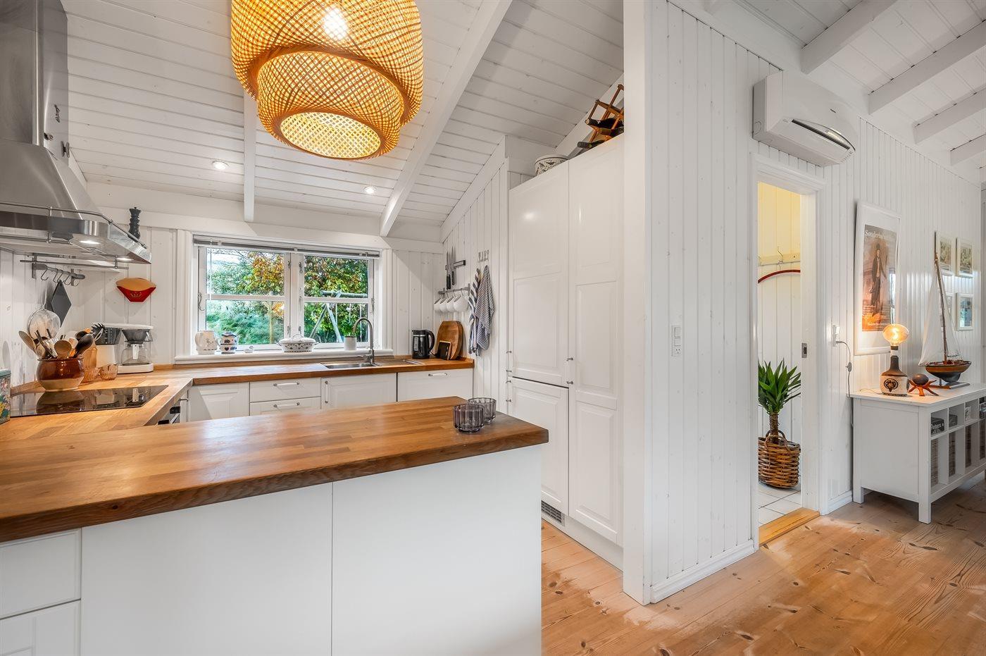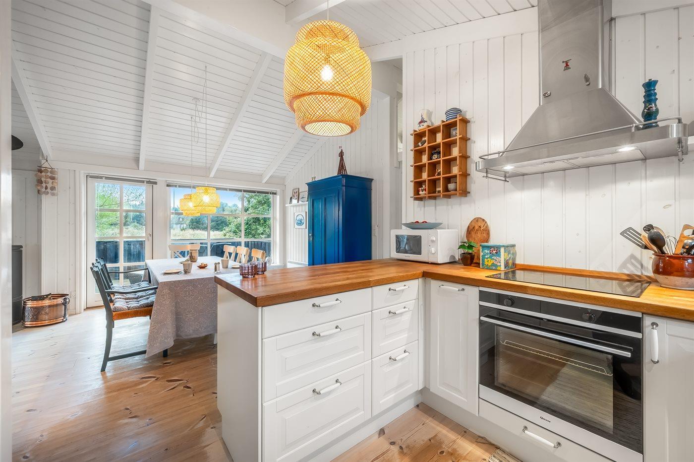 Køkkenet er udstyret med 1 køleskab. Der er 4 induktionskogeplader, varmluftovn, mikrobølgeovn samt opvaskemaskine.