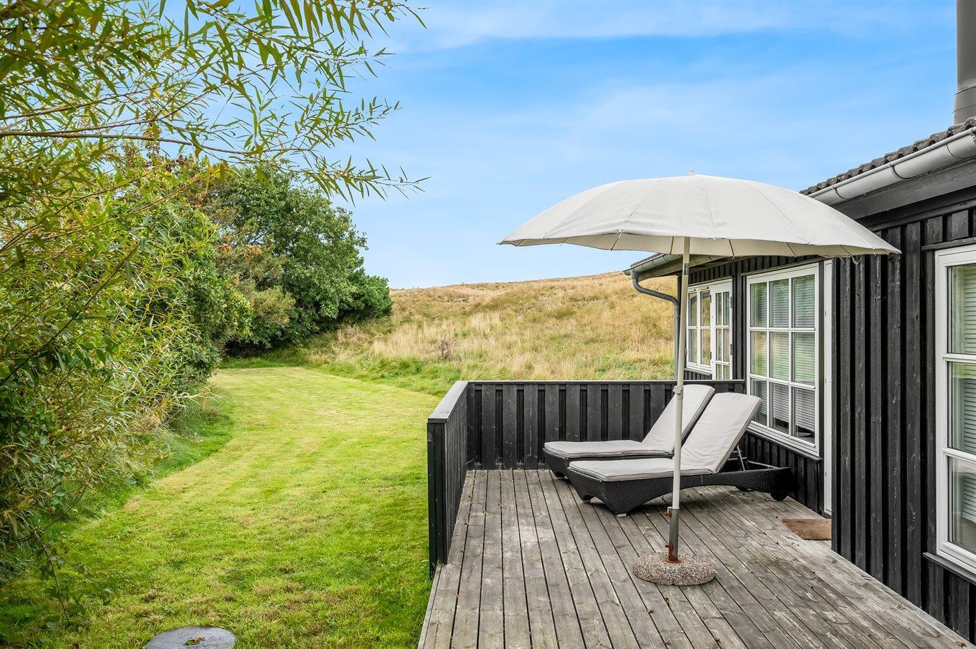 Ferieboligen er beliggende på en 2128 m² stor naturgrund. Der er 1500 m til havet. Der er 1000 m til Vadehavet. Nærmeste forretning er beliggende i en afstand af 800 m. Der er en golfbane i en afstand af 13000 m. Til ferieboligen hører 70 m² terrasseareal. Desuden er der 14 m² overdækket terrasse. Der er redskabsrum. Gynge. Grill til rådighed. Parkering ved ferieboligen.