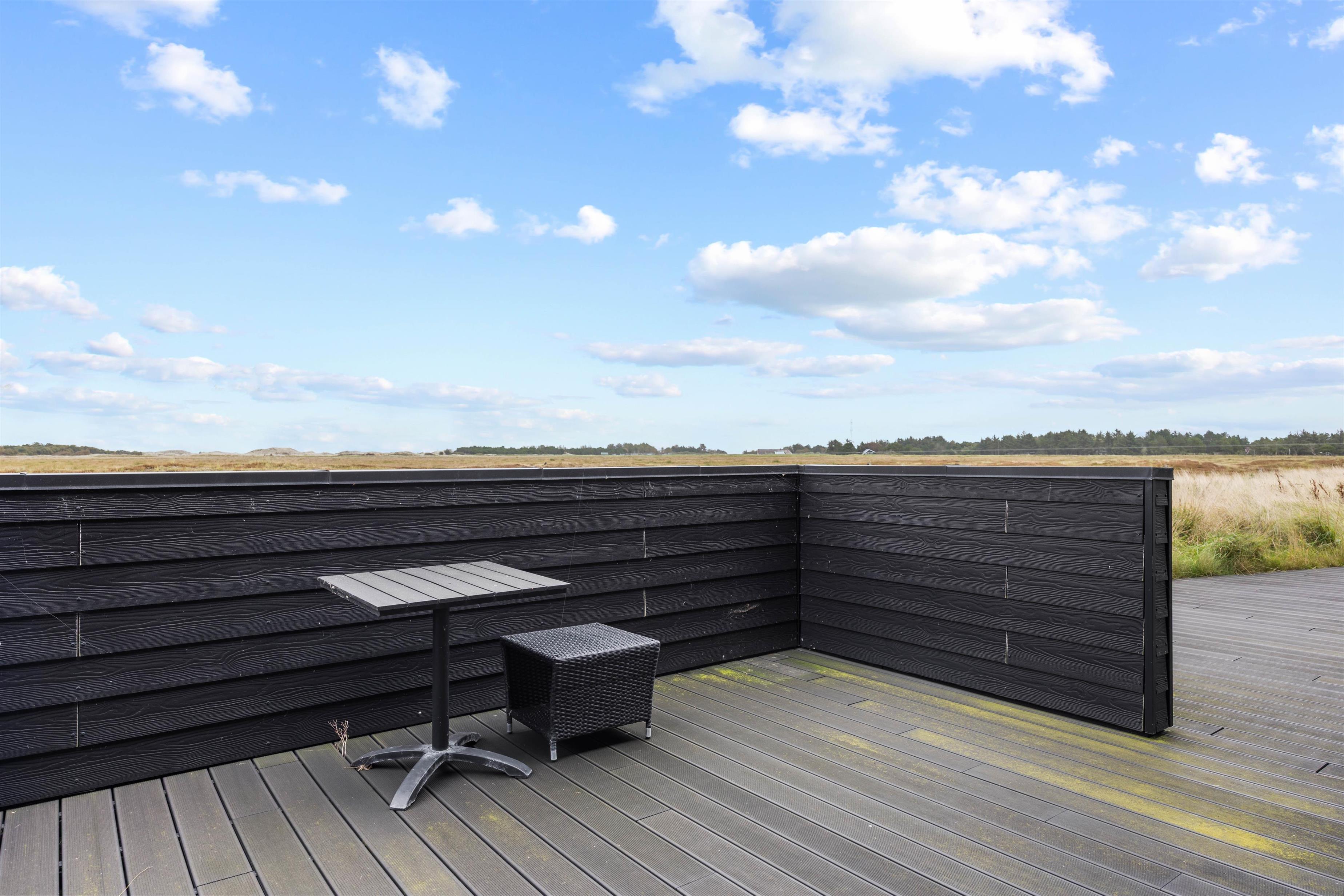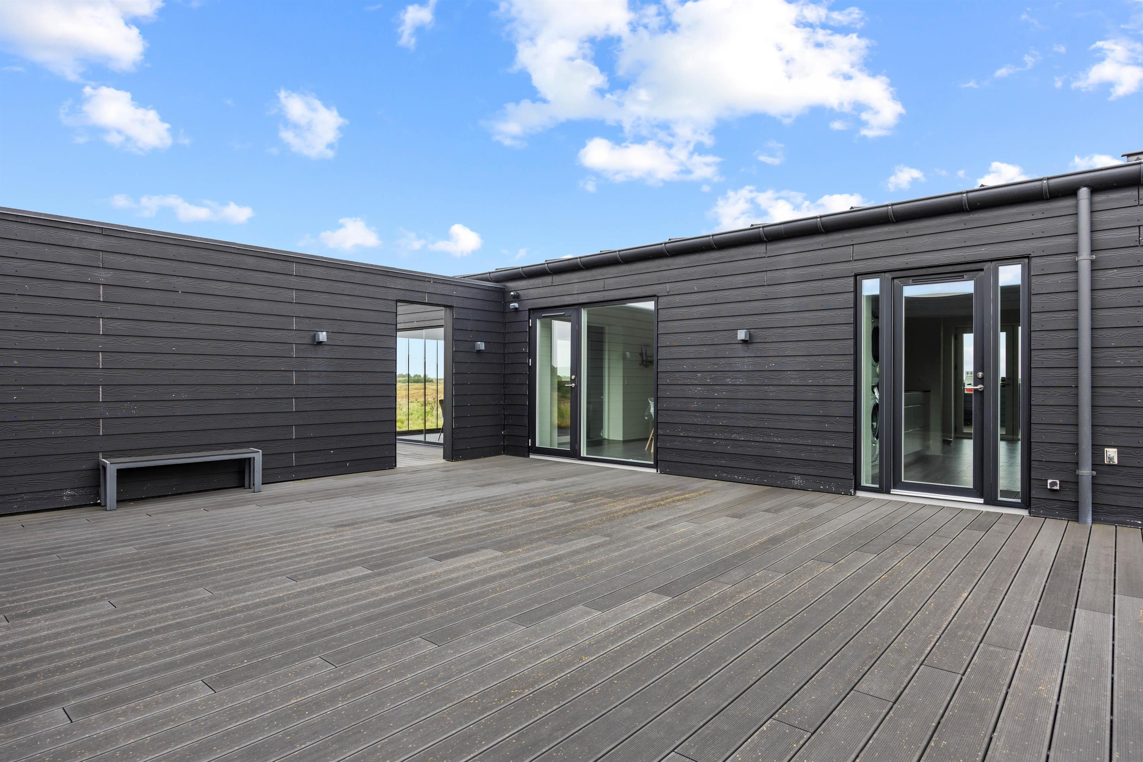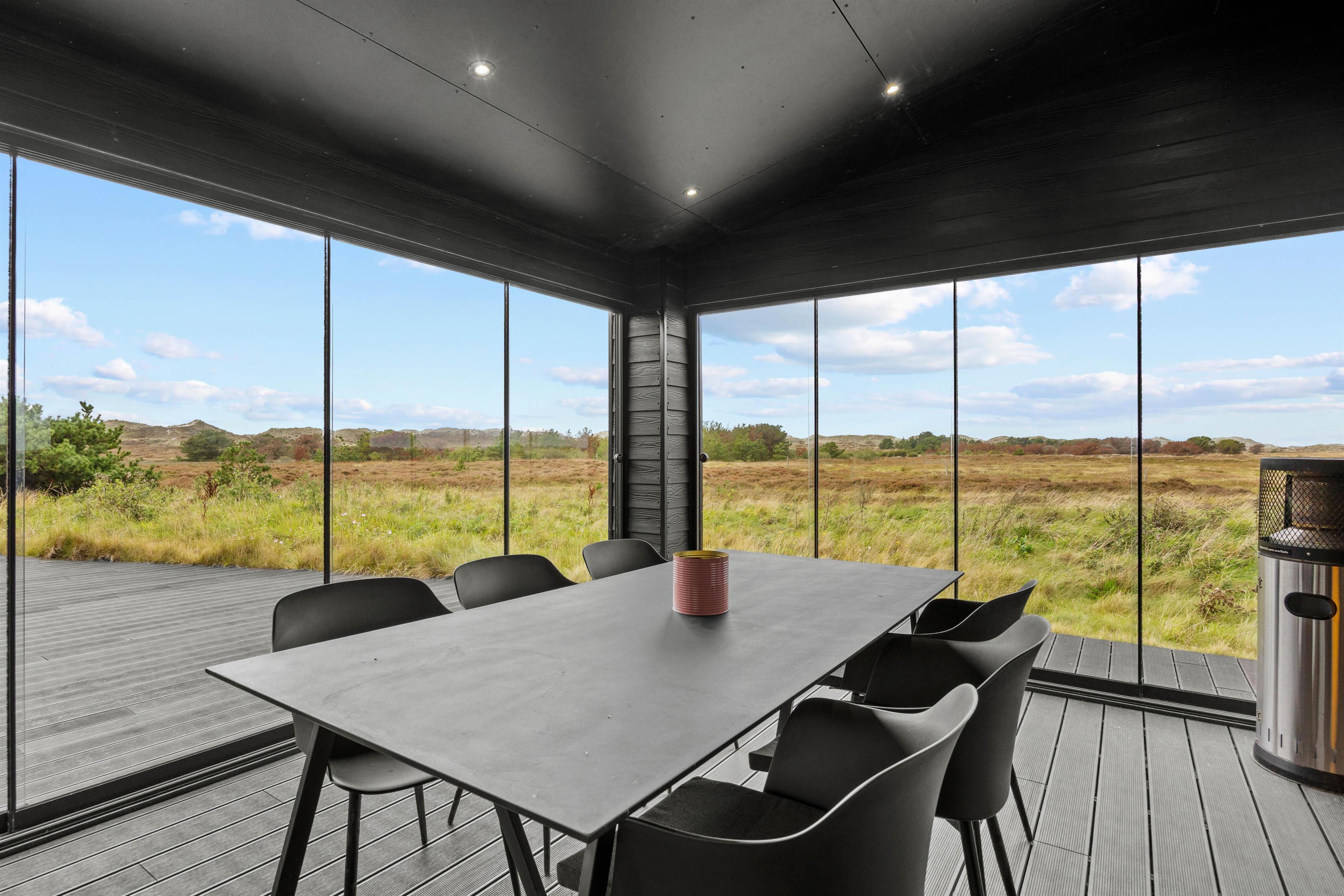 Foran feriehuset finder I et stort udendørsområde, der er delvist afskærmet, og hvor I kan tilbringe mange hyggelige timer. Fra stuen har I adgang til den overdækkede terrasse, hvor I kan holde hyggelige grillaftener, mens I nyder udsigten over den enestående natur. I har gasgrill til rådighed, så der altid er mulighed for en impulsiv grillaften imens skyggerne bliver lange.