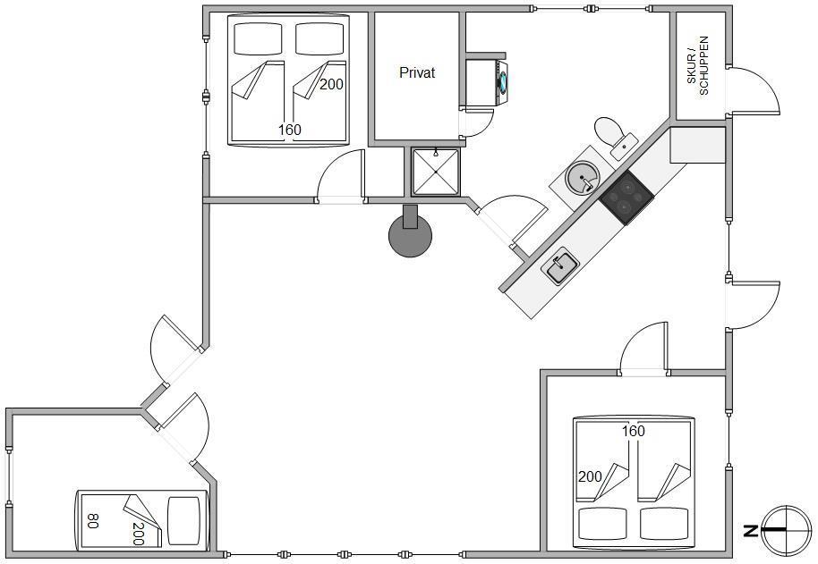 Sommerhuset rummer 68 m² og er indrettet, så I får mest muligt ud af pladsen. Med 2 dobbeltsenge og en enkeltseng fordelt på 3 værelser er der god plads til alle 5 gæster.