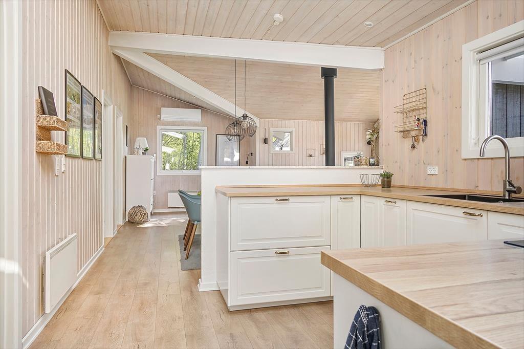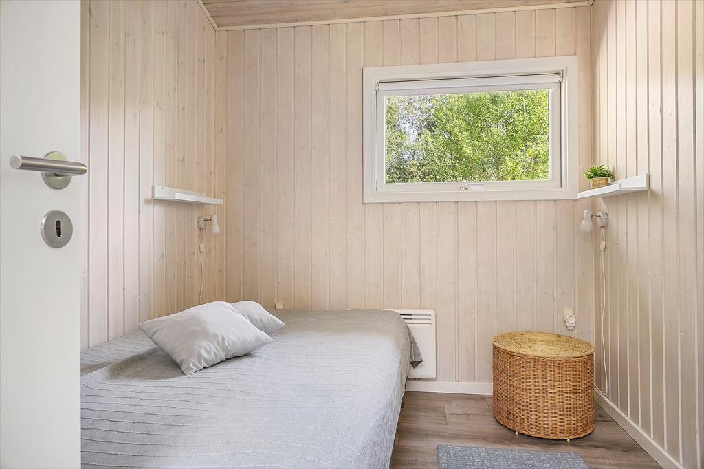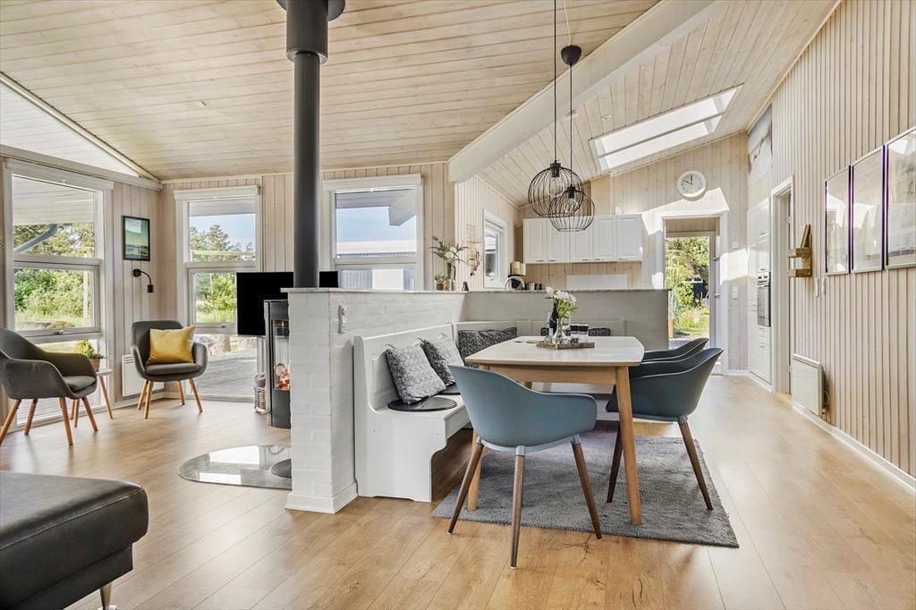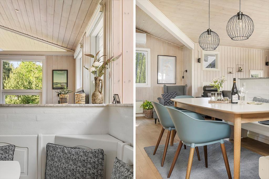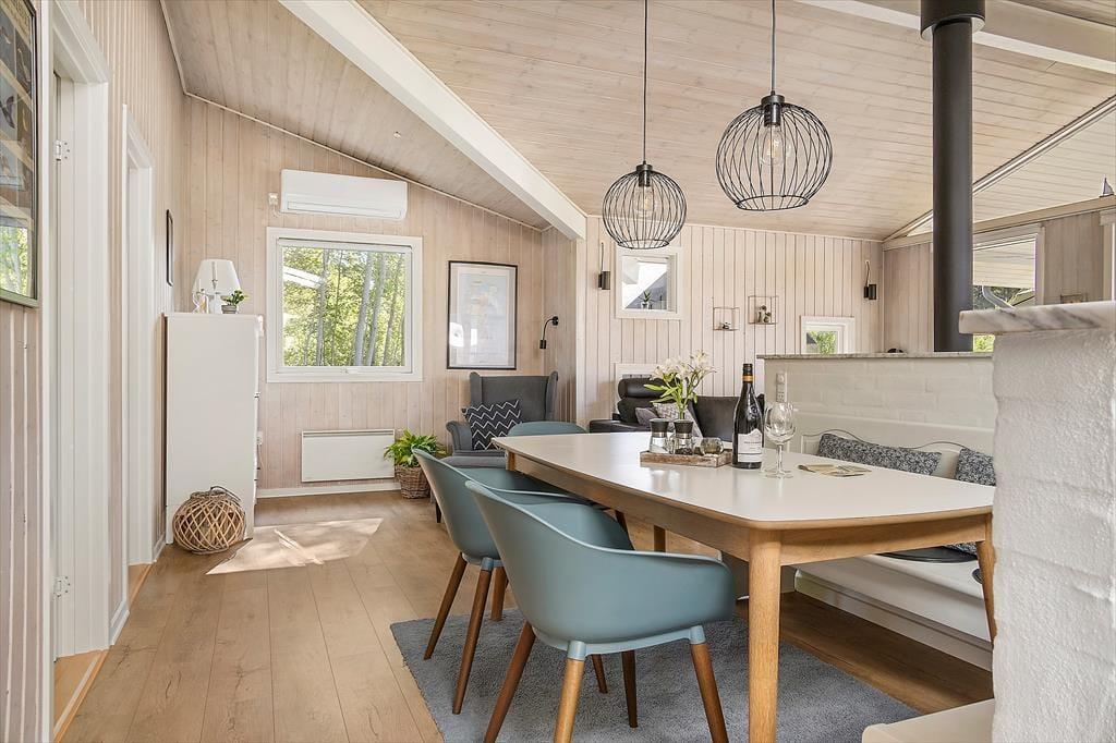 Atmosfæren er lys og indbydende i sommerhuset, der måler 95 m² og har en glimrende planløsning til fire personer. Senest er huset blevet renoveret i 2020, så alle rum fremstår pæne og velholdte. Mens gæstetoilettet og det lille bryggers er enkle og funktionelle rum, er der lagt op til livsnyderi og wellness på det store badeværelse, der er udstyret med spabad og sauna. Planløsningen byder desuden på tre gode soveværelser – to med dobbeltsenge samt et med en enkeltseng. Endelig er der opholdsafdelingen, hvor stue og køkken ligger i åben forbindelse. Her er der brændeovn og varmepumpe til eventuelle kølige aftener, og i løbet af dagen får du glæde af det smukke dagslys, der falder ind gennem de mange vinduer.
