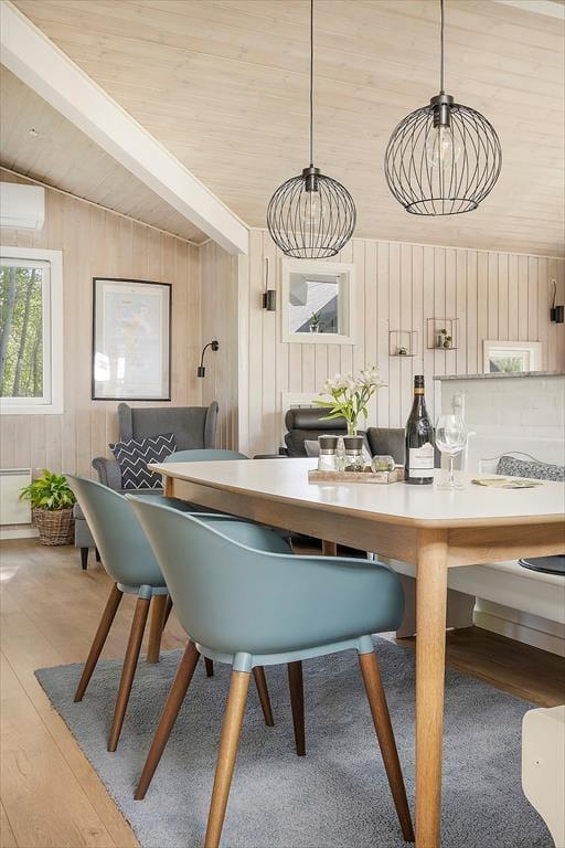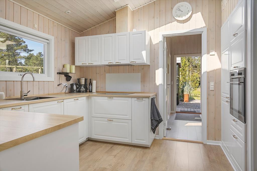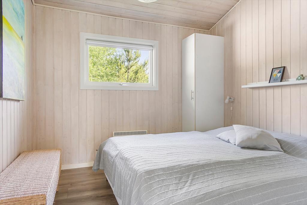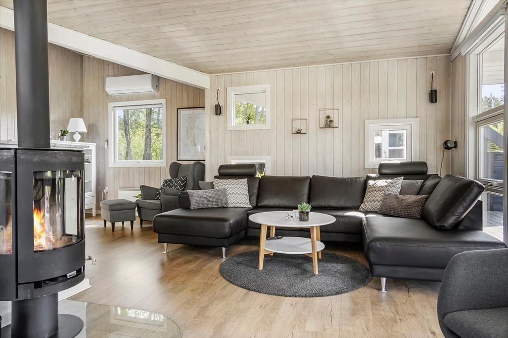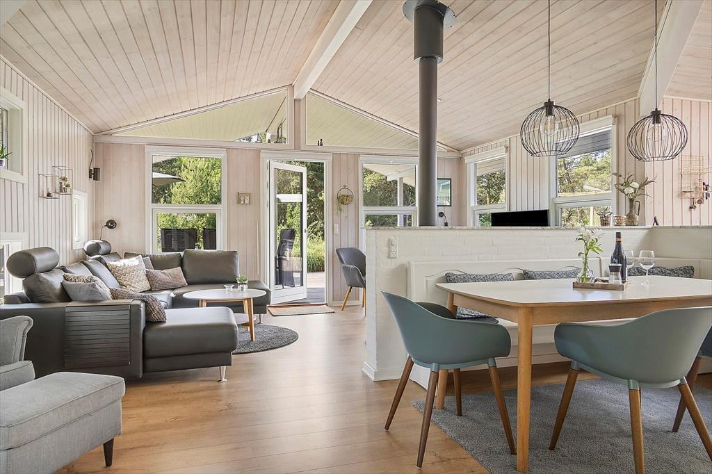 Atmosfæren er lys og indbydende i sommerhuset, der måler 95 m² og har en glimrende planløsning til fire personer. Senest er huset blevet renoveret i 2020, så alle rum fremstår pæne og velholdte. Mens gæstetoilettet og det lille bryggers er enkle og funktionelle rum, er der lagt op til livsnyderi og wellness på det store badeværelse, der er udstyret med spabad og sauna. Planløsningen byder desuden på tre gode soveværelser – to med dobbeltsenge samt et med en enkeltseng. Endelig er der opholdsafdelingen, hvor stue og køkken ligger i åben forbindelse. Her er der brændeovn og varmepumpe til eventuelle kølige aftener, og i løbet af dagen får du glæde af det smukke dagslys, der falder ind gennem de mange vinduer.