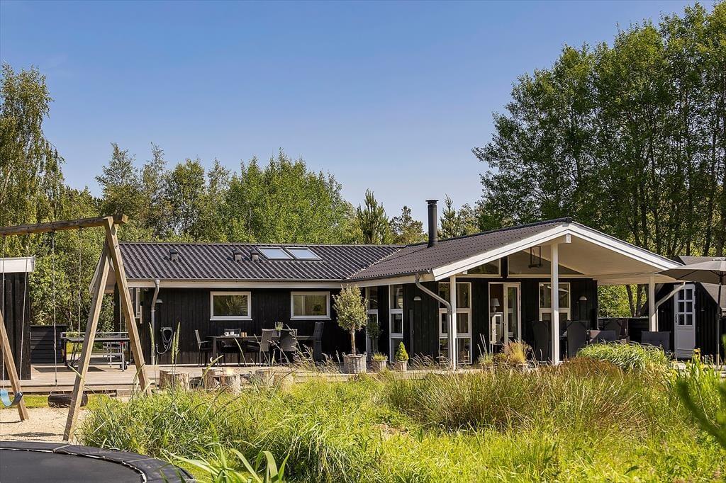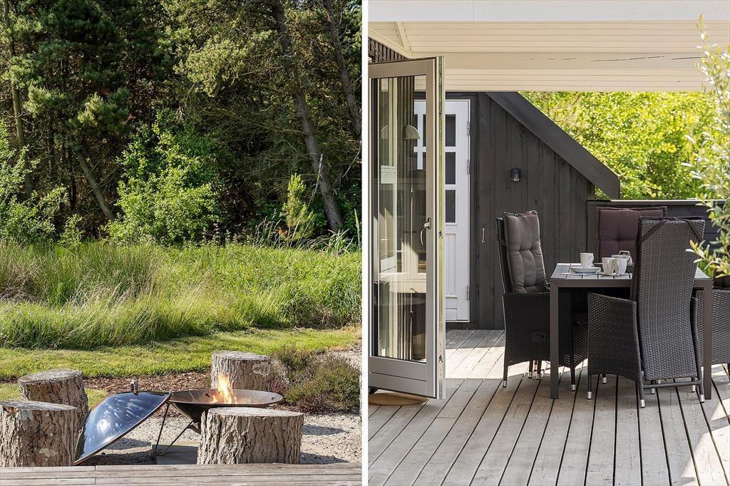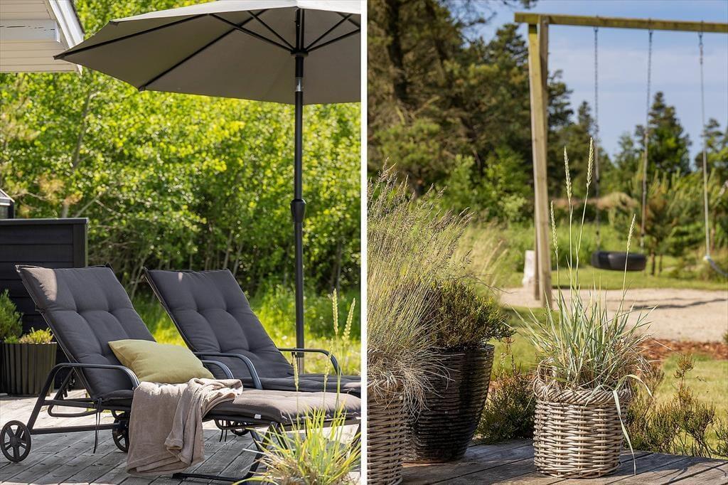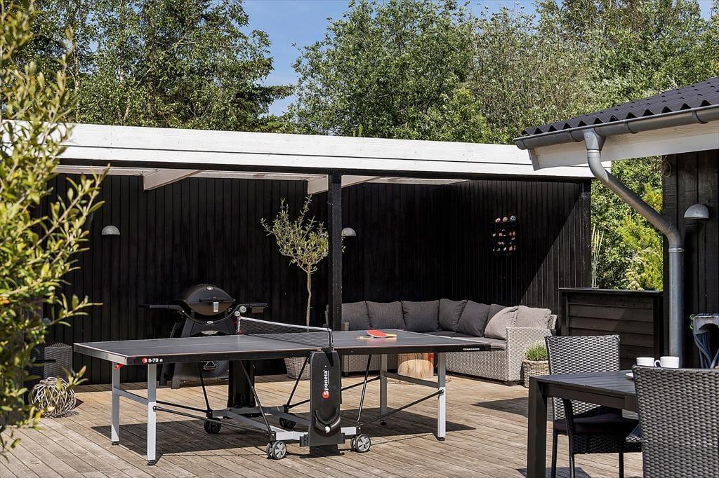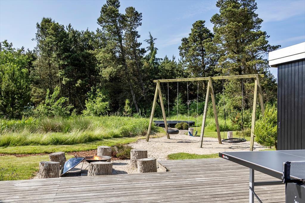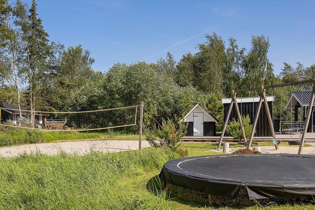 Den 2500 m² store naturgrund er et eldorado for både børn og voksne. I smukke, grønne omgivelser kan I spille beachvolley, hoppe på trampolin og gynge, og der er også mulighed for at spille bordtennis og dart under halvtaget. I solskinsvejr er det herligt at slænge sig på den store træterrasse – eventuelt under parasollen eller på den overdækkede del af terrassen, hvis du trænger til skygge. Om aftenen er der rig mulighed for at grille eller at samles ved bålpladsen, mens I nyder det afslappende ferieliv.
