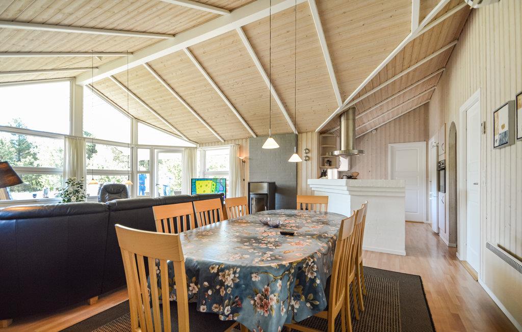 Dette feriehus ligger i et dejligt naturområde meget nær ved Sønderstrand. Det byder på al tænkelig komfort til en rigtig afslappende ferie. Det flotte vinduesparti mod syd giver et perfekt lysindfald i den hyggelige stue, som er kombineret med det veludstyrede køkken. Huset er med sine ni sovepladser og to badeværelser yderst velegnet til to familier. På den kæmpestore terrasse, som omgiver næsten hele huset, kan I nyde solen fra morgen til aften.