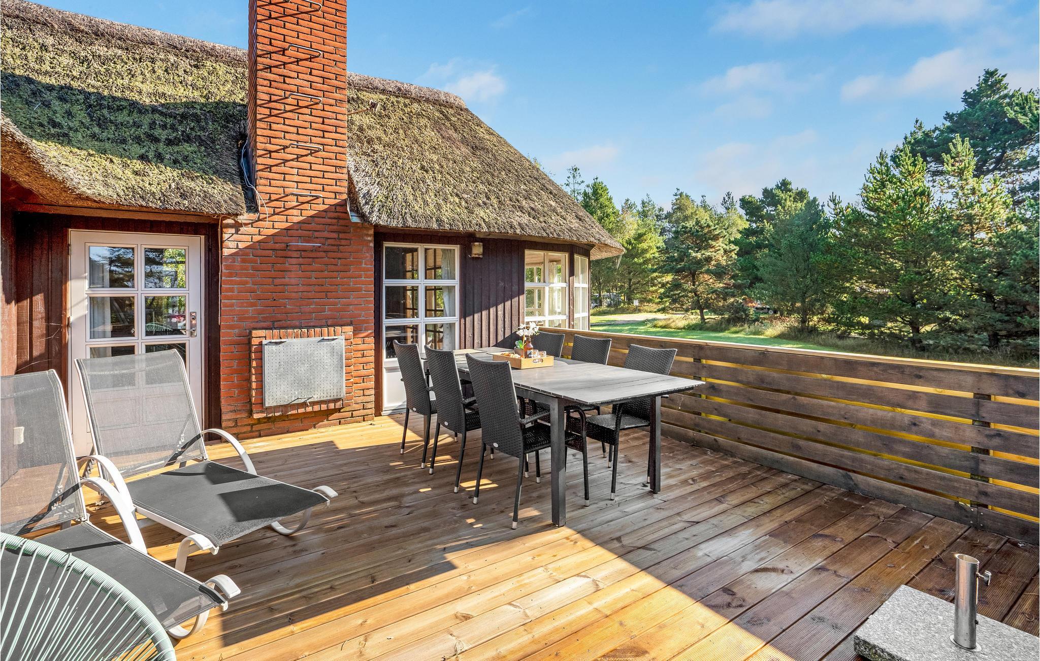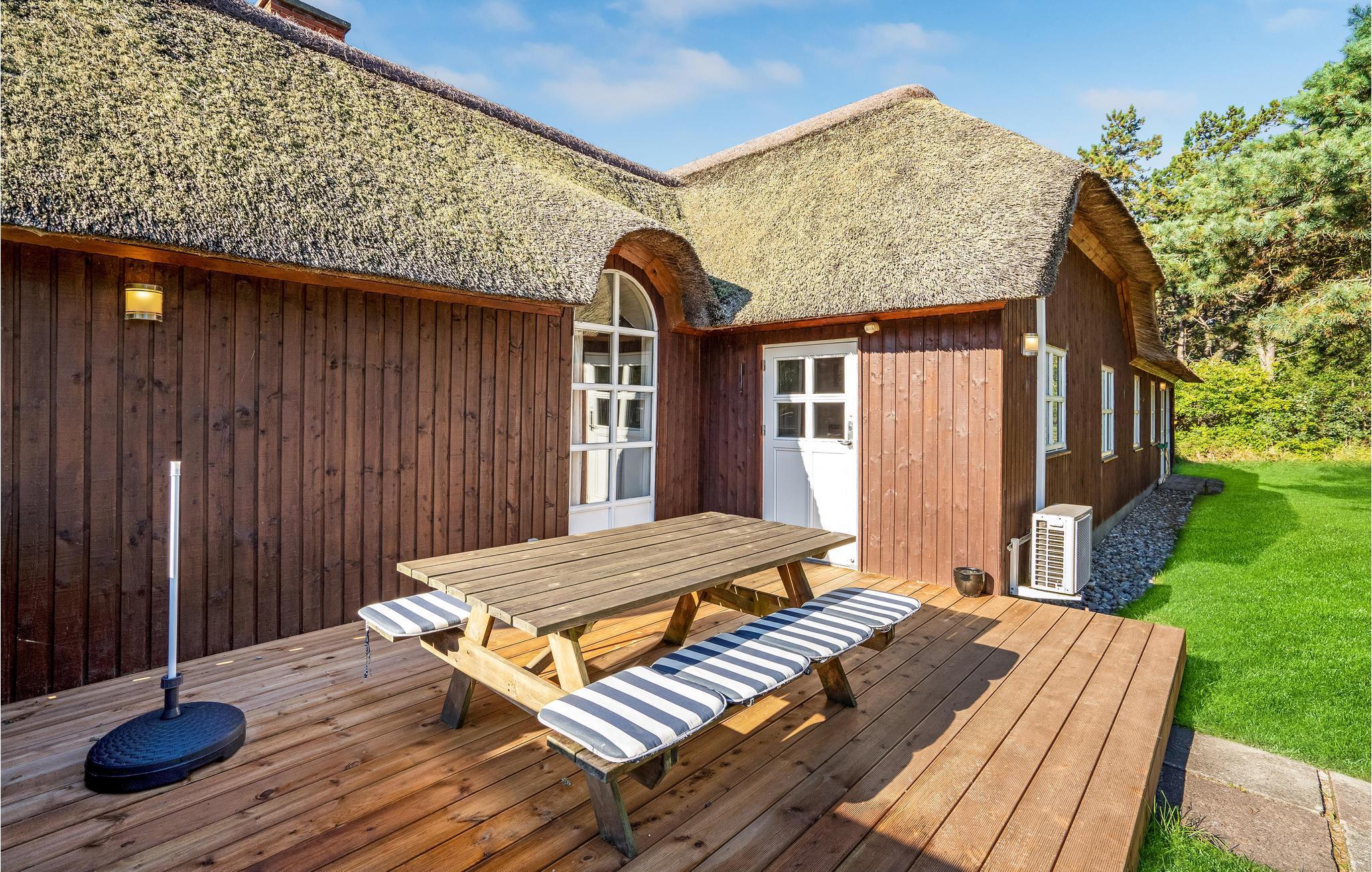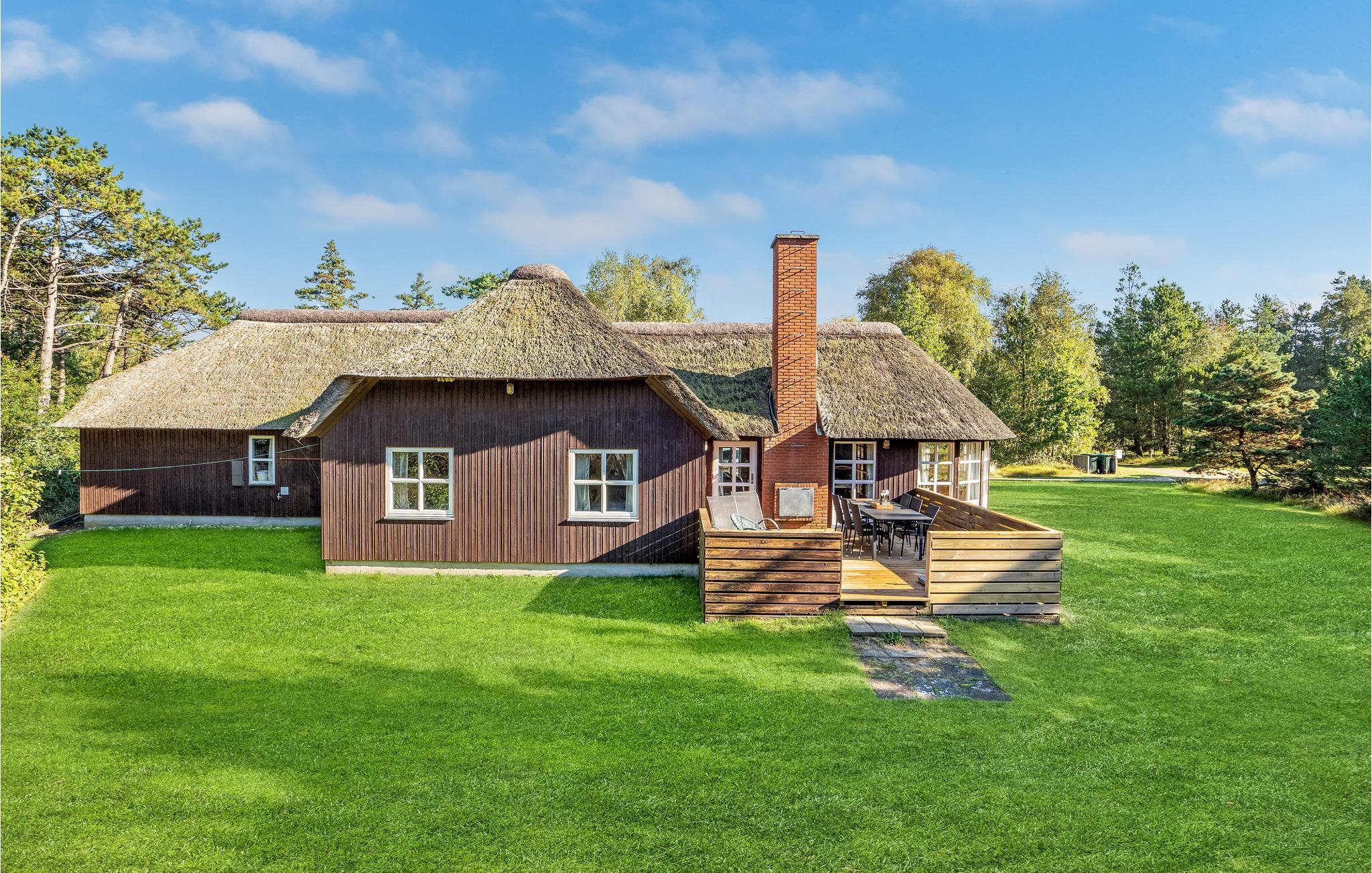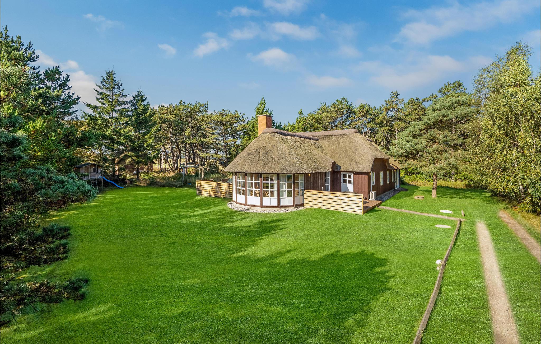Dette hyggelige, stråtækte feriehus ligger i 1. række til klitterne og er ideelt for 2 til 10 personer. Huset er opført i kvalitetsmaterialer og indeholder et veludstyret køkken, samt en rummelig opholdsstue med en hyggespredende pejs. I wellnessafdelingen kan I slappe af i spabadet og nyde herlig undervandsmassage eller gå en tur i den velgørende sauna. På kølige dage er den lyse havestue et rigtigt dejligt og lunt opholdsted. Ved huset findes to terrasser, der vender henholdsvis mod øst og vest, hvor I altid kan finde et læsted. Den store naturgrund er ideel til børnenes leg med gode gemmesteder. Ved huset kan I nyde roen og den smukke natur, i gåafstand fra huset ligger en af Nordeuropas bredeste sandstrande. Huset ligger tæt på en indhegning med heste ved en privat vej med kun lidt trafik. Tidligt om morgenen kan I få et glimt af rådyrene i skovkanten af den tilstødende skov. Morgenbrødet kan I hente hos bageren på mindre end 5 minutter.