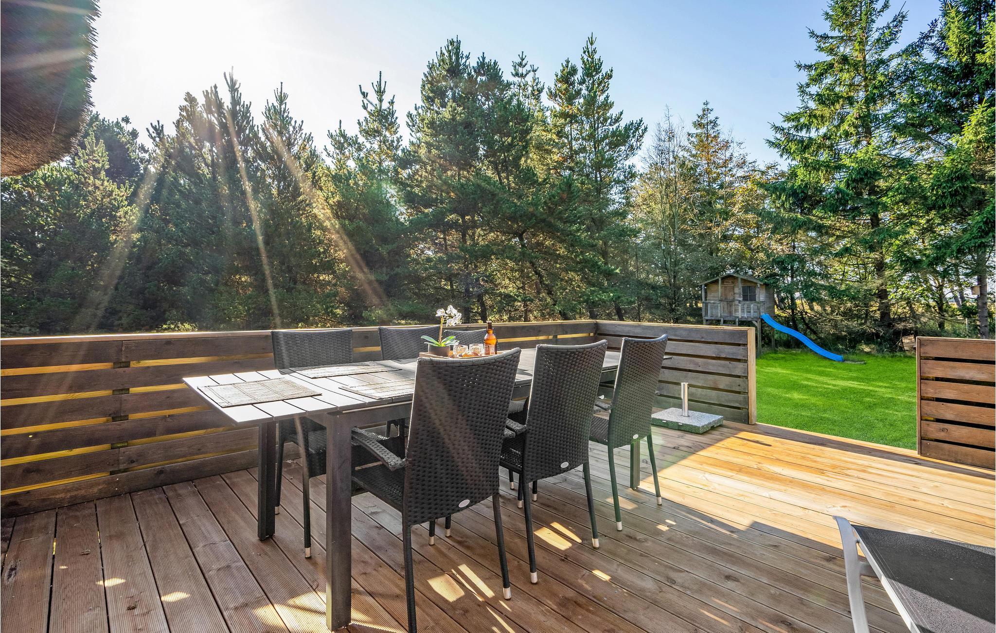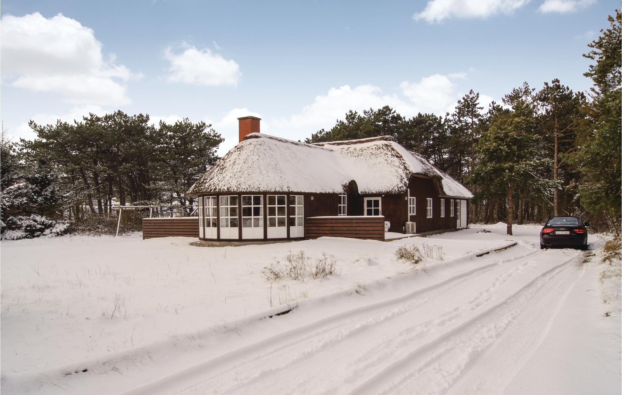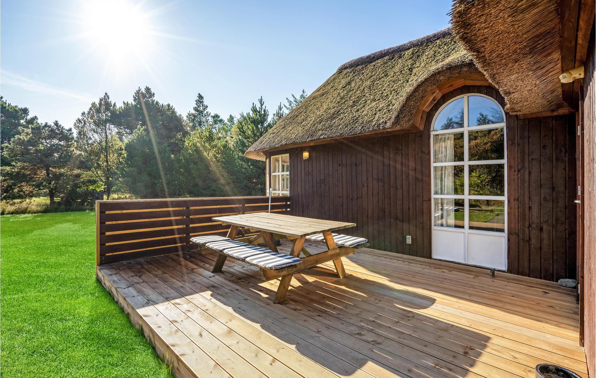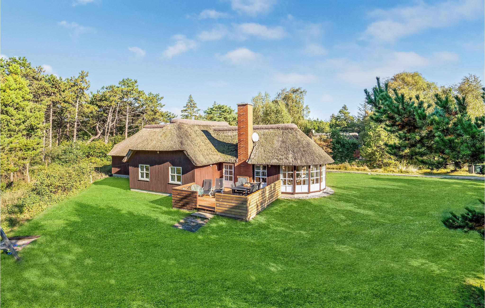 Dette hyggelige, stråtækte feriehus ligger i 1. række til klitterne og er ideelt for 2 til 10 personer. Huset er opført i kvalitetsmaterialer og indeholder et veludstyret køkken, samt en rummelig opholdsstue med en hyggespredende pejs. I wellnessafdelingen kan I slappe af i spabadet og nyde herlig undervandsmassage eller gå en tur i den velgørende sauna. På kølige dage er den lyse havestue et rigtigt dejligt og lunt opholdsted. Ved huset findes to terrasser, der vender henholdsvis mod øst og vest, hvor I altid kan finde et læsted. Den store naturgrund er ideel til børnenes leg med gode gemmesteder. Ved huset kan I nyde roen og den smukke natur, i gåafstand fra huset ligger en af Nordeuropas bredeste sandstrande. Huset ligger tæt på en indhegning med heste ved en privat vej med kun lidt trafik. Tidligt om morgenen kan I få et glimt af rådyrene i skovkanten af den tilstødende skov. Morgenbrødet kan I hente hos bageren på mindre end 5 minutter.