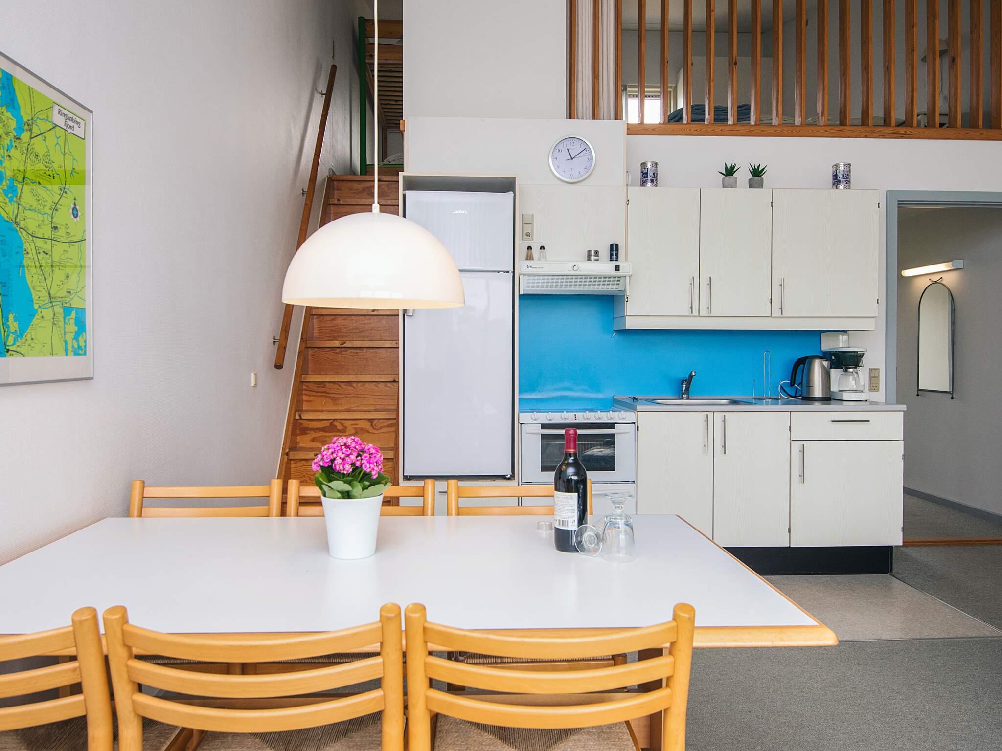 Lejligheden ligger på 1. sal og tilbyder fleksible sovemuligheder. Der er et soveværelse med to enkeltsenge, der kan slås sammen til en dobbeltseng, og en hems under taghældningen med en dobbeltseng og en køjeseng, ideel til børn. Stuen er indrettet med en sovesofa og to ekstra senge, hvilket gør det nemt at imødekomme forskellige behov. Det åbne køkken og opholdsstue skaber et hyggeligt rum til fælles måltider og afslappende aftener. Herfra har du direkte udgang til en overdækket terrasse, hvor du kan nyde den friske havbrise og stemningen i kystbyen.