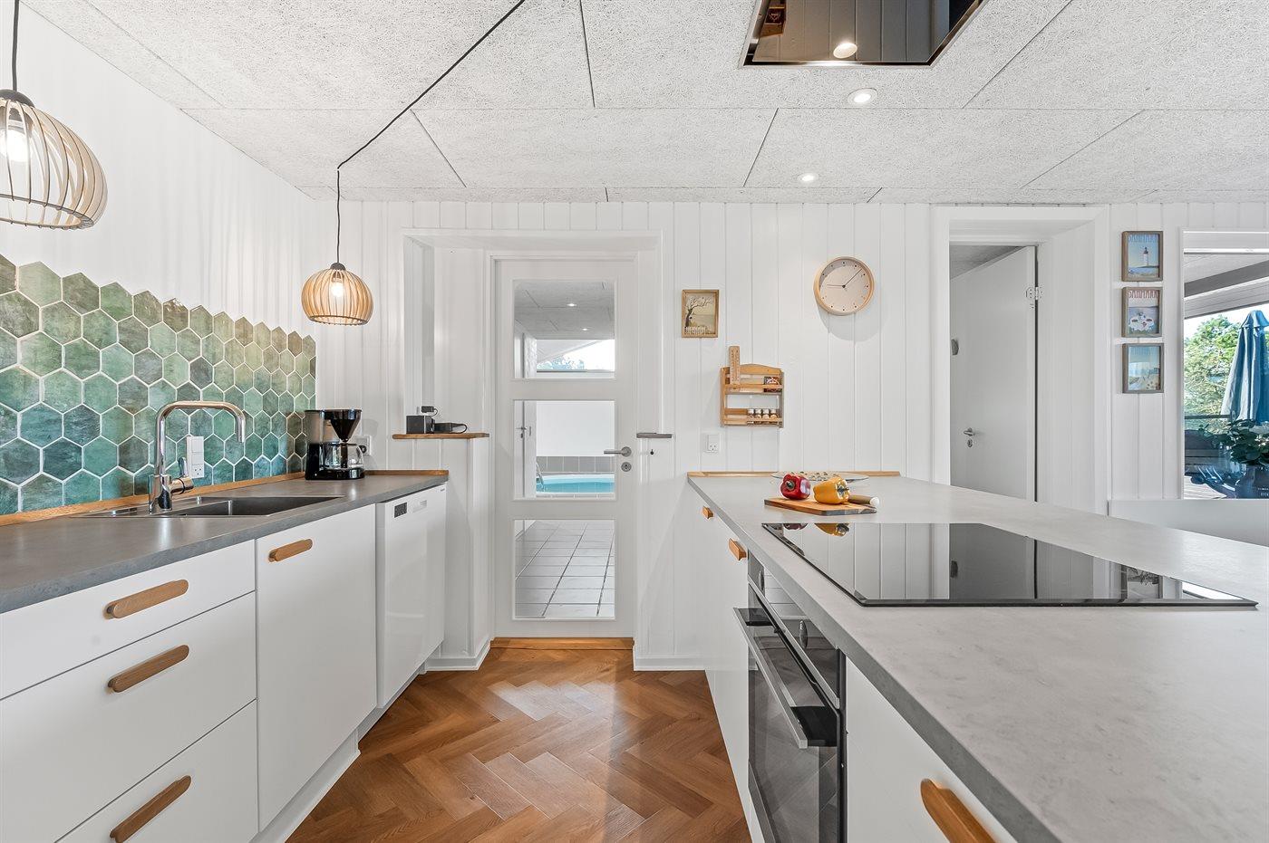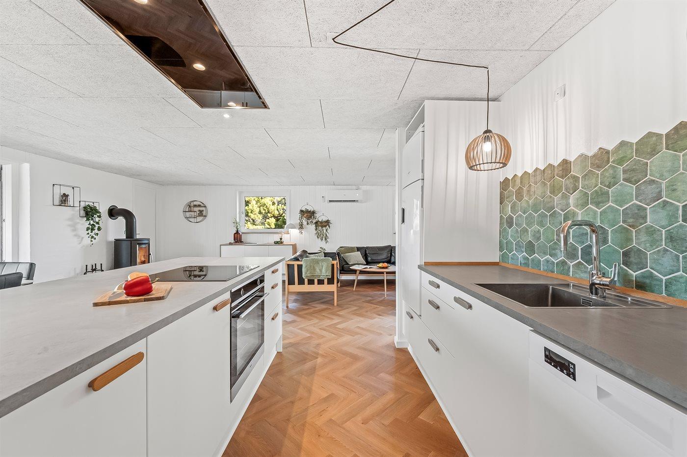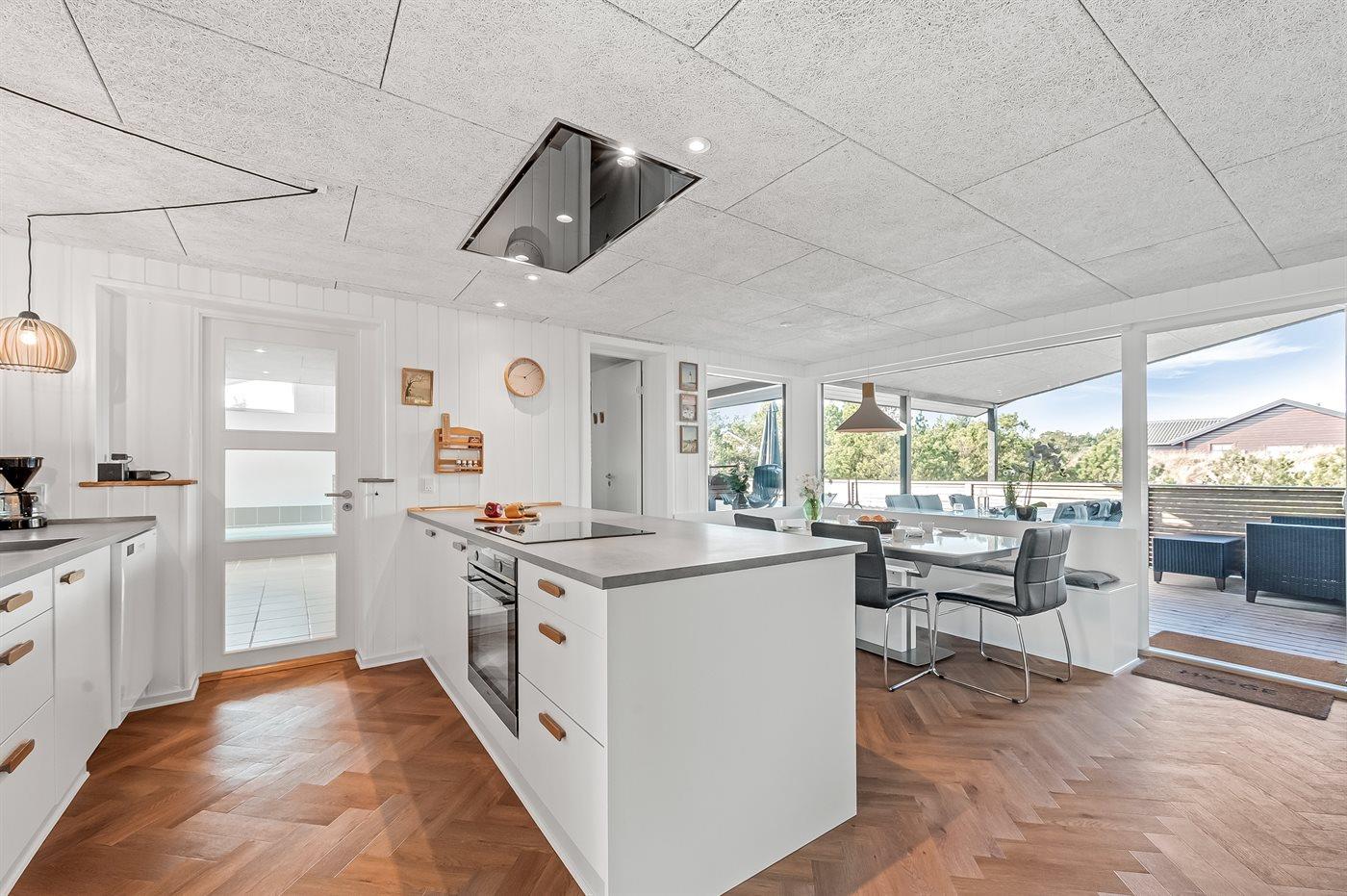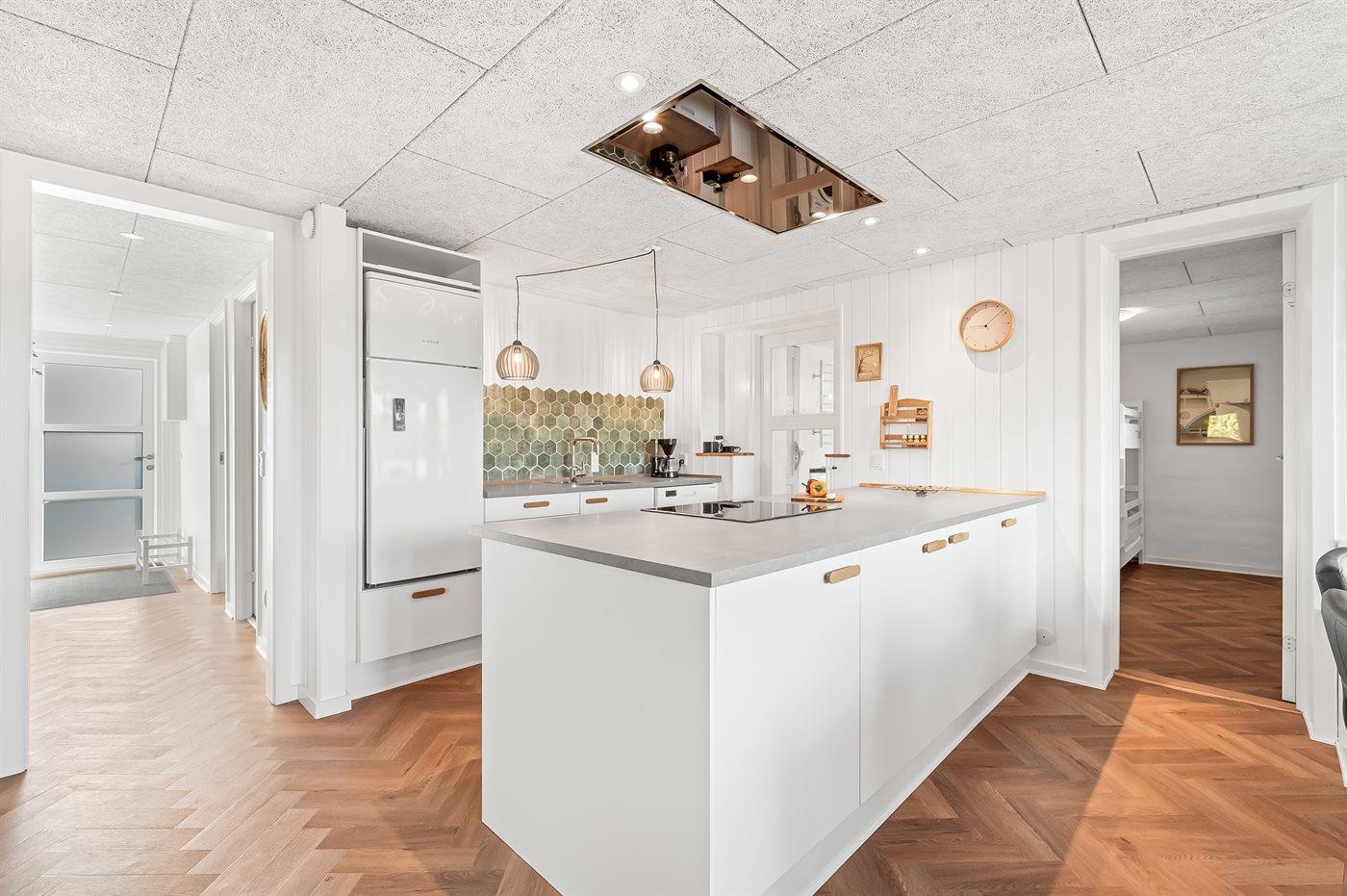 Køkkenet er udstyret med 1 køleskab. Der er 4 induktionskogeplader, varmluftovn, mikrobølgeovn samt opvaskemaskine.