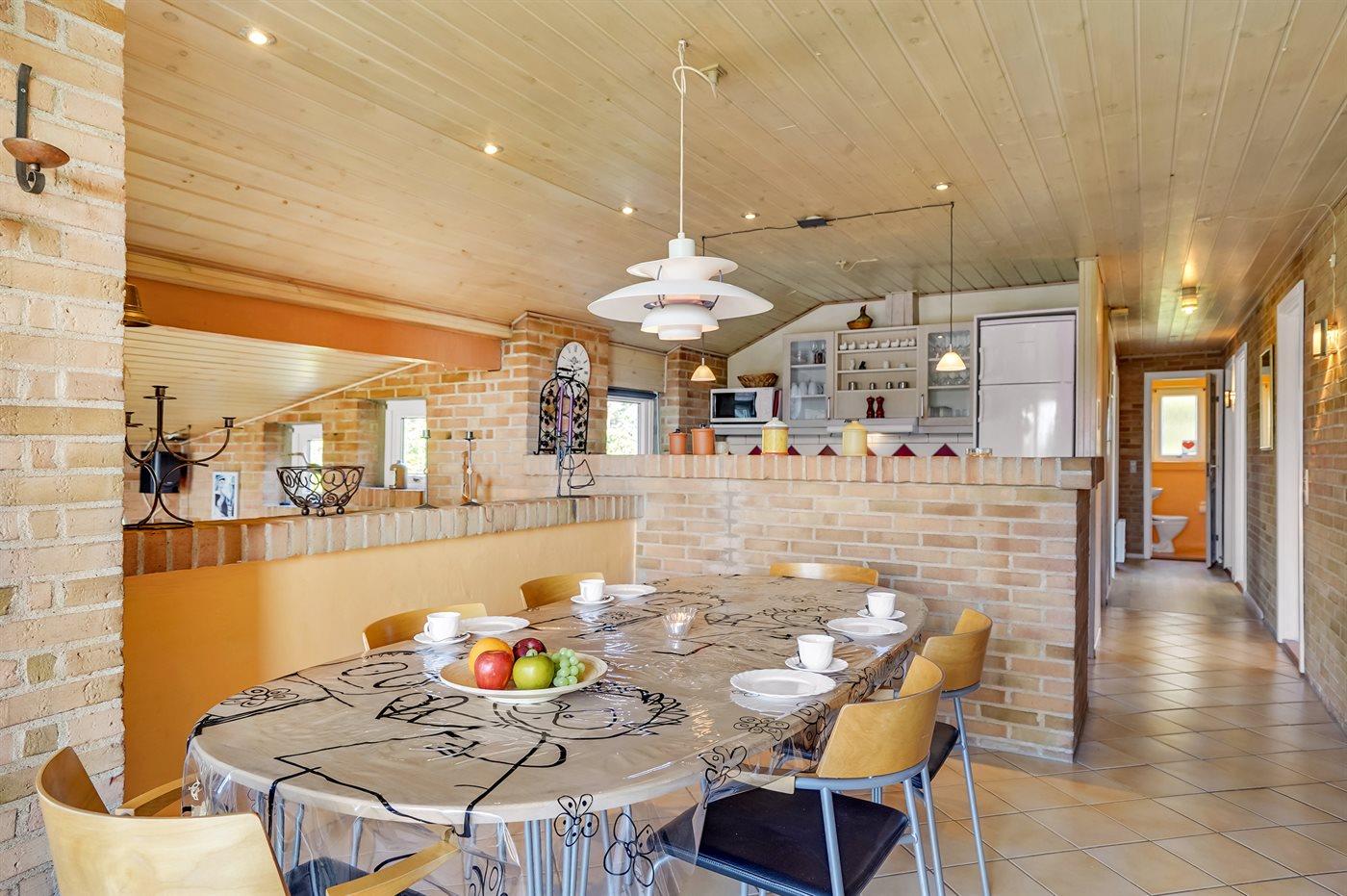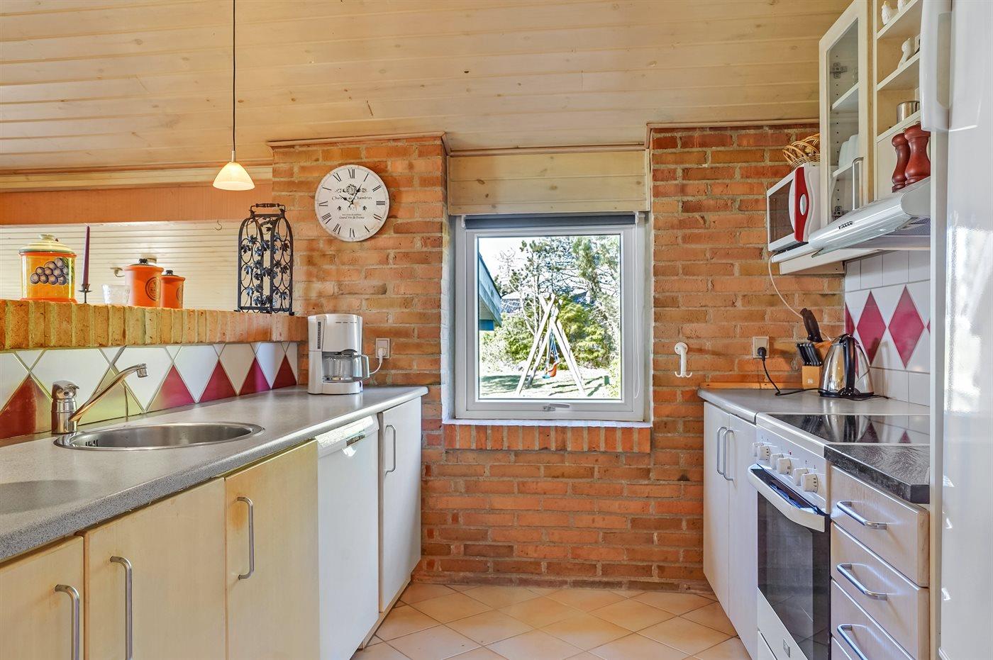 Køkkenet er udstyret med 1 køleskab. Der er 4 keramiske kogeplader, bageovn, mikrobølgeovn samt opvaskemaskine.