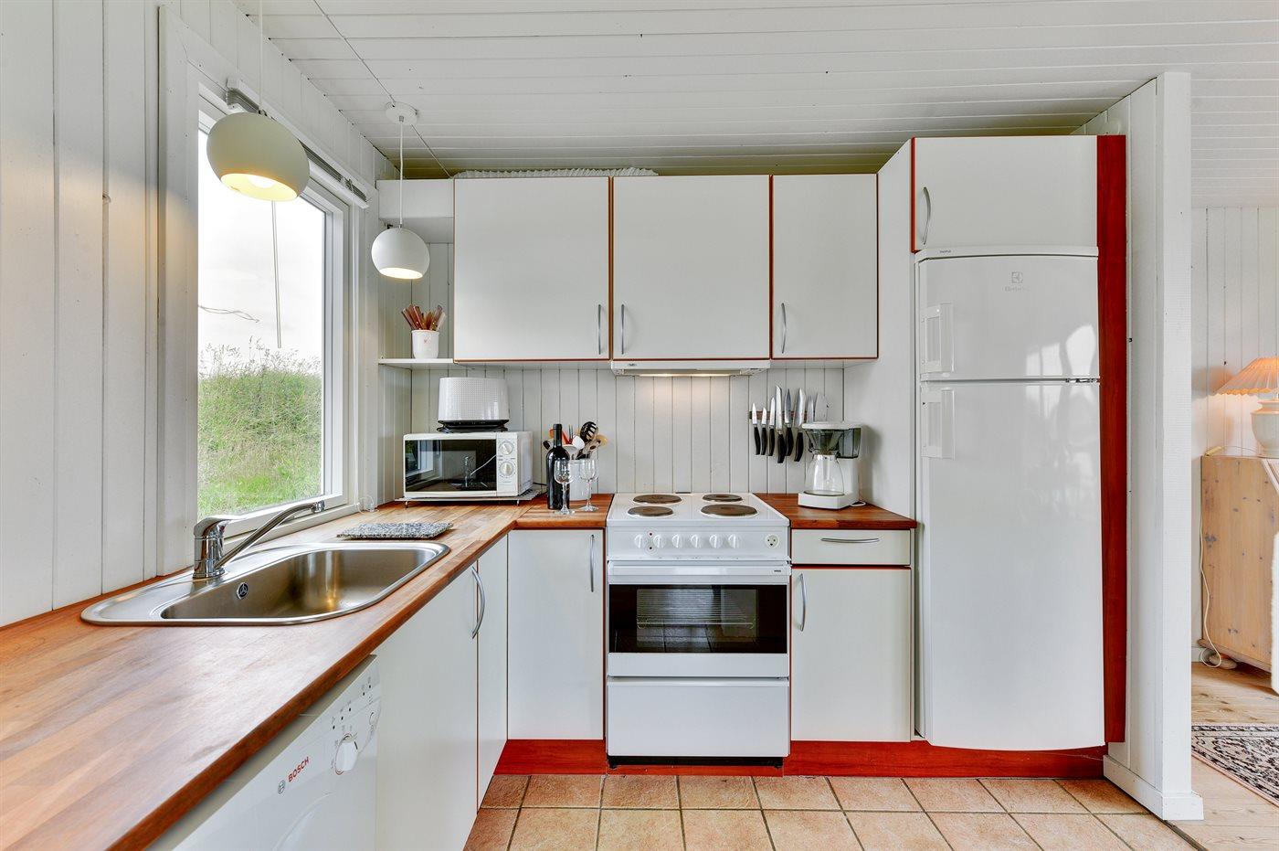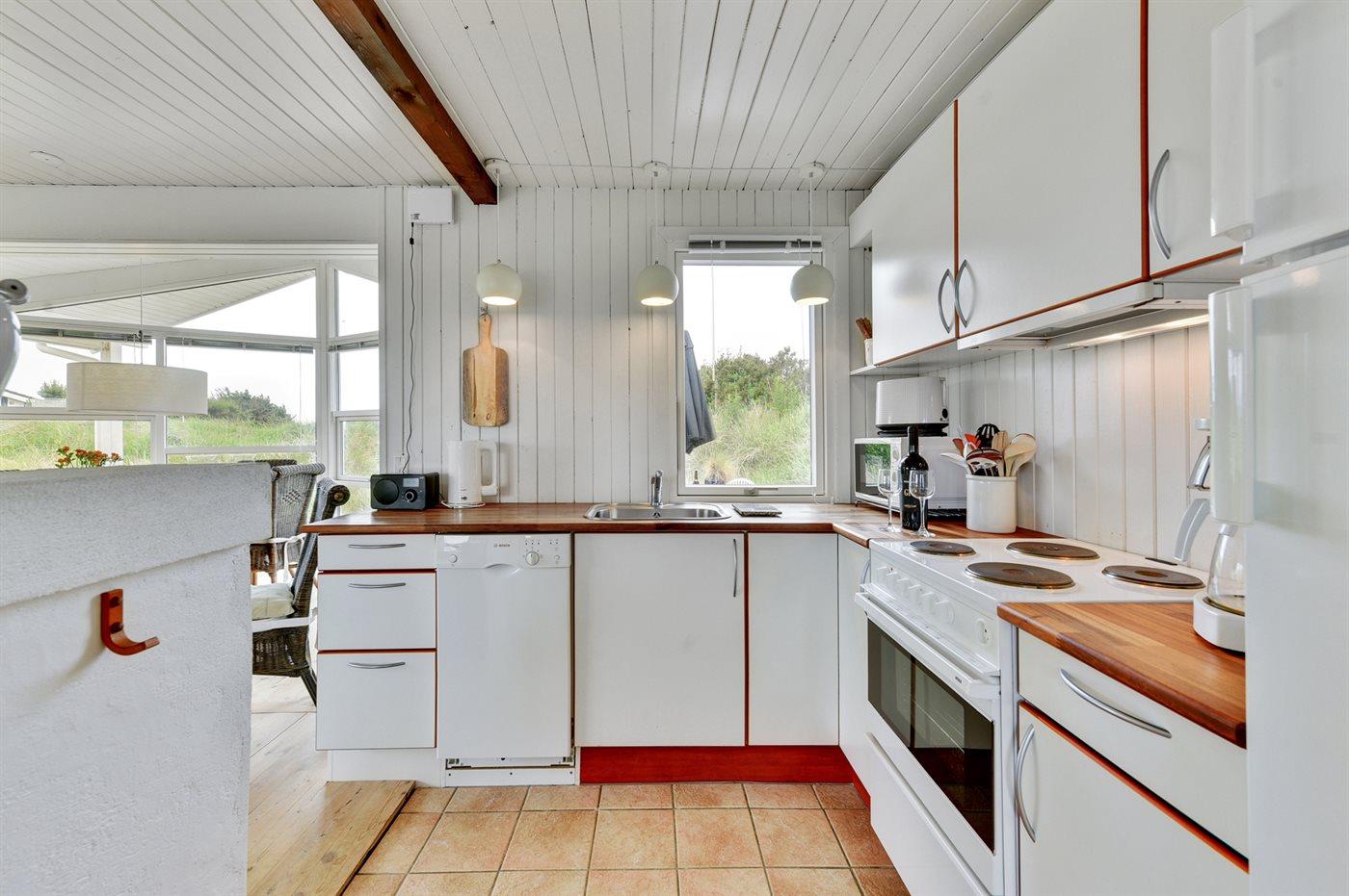 Køkkenet er udstyret med 1 køleskab. Der er 4 induktionskogeplader, varmluftovn, mikrobølgeovn samt opvaskemaskine.
