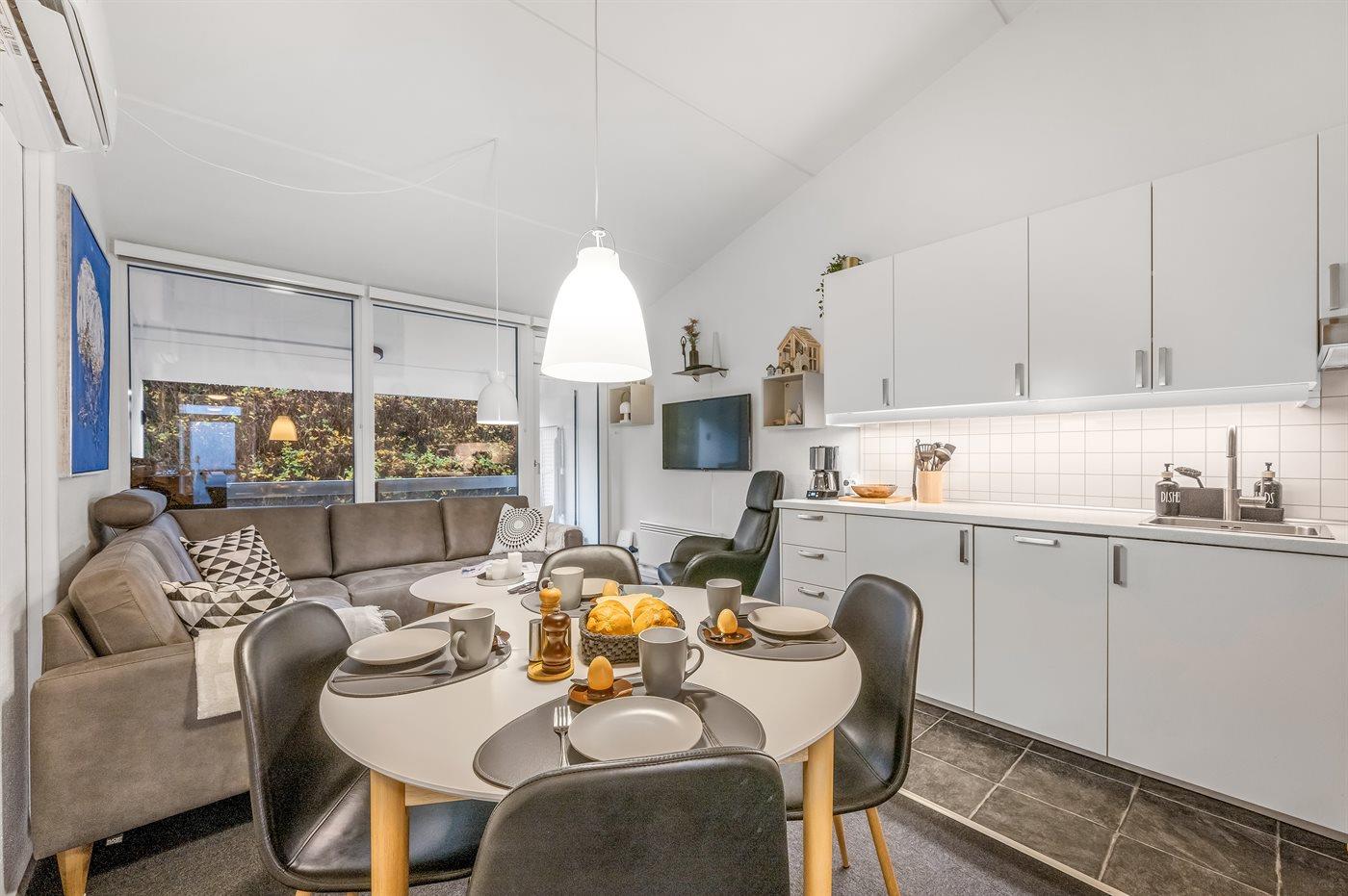 Køkkenet er udstyret med 1 køleskab. Der er 4 keramiske kogeplader, varmluftovn samt opvaskemaskine.