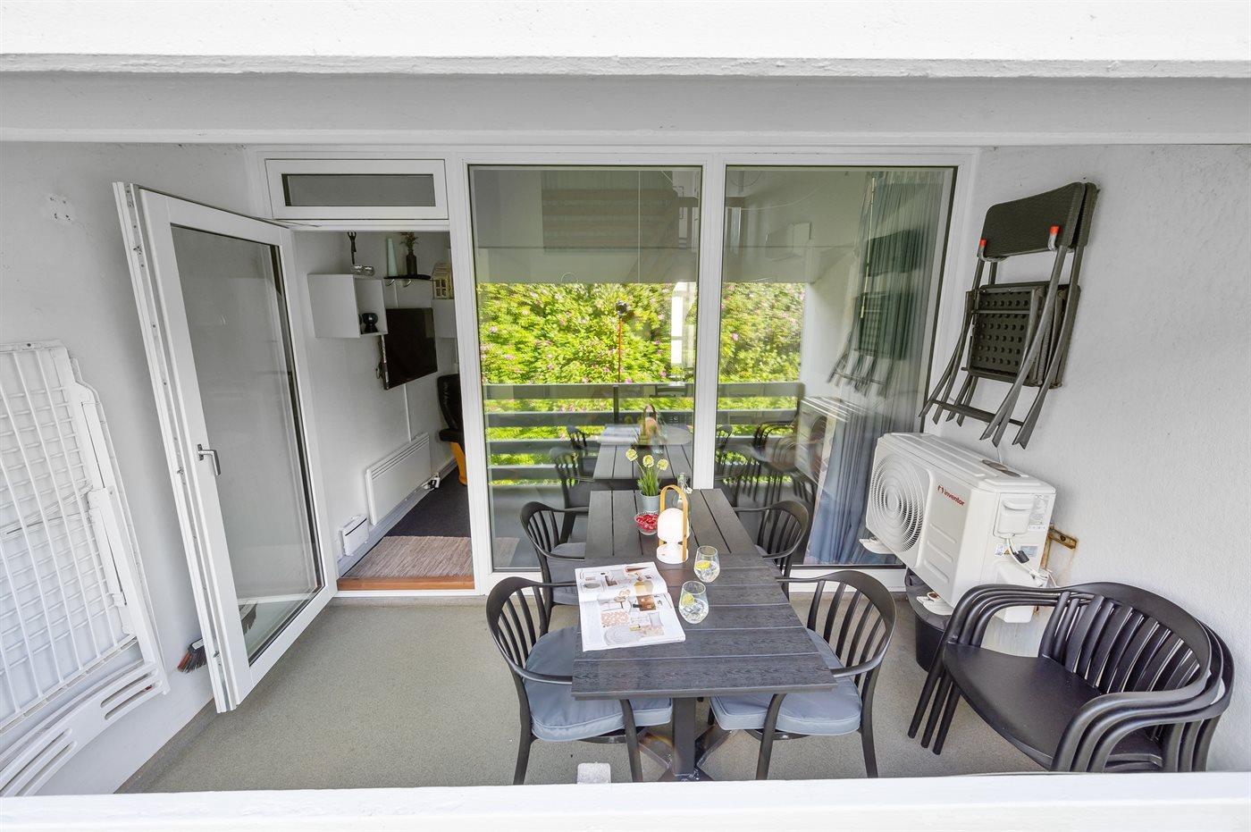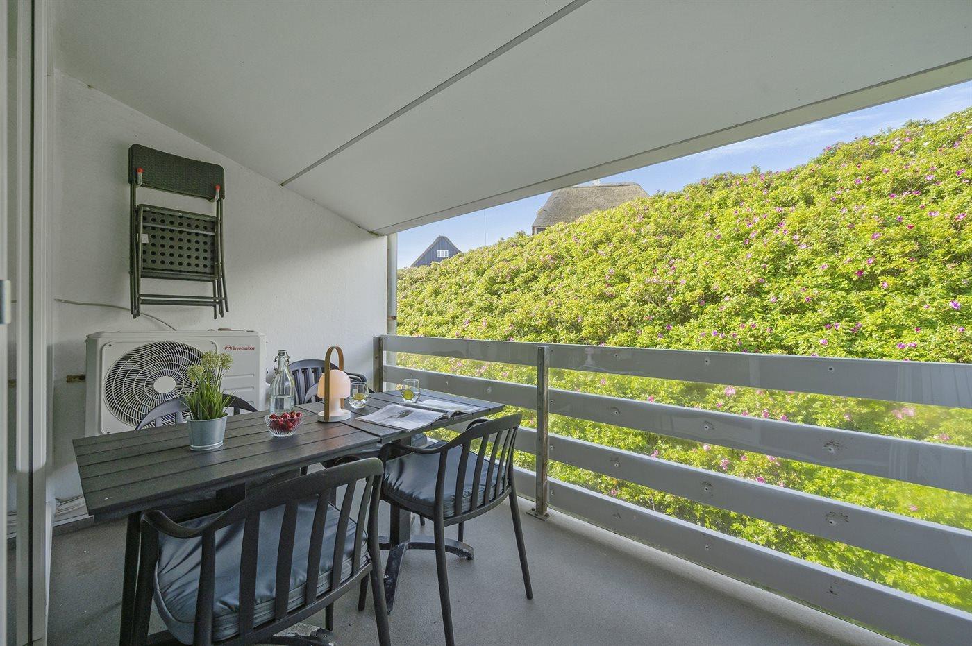 Renoveret ferielejlighed i Søndervig med ugenert altan tæt på havet og butikker.