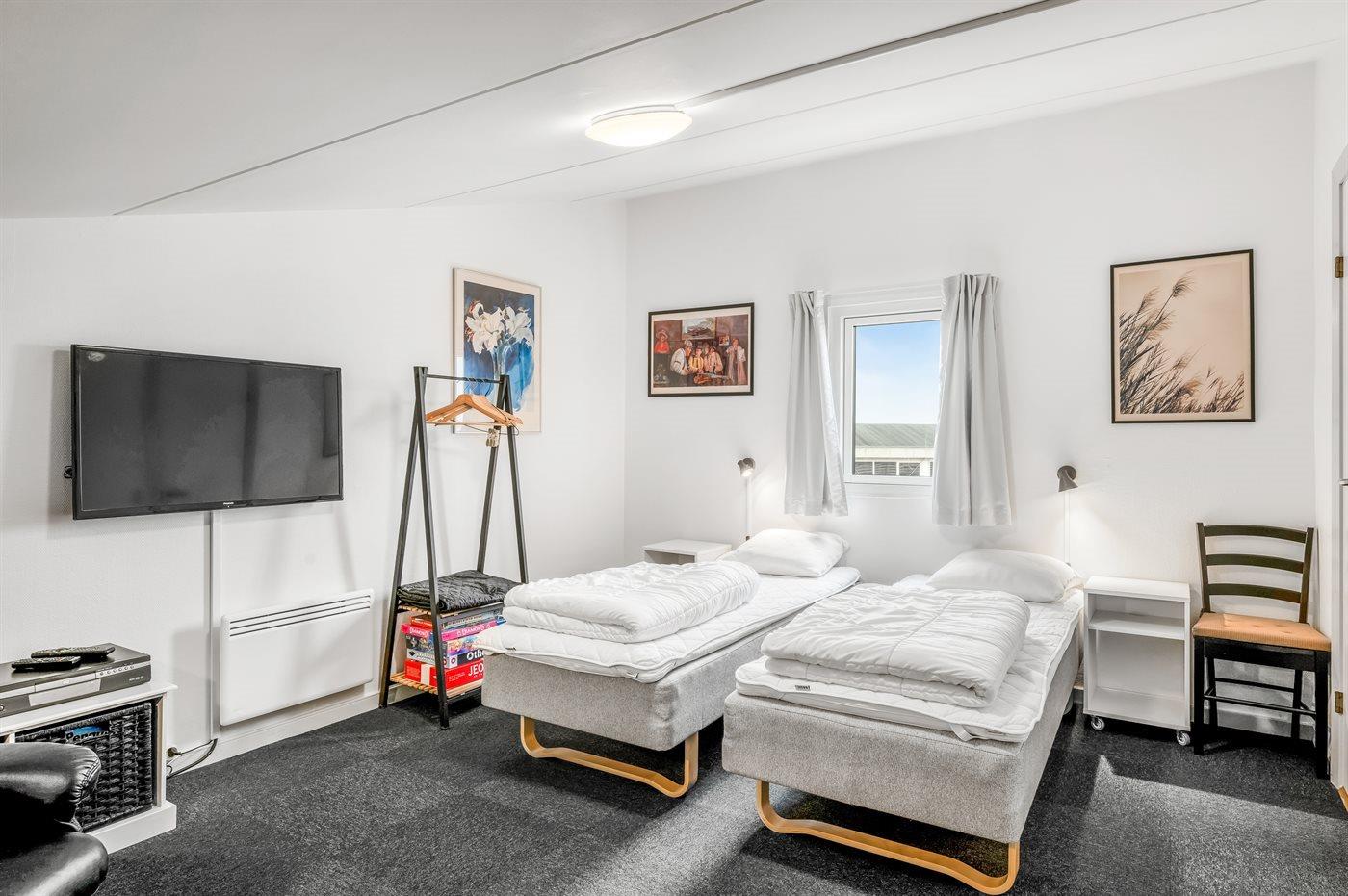 Der er i alt 2 soveværelser. Sovepladserne fordeler sig på: 4 sovepladser i dobbeltsenge. 2 sovepladser i enkeltsenge. 2 af disse sovepladser befinder sig på husets hems. Derudover er der 1 stk. barneseng.