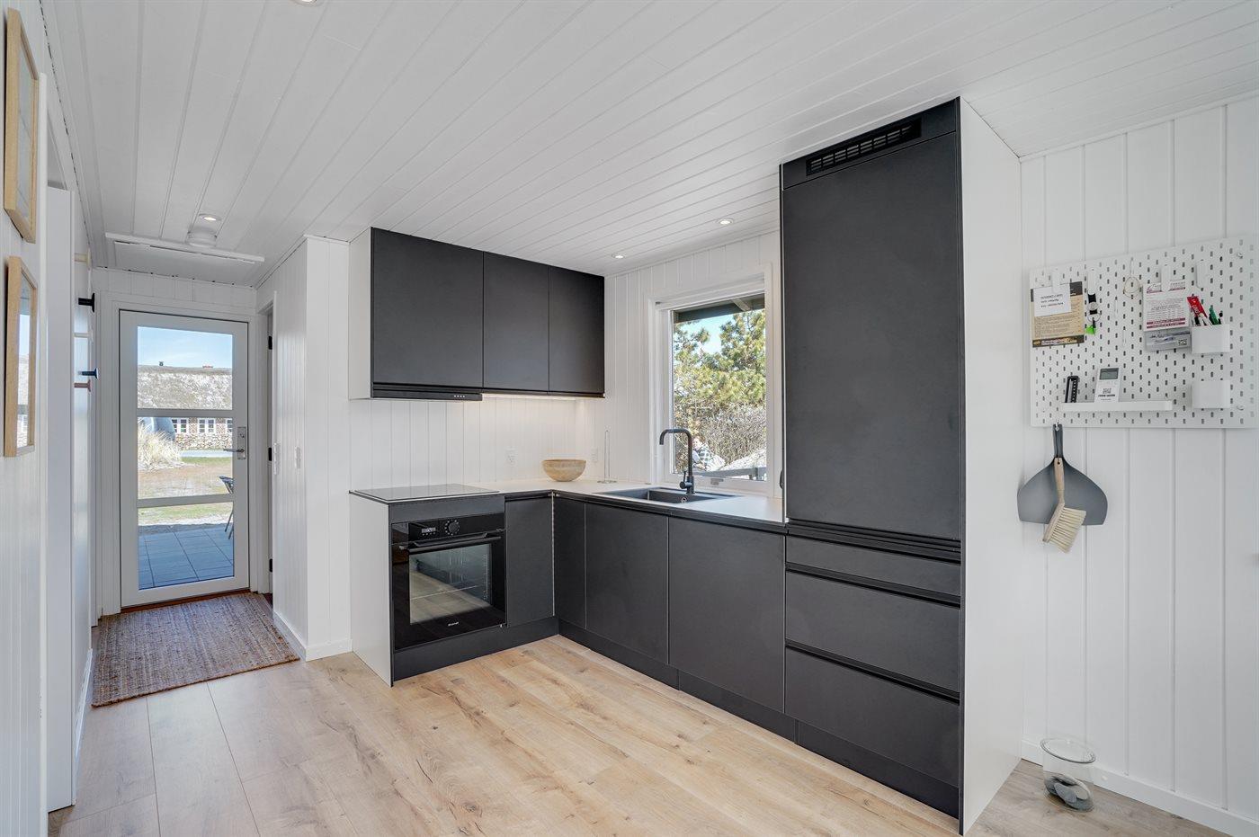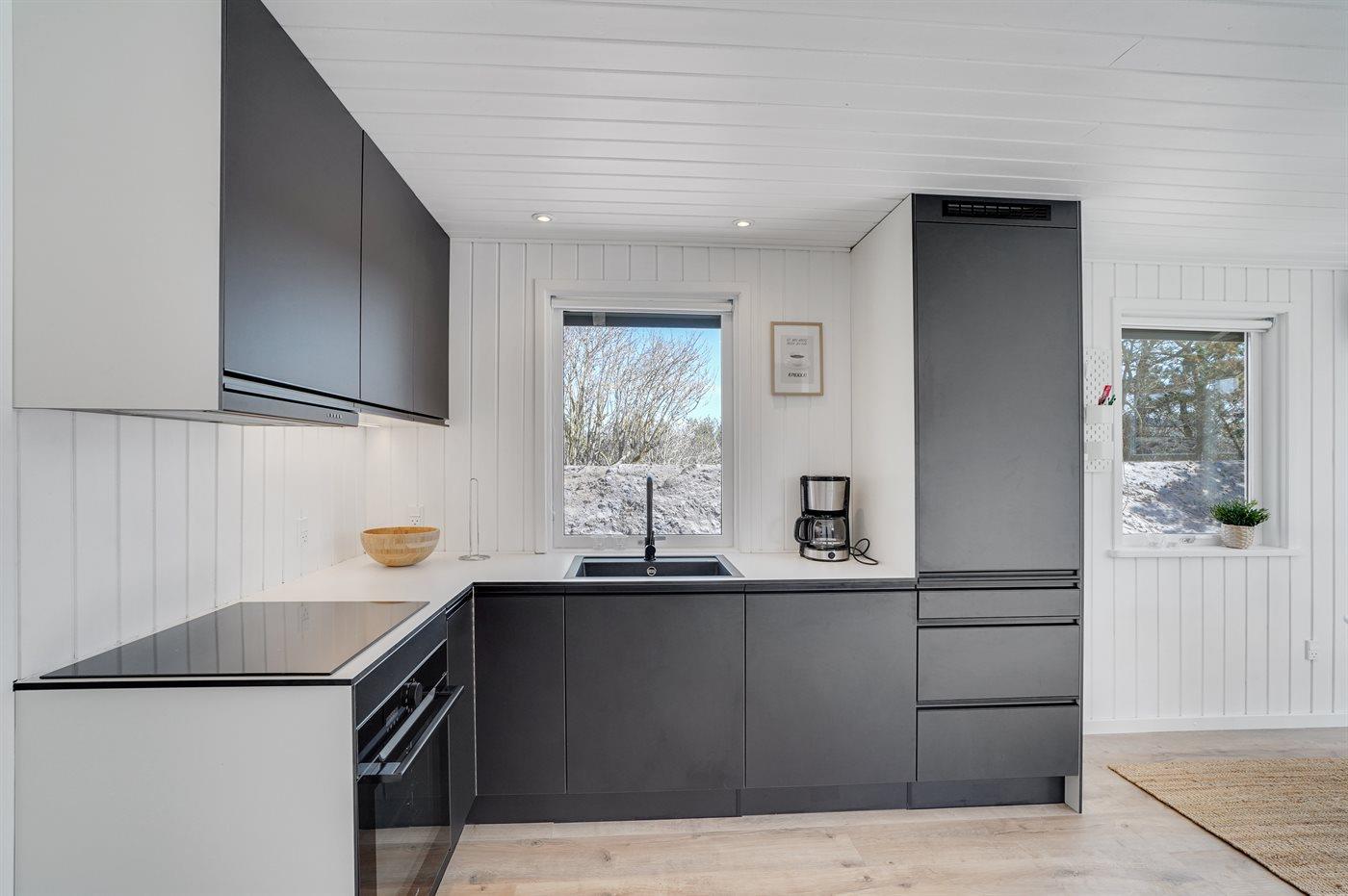 Køkkenet er udstyret med 1 køleskab. Der er 4 keramiske kogeplader, varmluftovn samt opvaskemaskine.
