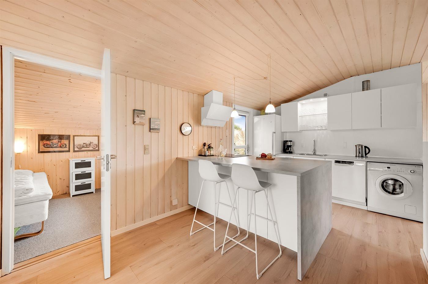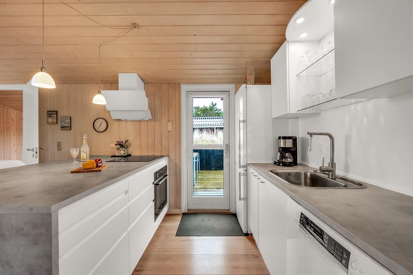 Køkkenet er udstyret med 1 køleskab. Der er 4 induktionskogeplader, varmluftovn, mikrobølgeovn samt opvaskemaskine.