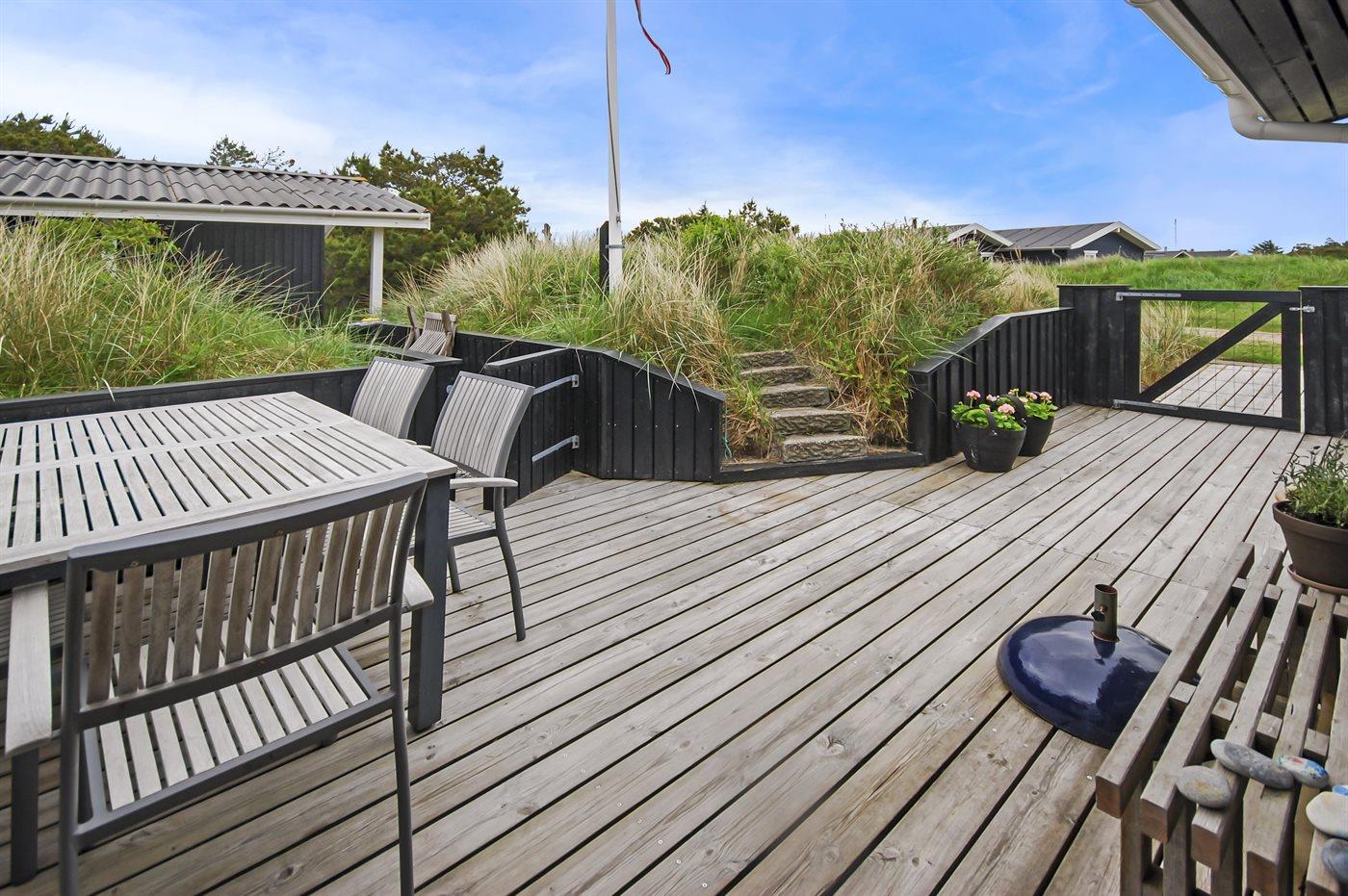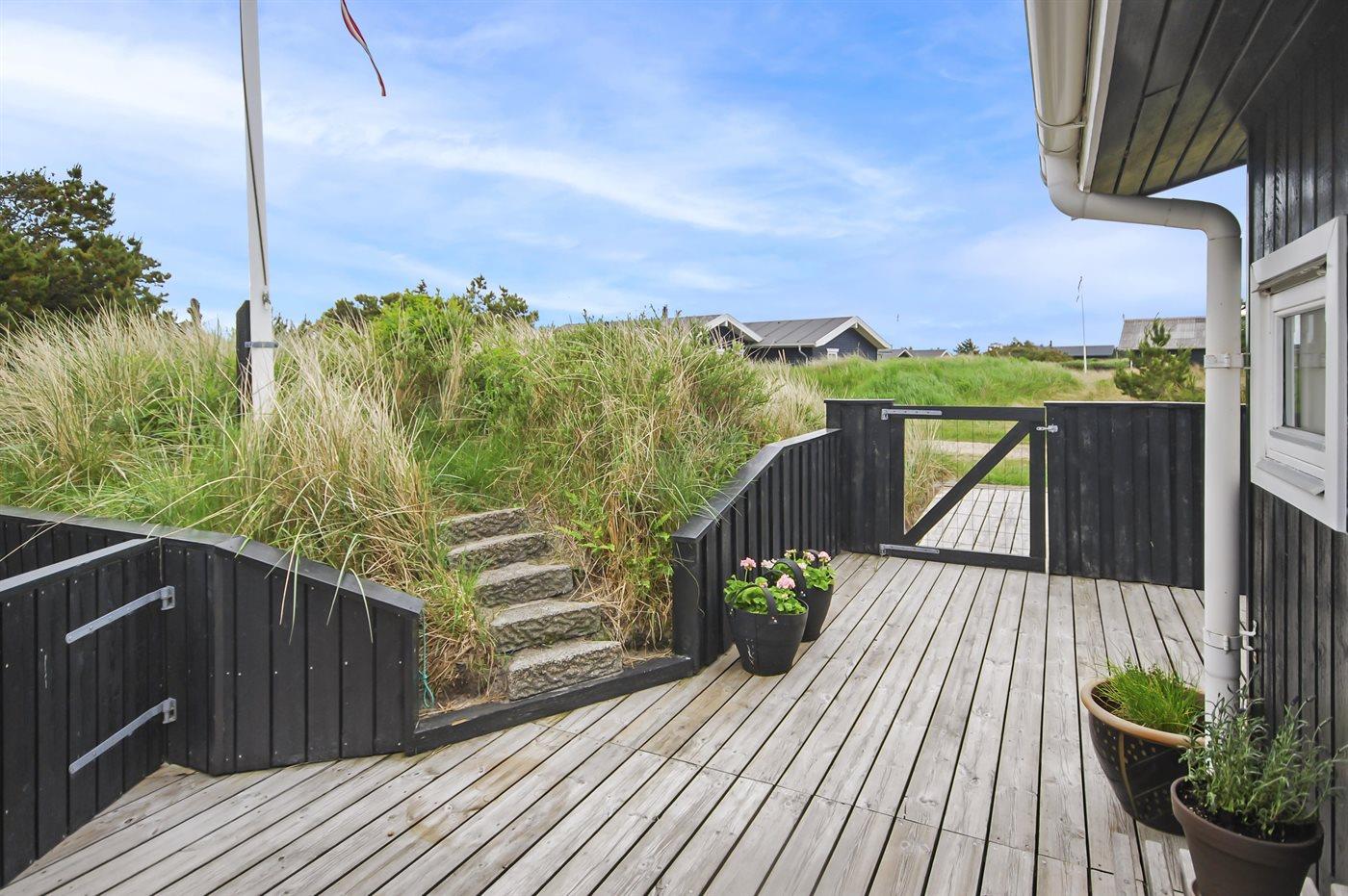 Ferieboligen er beliggende på en 1200 m² stor naturgrund. Der er 600 m til havet. Nærmeste forretning er beliggende i en afstand af 950 m. Der er en golfbane i en afstand af 1500 m. Til ferieboligen hører lukket terrasse. Til ferieboligen hører et til dels lukket terrasseareal. Sandkasse. Udendørs sauna. Parkering ved ferieboligen.