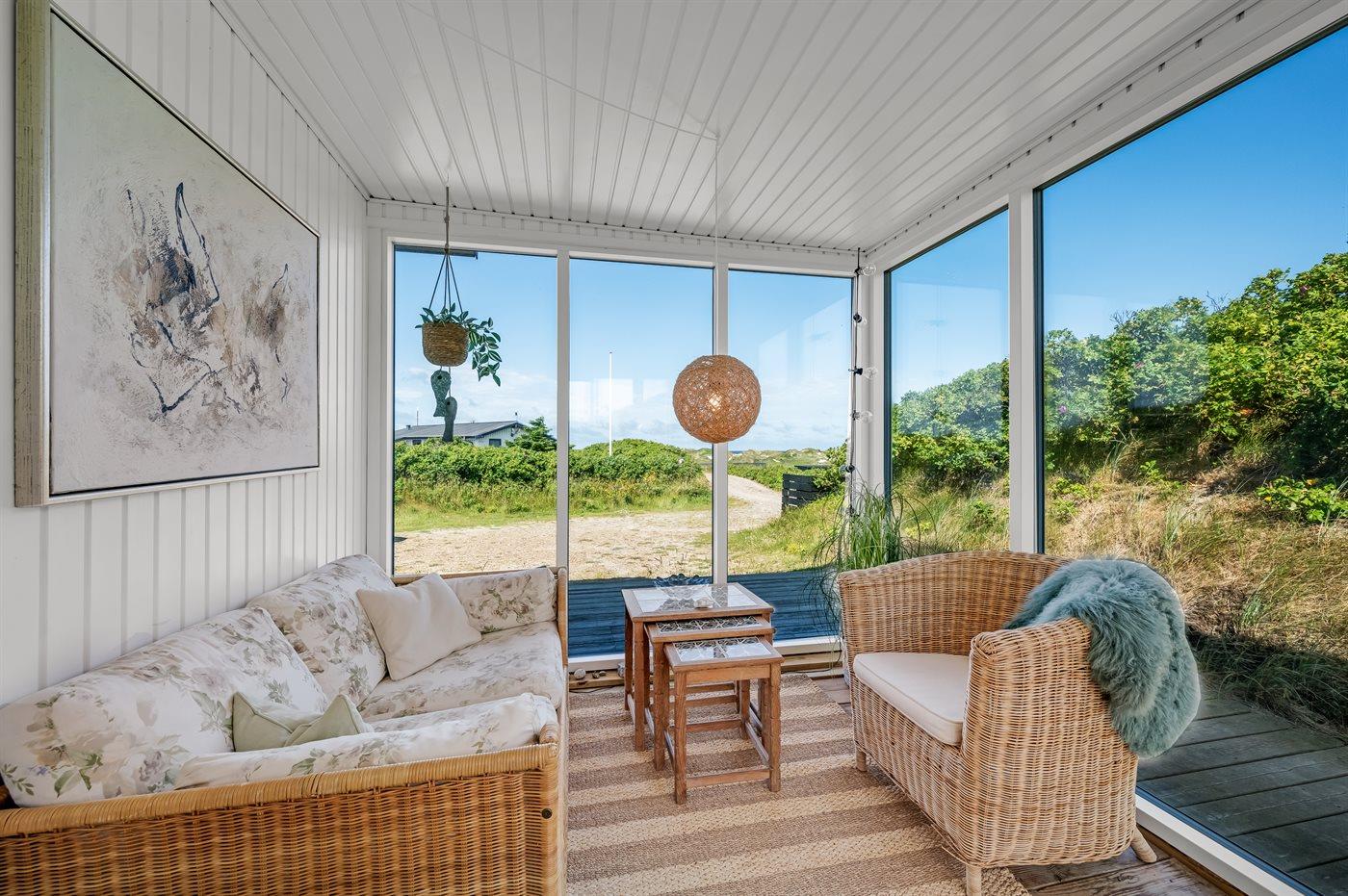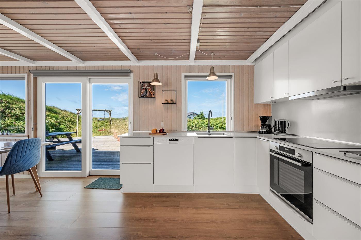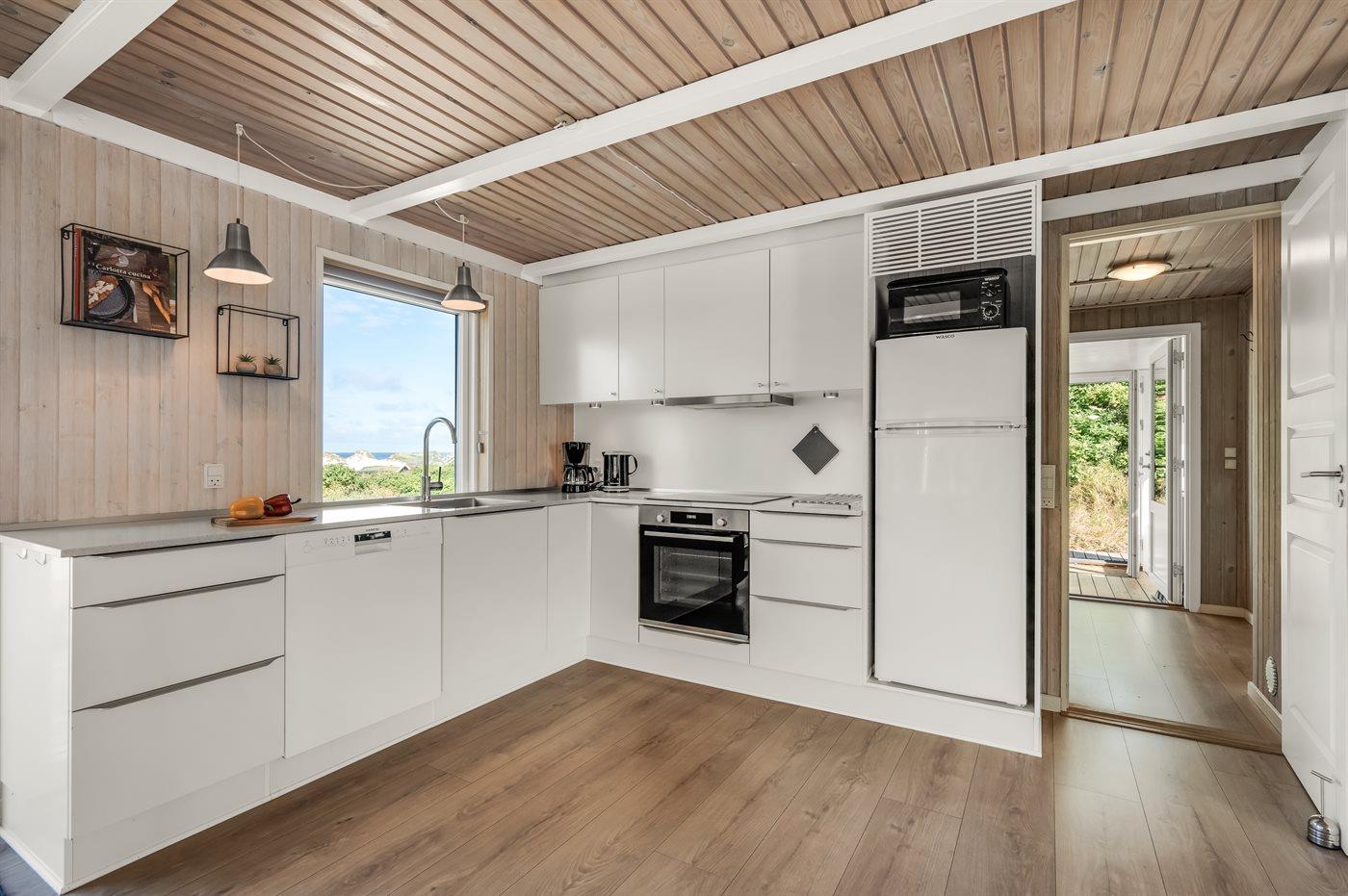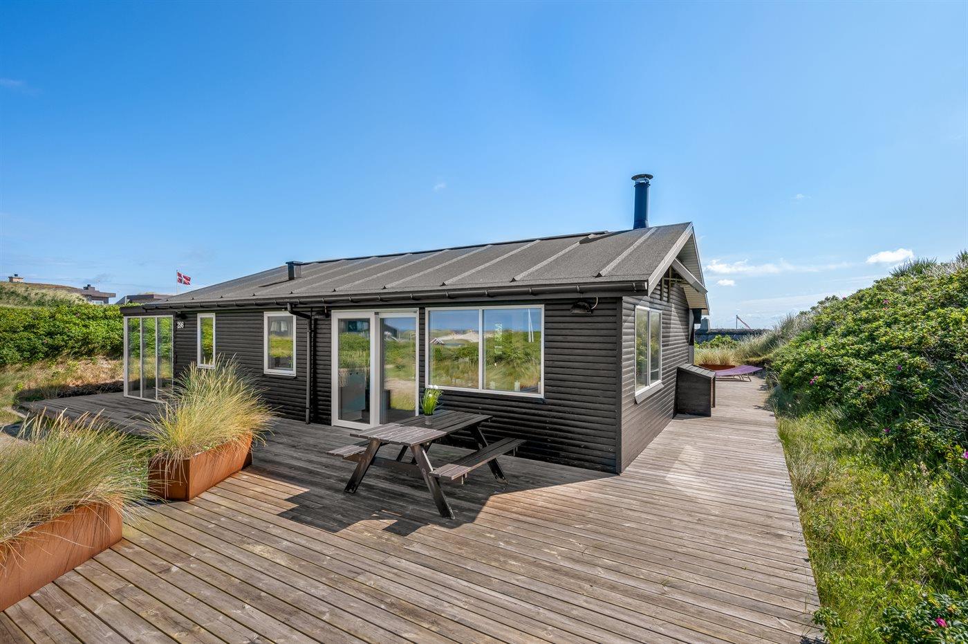 Sommerhus, løbende renoveret, med en virkelig attraktiv beliggenhed. Huset ligger højt på en kuperet grund mellem hav og fjord, hvor der fra stuen og køkkenet er en fantastisk udsigt over Vesterhavet, og fra østsiden af huset udsigt over Ringkøbing Fjord. Huset har en sydvendt terrasse, som ligger i læ af klitterne. Huset har i 2014 moderniseret badeværelse med adgang til infrarød sauna.