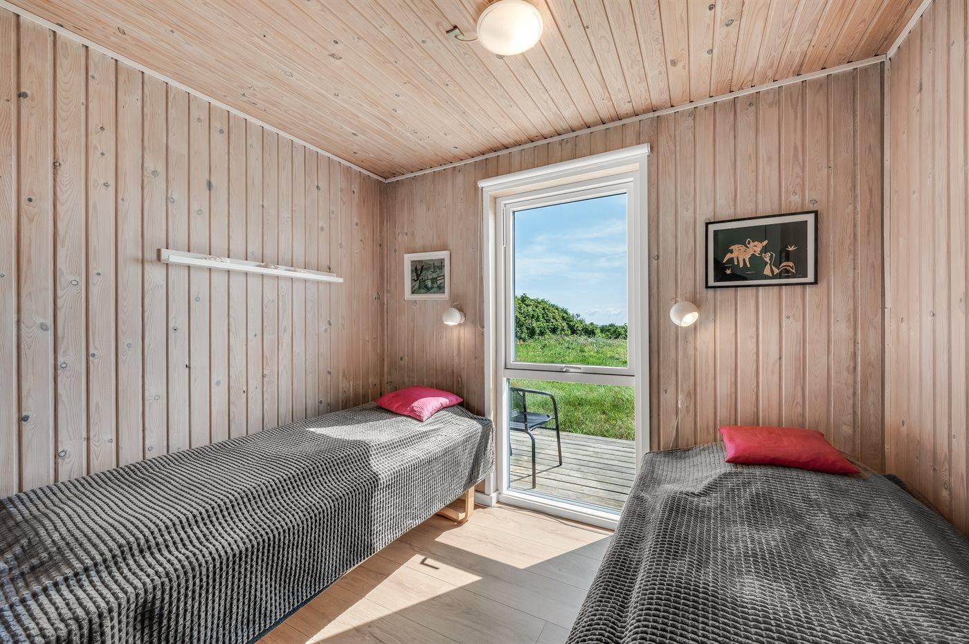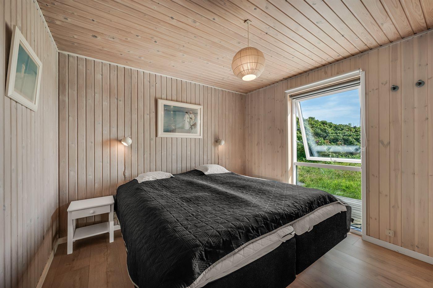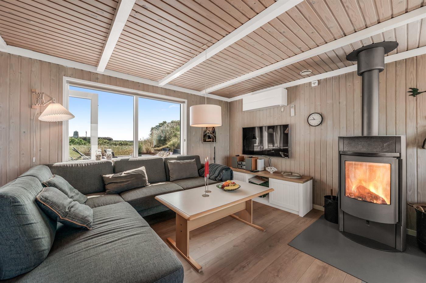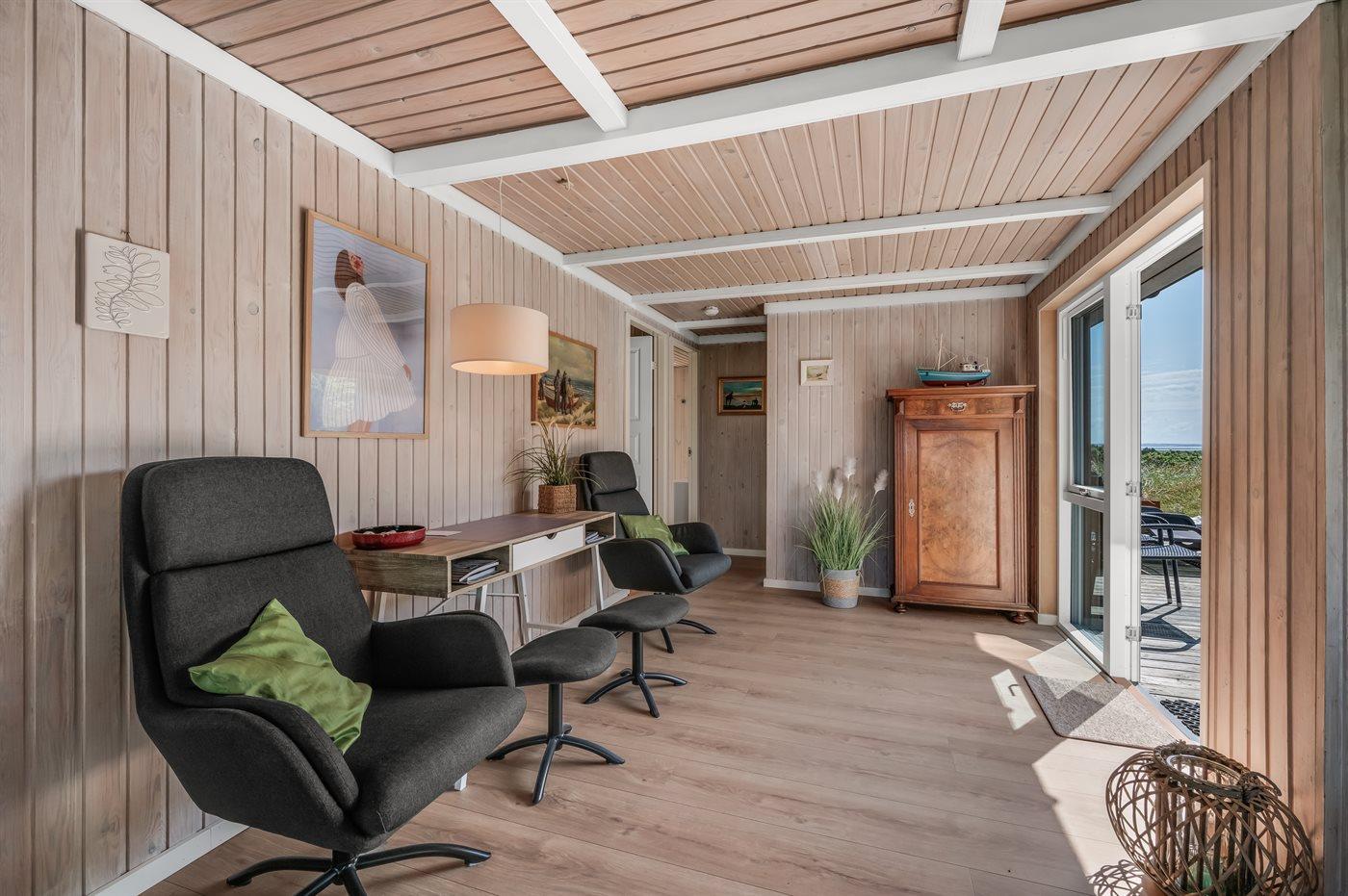 Sommerhus, løbende renoveret, med en virkelig attraktiv beliggenhed. Huset ligger højt på en kuperet grund mellem hav og fjord, hvor der fra stuen og køkkenet er en fantastisk udsigt over Vesterhavet, og fra østsiden af huset udsigt over Ringkøbing Fjord. Huset har en sydvendt terrasse, som ligger i læ af klitterne. Huset har i 2014 moderniseret badeværelse med adgang til infrarød sauna.