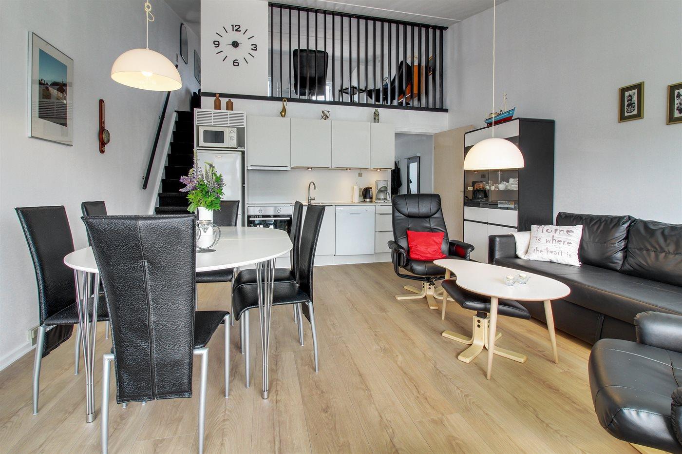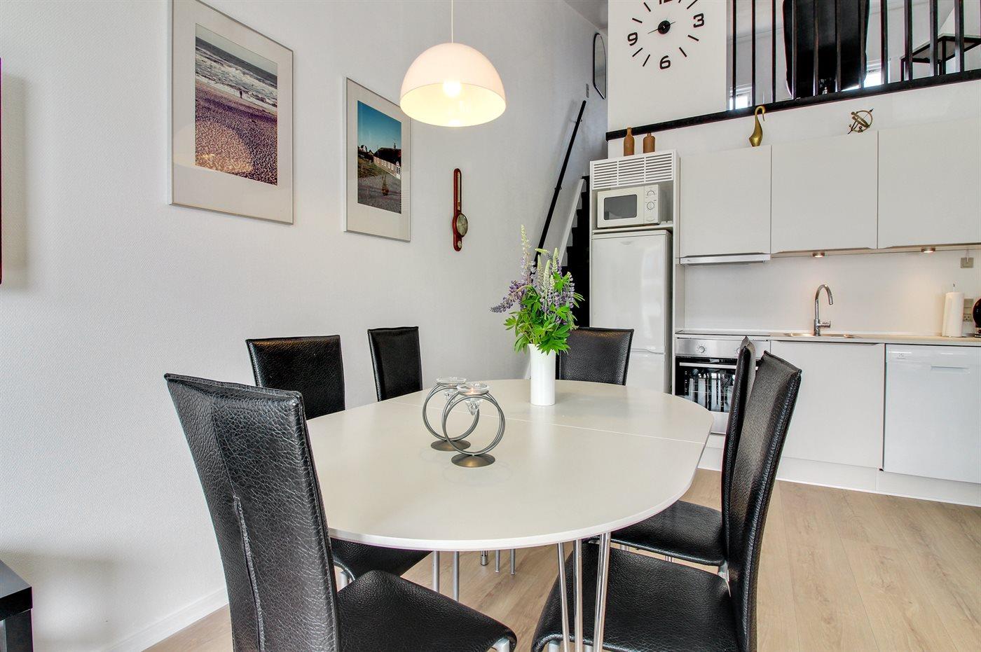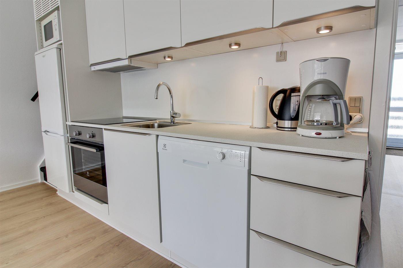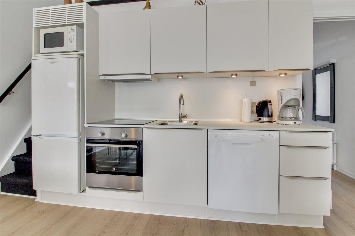 Køkkenet er udstyret med 1 køleskab. Der er 4 keramiske kogeplader, varmluftovn, mikrobølgeovn samt opvaskemaskine.